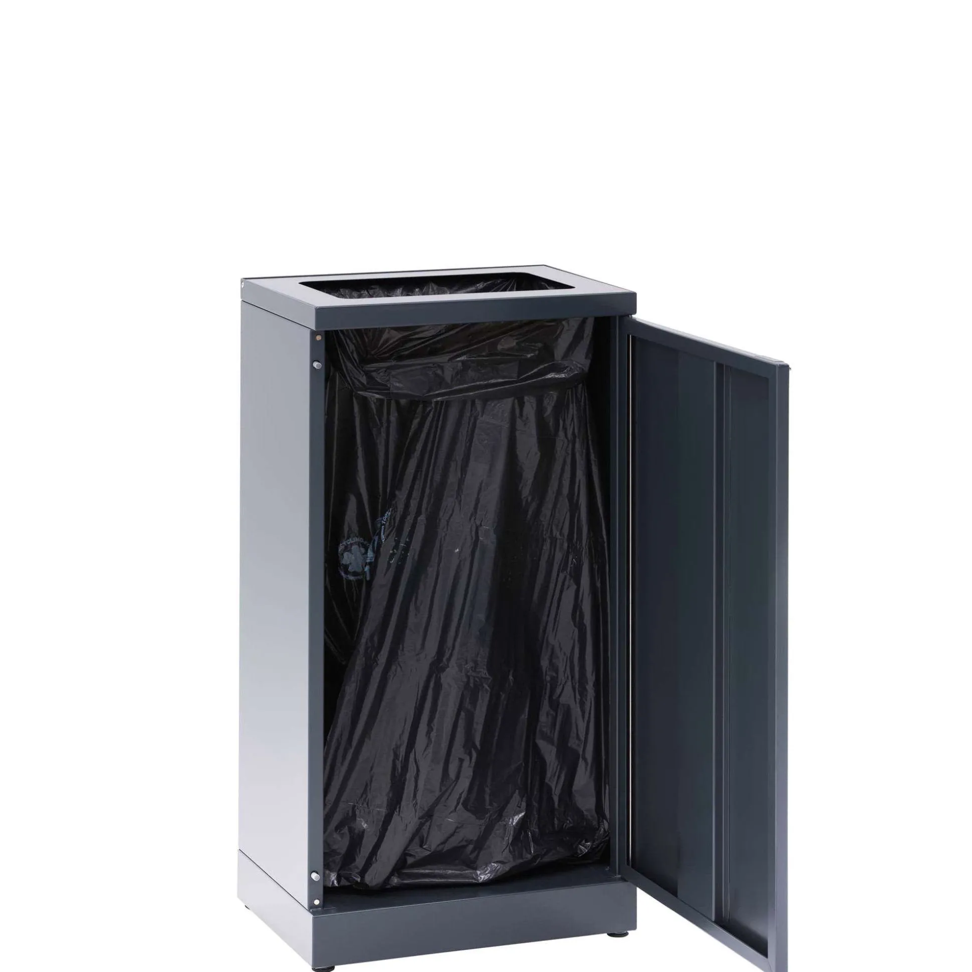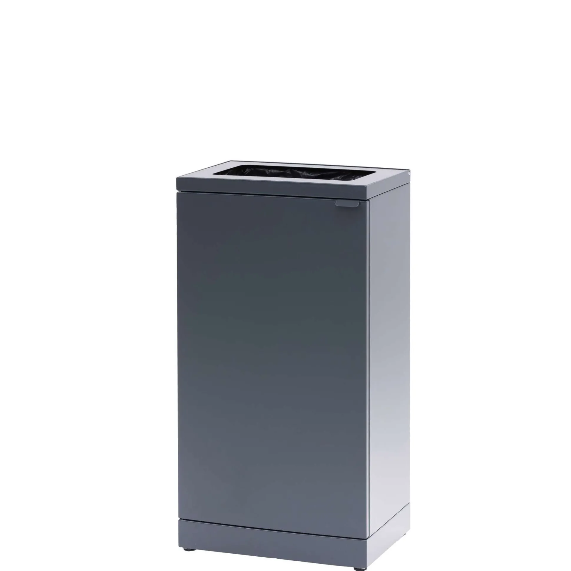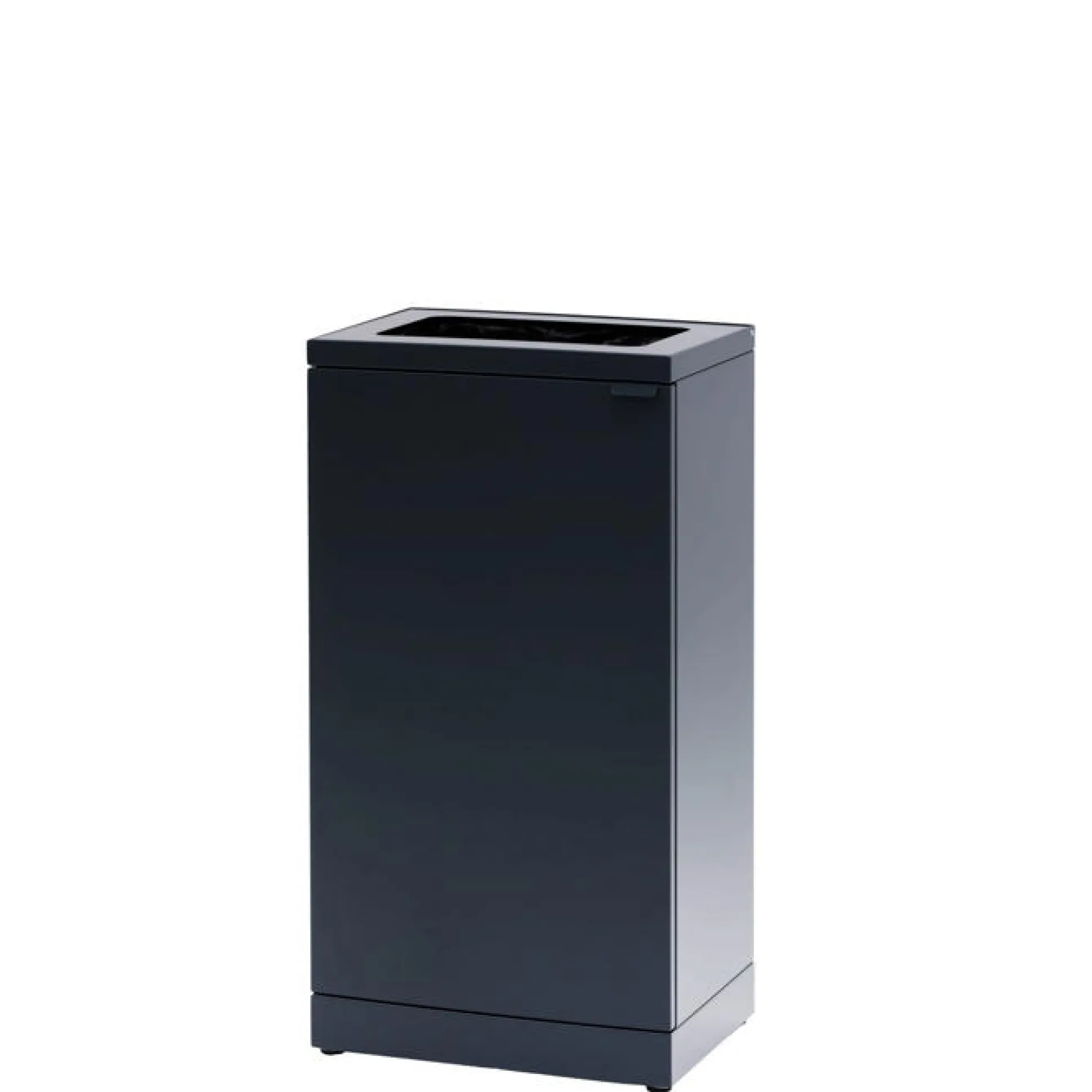 Denne affaldsbeholder til kildesortering er med rektangulært indkast. Låget har soft close og der er integreret poseholder. Beholderen i pulverlakeret stål har en kapacitet på 95 liter og måler 42,5x30x84,5h cm. En elegant løsning til kontoret/kantinen.