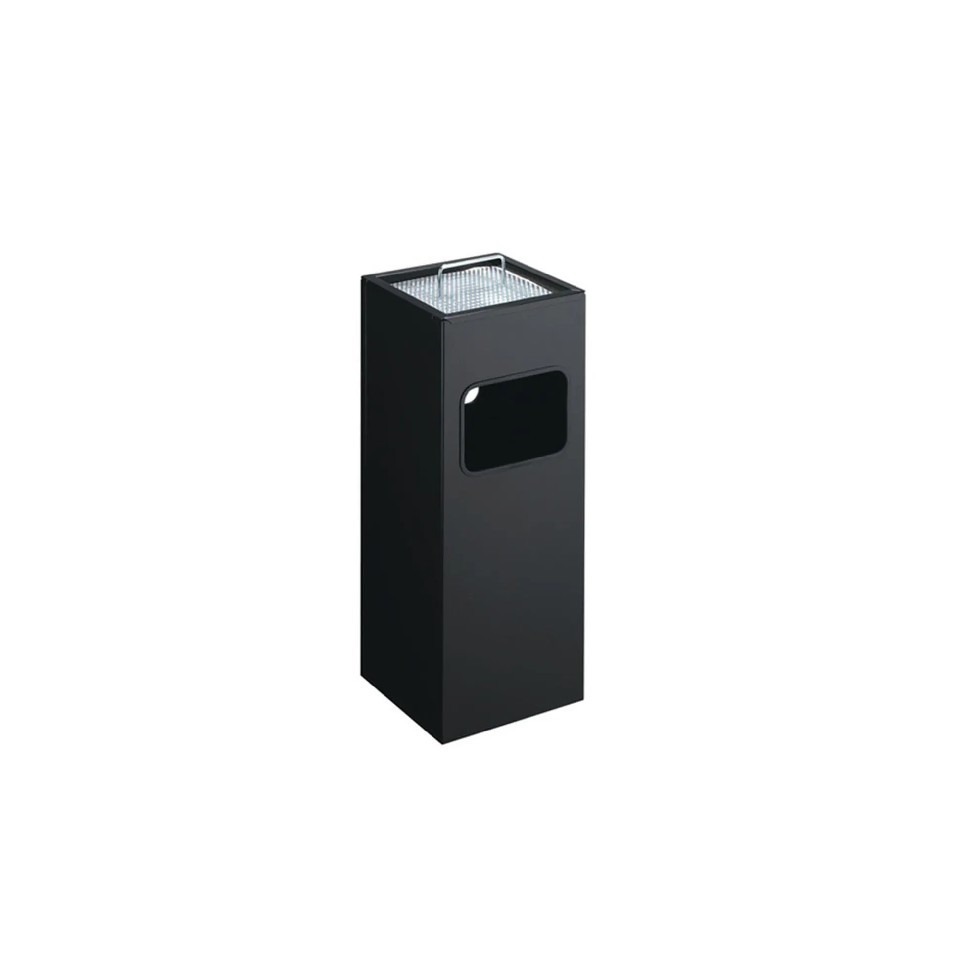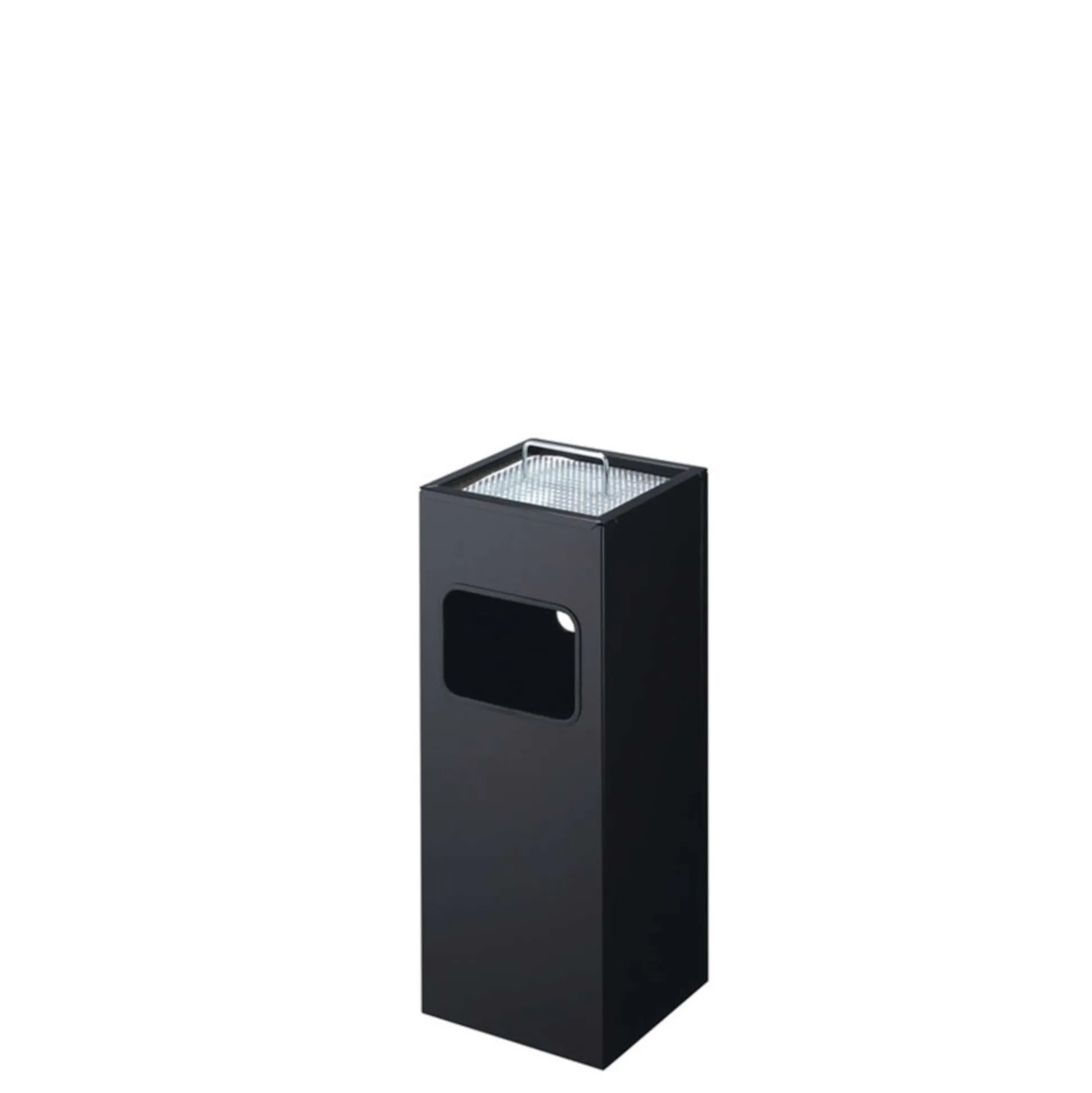 Affaldsbeholder i stilrent design, udført i sort metal. 17 liter spand med 2 liter askebæger. Højde: 62 cm. Bredde/dybde: 26 cm. Åbning i 2 sider. Egnet til indendørs og udendørs brug. Indvendig beholder og askebæger kan tages ud, for nem rengøring. 1,5 kg. sand til askebægeret medfølger.