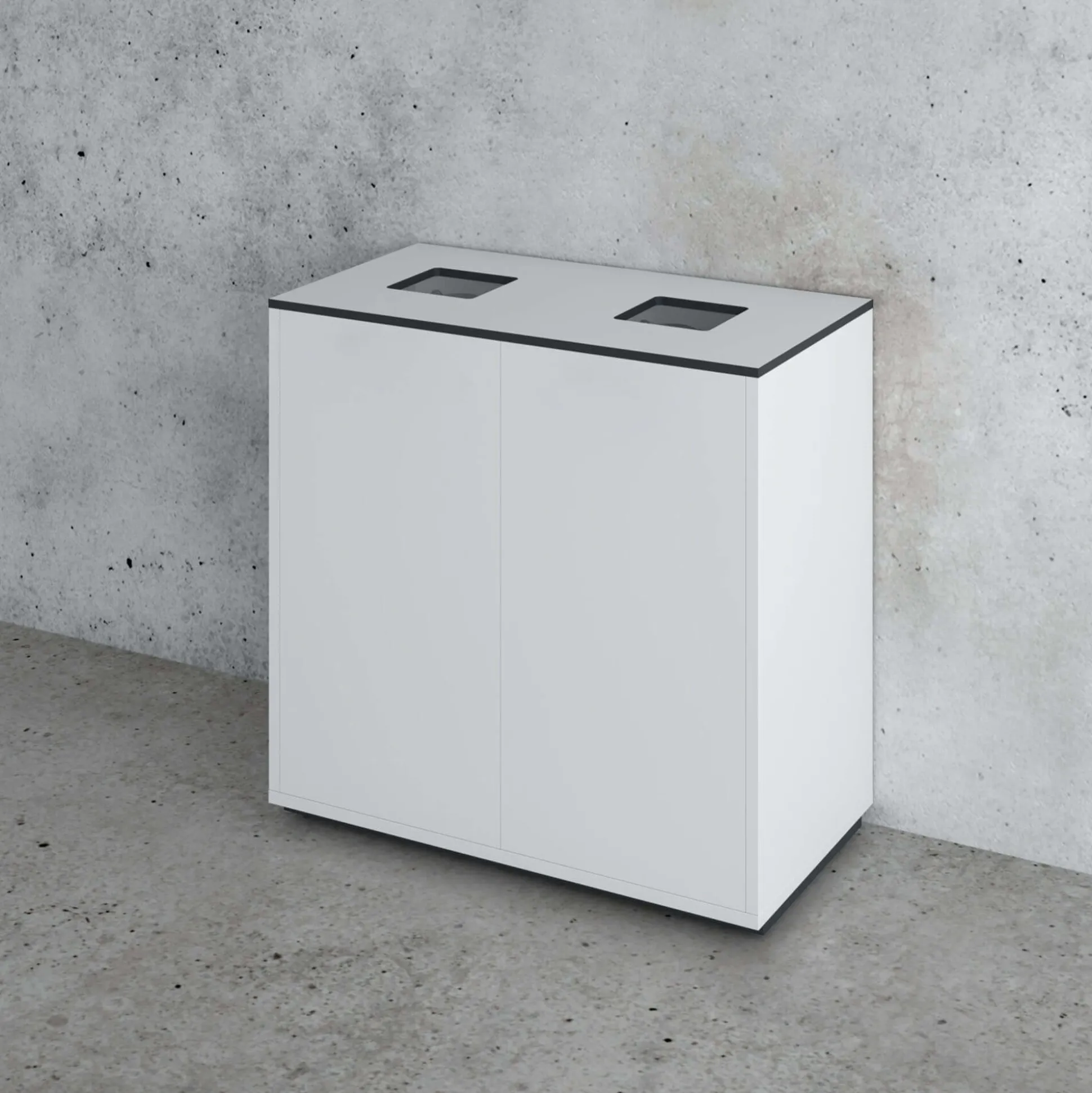 Smart og enkel affaldsstation i decor laminat af høj kvalitet til 2 fraktioner. Lågerne er med push-lock og uden greb, hvilket giver et stilrent og minimalistisk look – perfekt til kontoret eller kantinen. Stationen har i alt 4 rum, hvilket er praktisk til bl.a. opbevaring af affaldsposer.