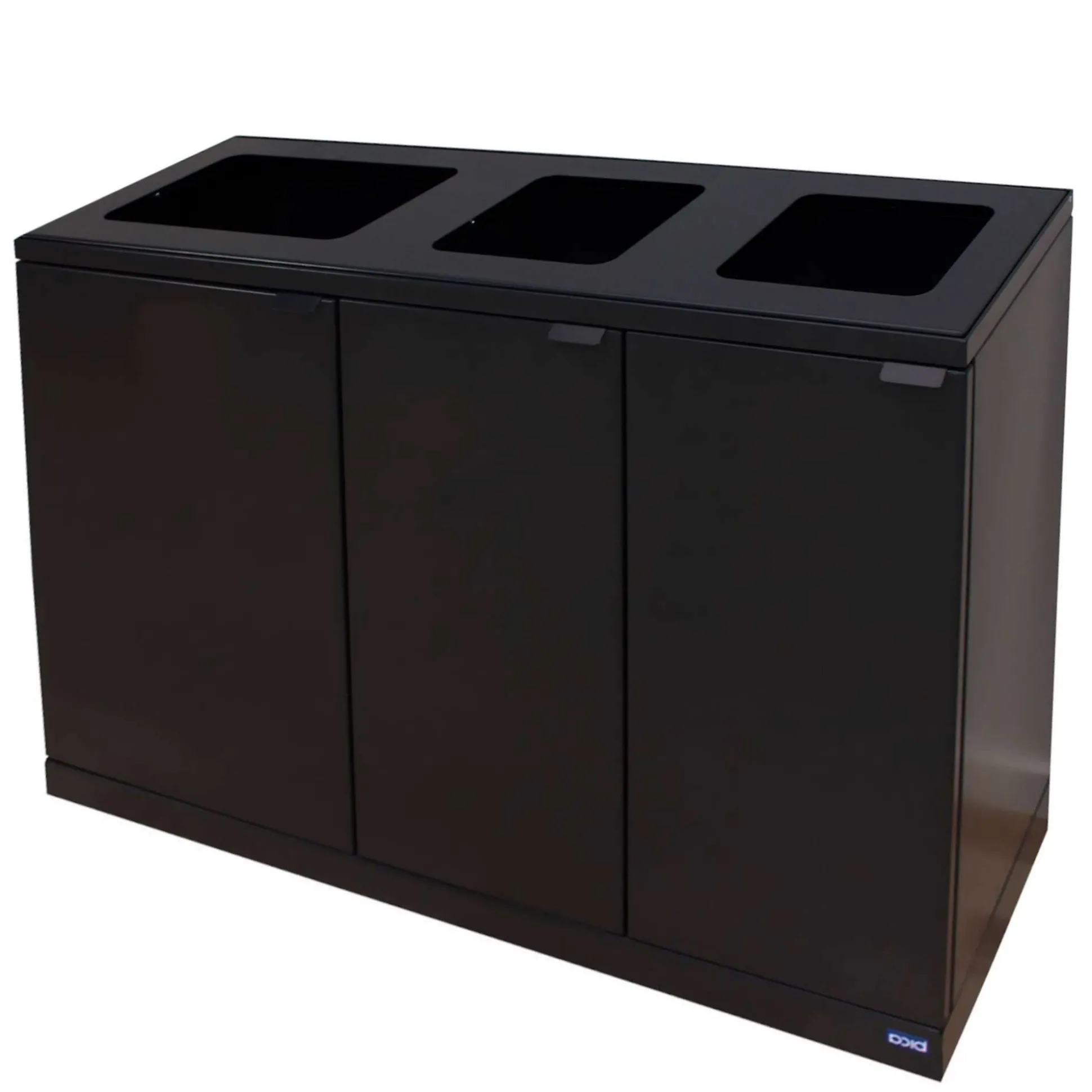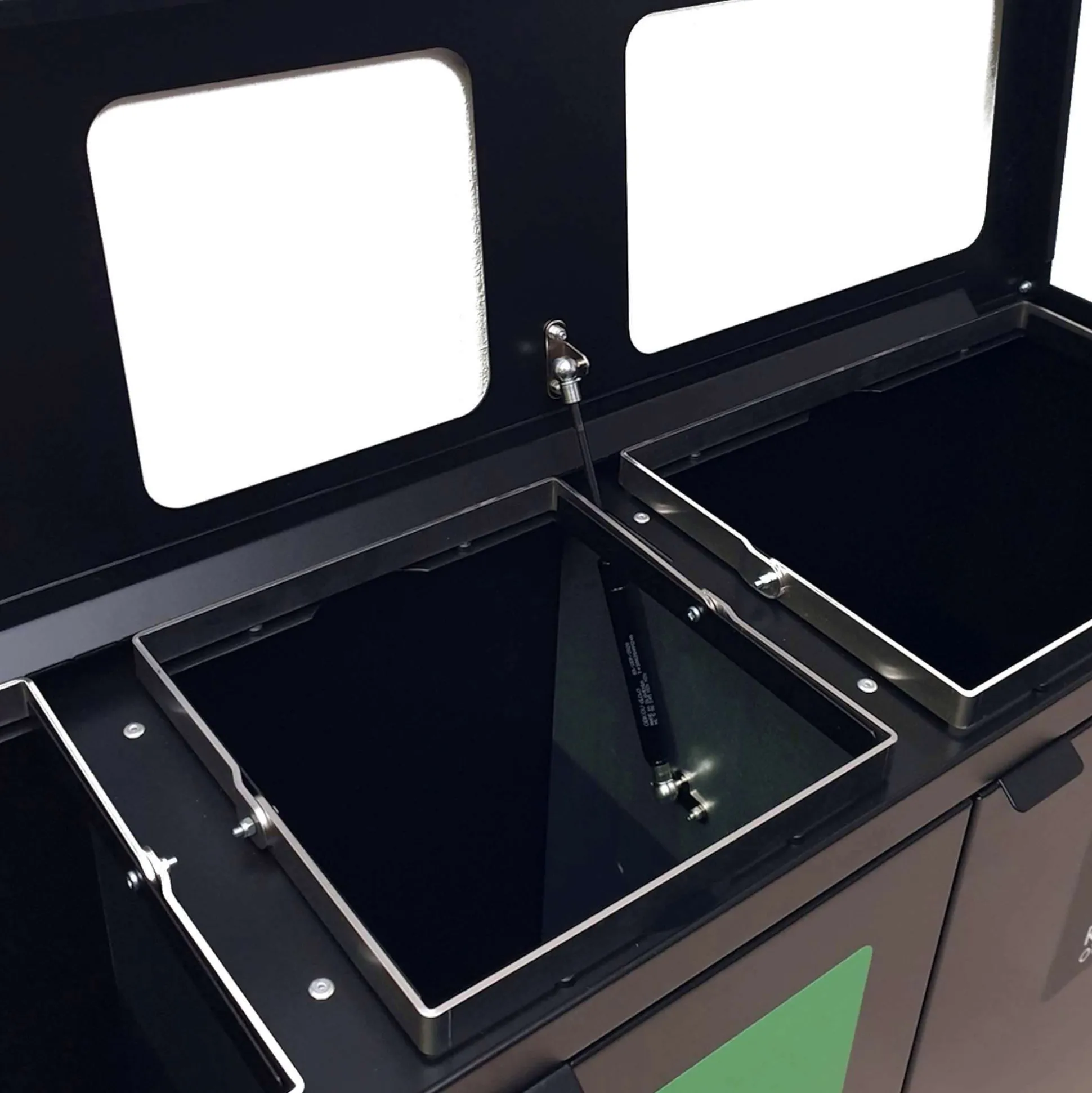 Denne affaldsstation har 3 beholdere. 2 med kvadratisk indkast og 1 rektangulært. Låget har soft close og der er integreret poseholder. Beholderen i pulverlakeret stål har en kapacitet på 2 x 65 liter + 1 x 95 liter og måler 99,5x30x84,5h cm. Leveres med hjul.