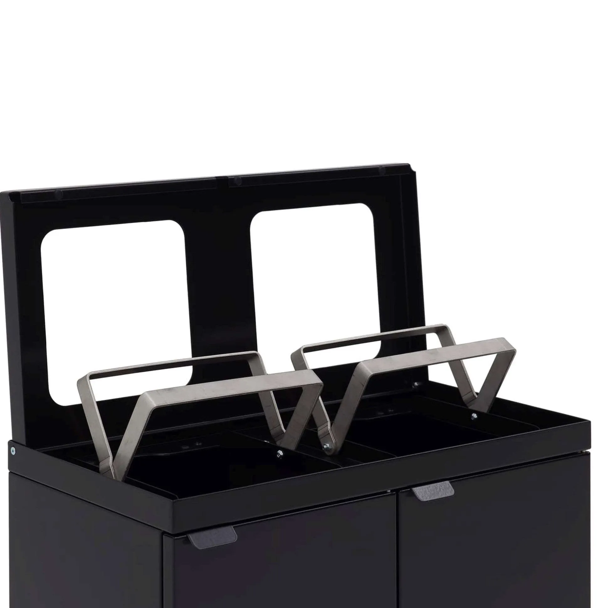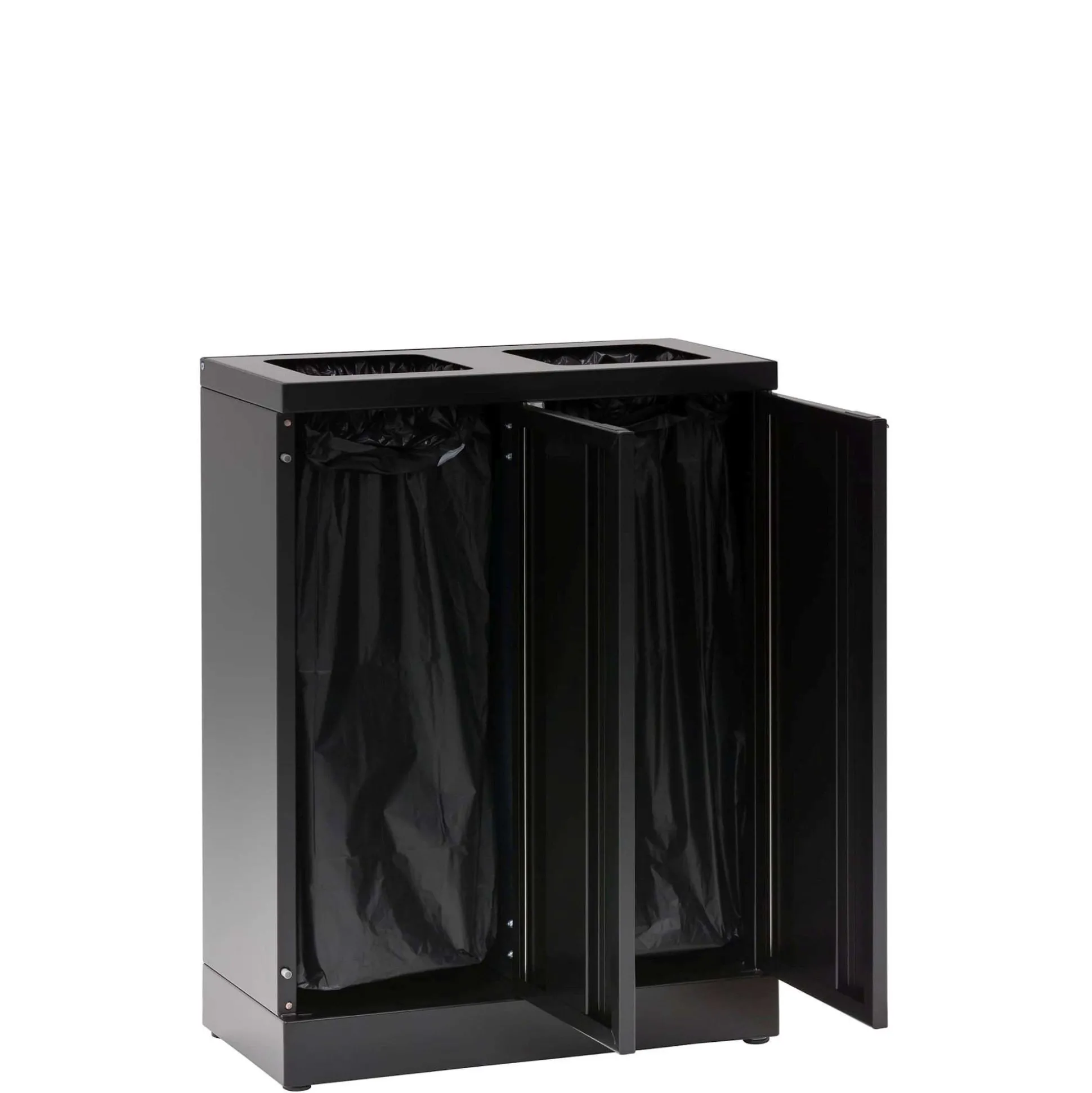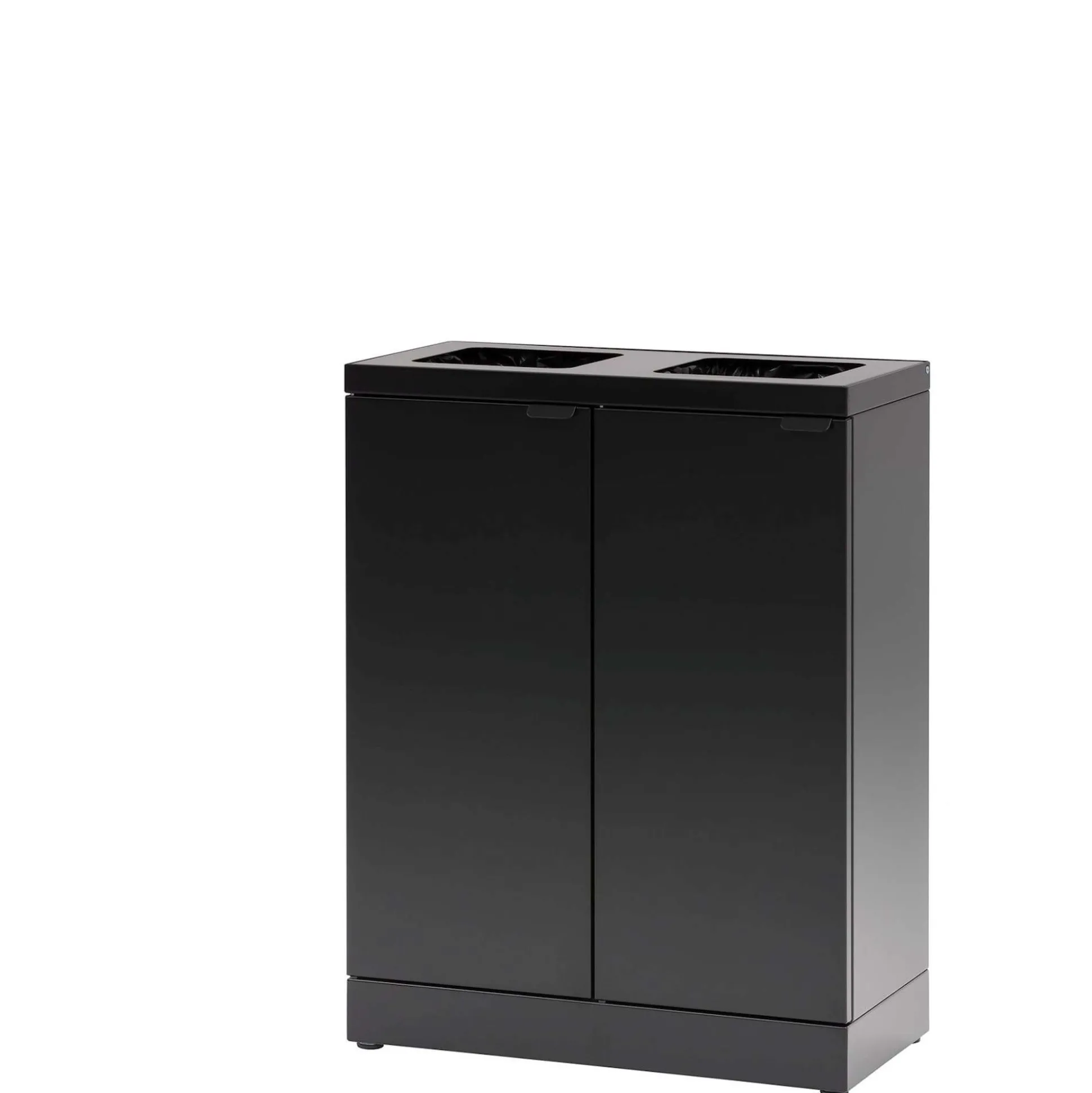 Denne affaldsstation til kildesortering har 2 kvadratiske indkast. Låget har soft close og der er integreret poseholder. Beholderen i pulverlakeret stål har en kapacitet på 2 x 45 liter og måler 53×26,5x71h cm. En elegant løsning til kontoret/kantinen.