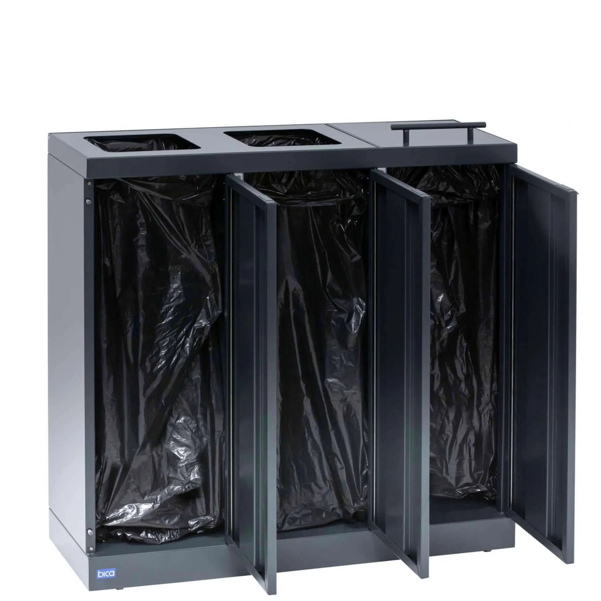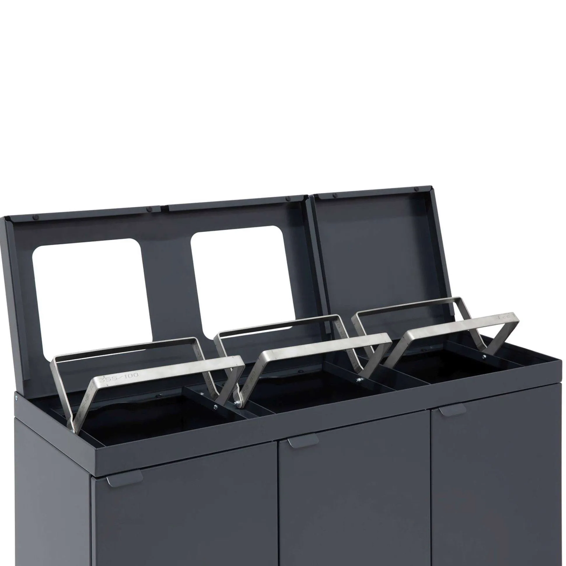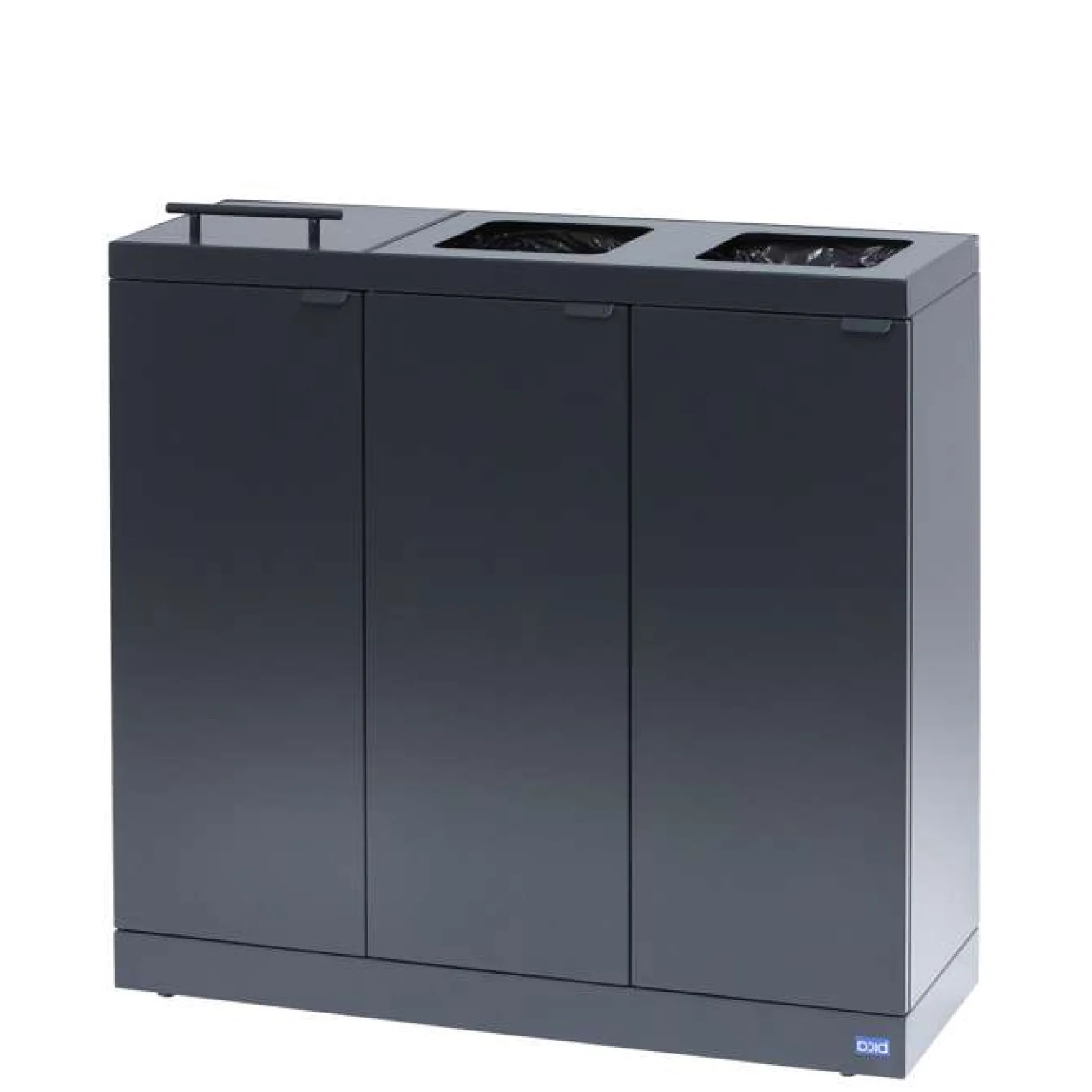 Denne affaldsstation har 3 beholdere. To med kvadratisk indkast samt en beholder med låg. Låget har soft close og der er integreret poseholder. Beholderen i pulverlakeret stål har en kapacitet på 3 x 65 liter og måler 87x30x84,5 cm. Leveres med hjul.