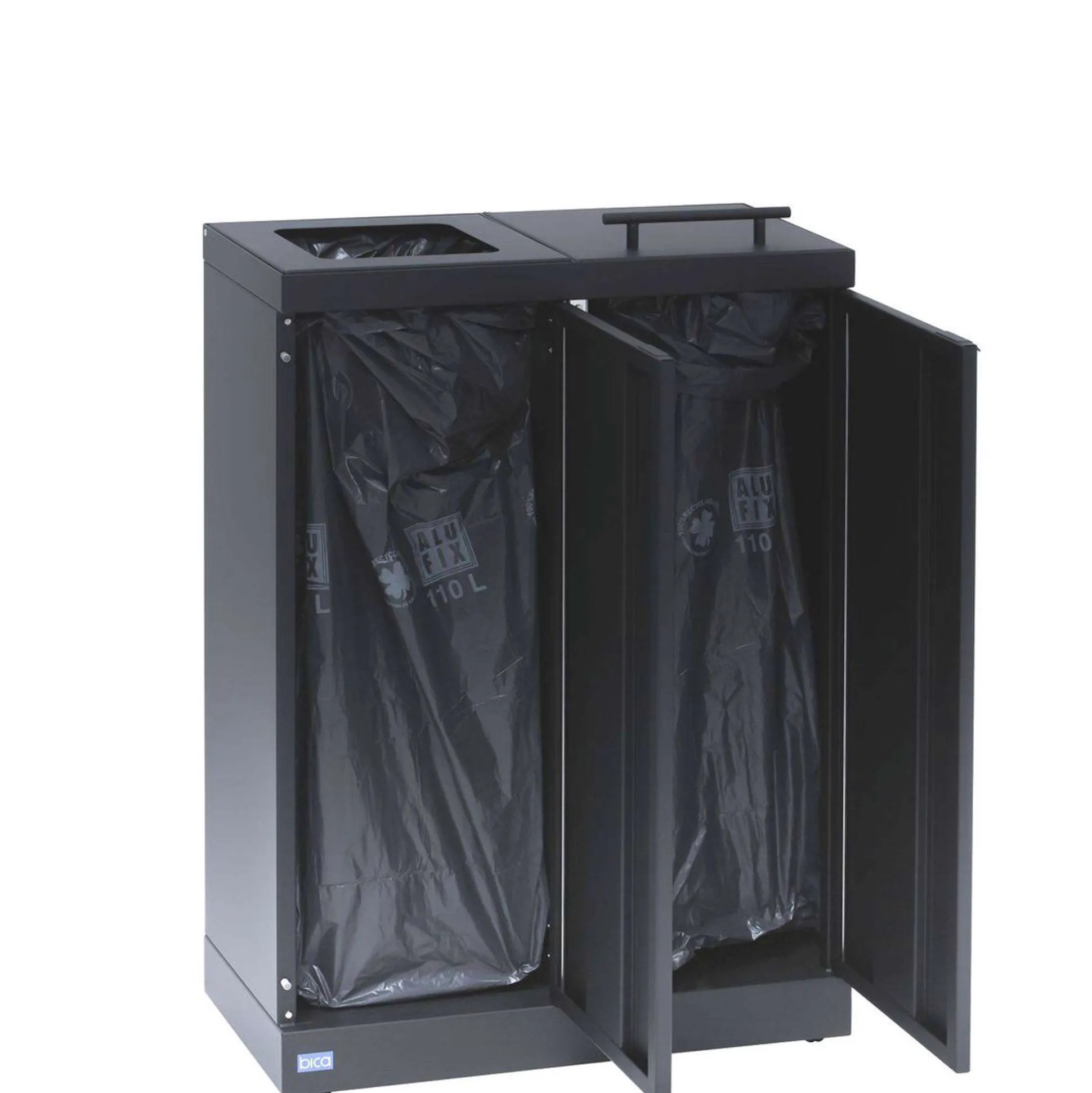 Denne affaldsstation har 2 beholdere. Et med kvadratisk indkast samt et med låg. Der er påmonteret hjul. Låget har soft close og der er integreret poseholder. Beholderen i pulverlakeret stål har en kapacitet på 2 x 65 liter og måler 60x30x84,5h cm. En elegant løsning til kontoret/kantinen.