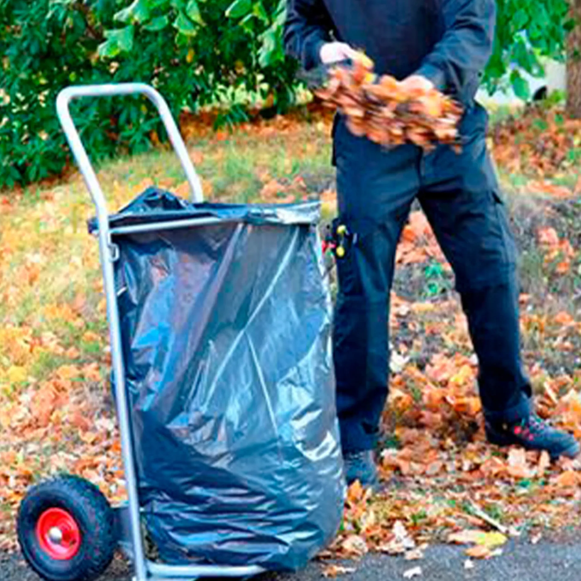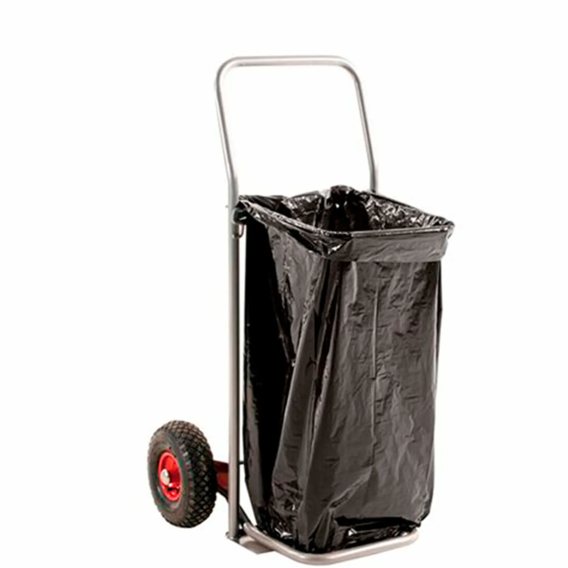 Affaldsvogn i stålstel, kraftig model. 260 mm, luftgummihjul. Max 150 kg. Til 125l sæk. Pulverlakeret, alu.
