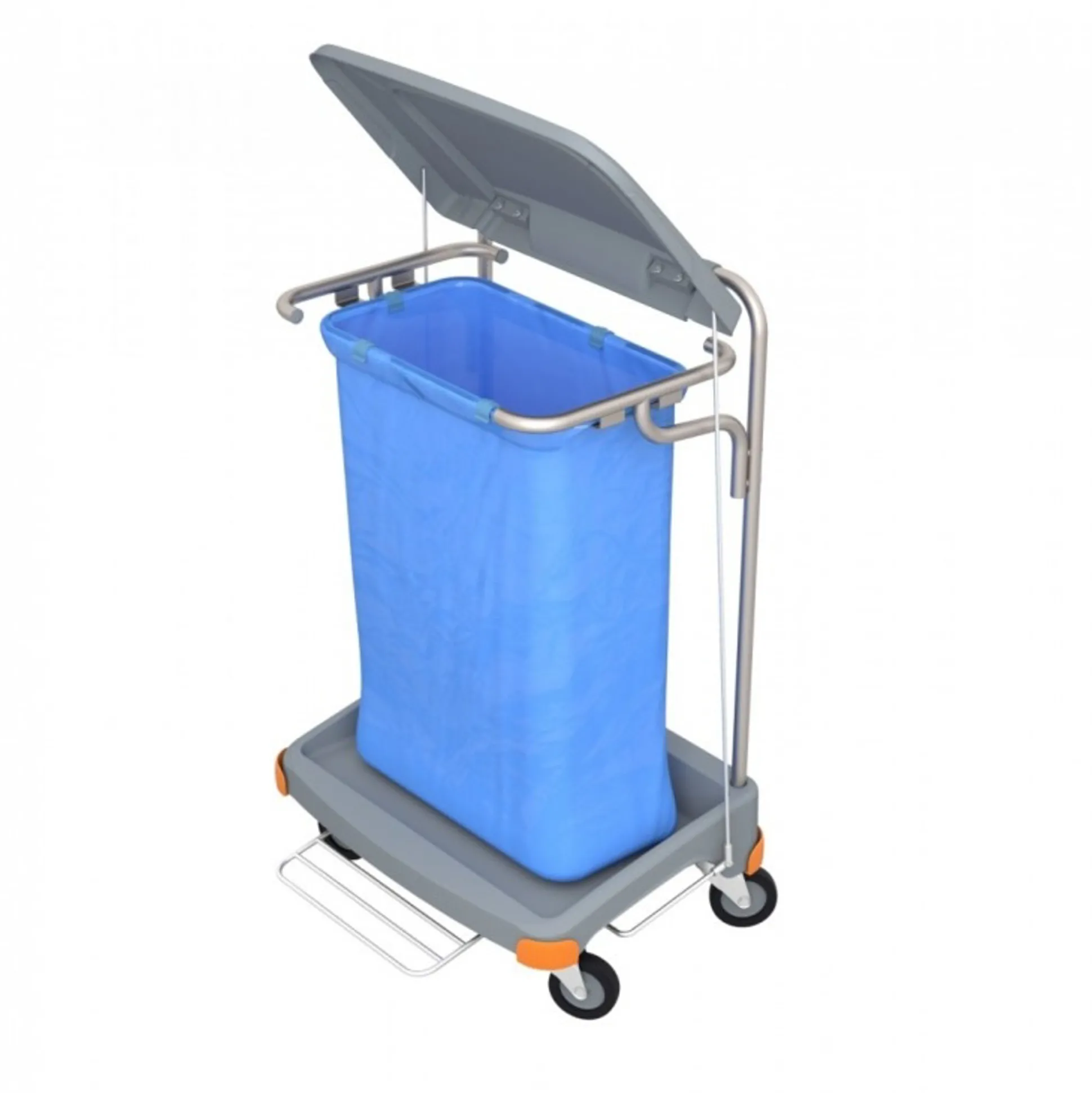 Kraftig affaldsvogn udført i metal med pedalbetjent låg. Affaldsvognen har 4 drejelige gummi hjul for høj mobilitet. Affaldsvognen er udført så den passer til 100 liters affalds sække.