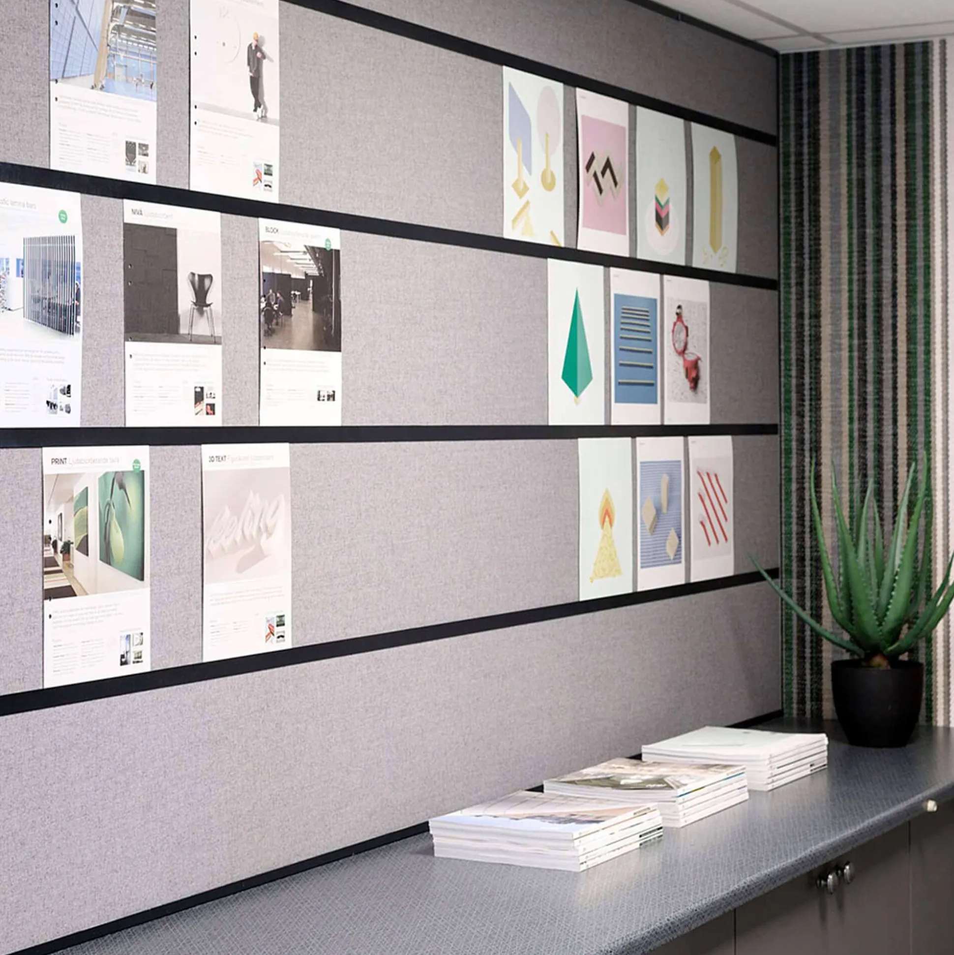 Opslagstavle i lydabsorberende materiale på hele 50 mm, beklædt med holdbart Hush tekstil. Tavlen kan med sine vandrette metal skinner bruges både til nåle og magneter, ligesom der kan sættes dokumenter imellem 2 skinner uden andet.