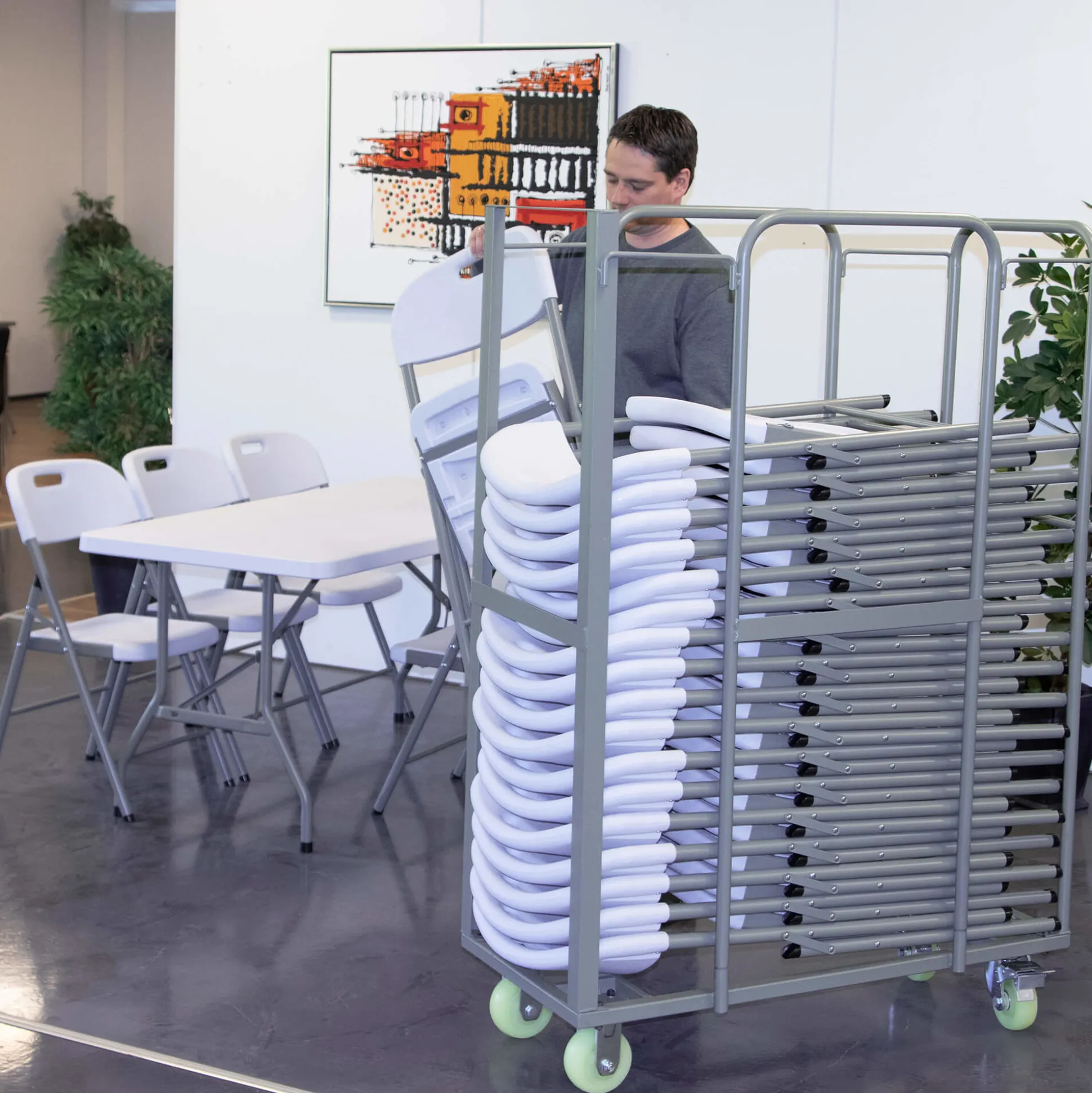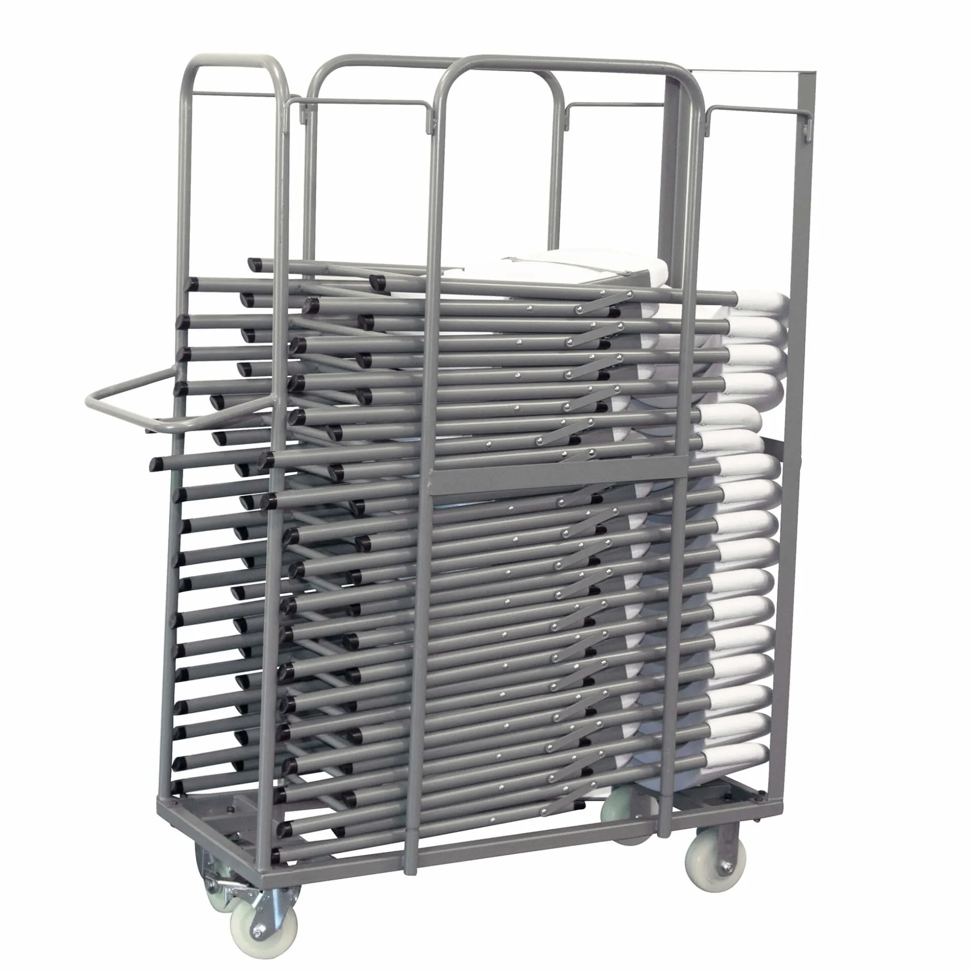Praktisk stolevogn med plads til 22 American stole. Vognens forreste hjul er faste, hvor de bagerste er roterbare og kan låses. Håndtagene gør den nem at skubbe rundt.