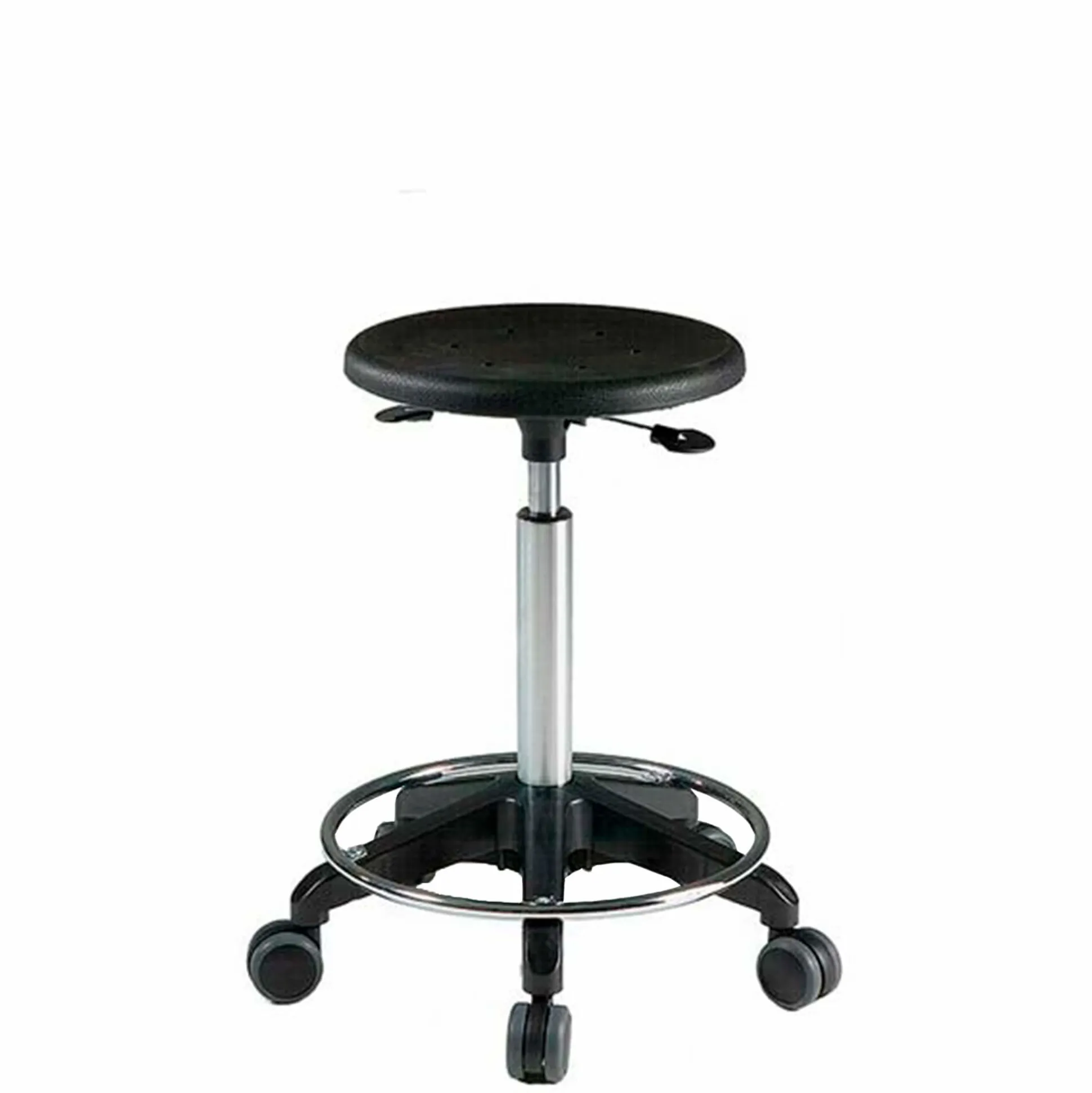 Arbejdstaburet med sæde i PU-skum. Taburet med sæde af formstøbt polyurethan-skum yder en god siddekomfort samtidig med at den er praktisk og robust – også i de grovere miljøer. Polyurethan er hårdført over for mange typer væsker og kemikalier og er samtidig rengøringsvenlig. Med praktisk fodkryds i nylon og fodring i krom, med 65 mm hjul.