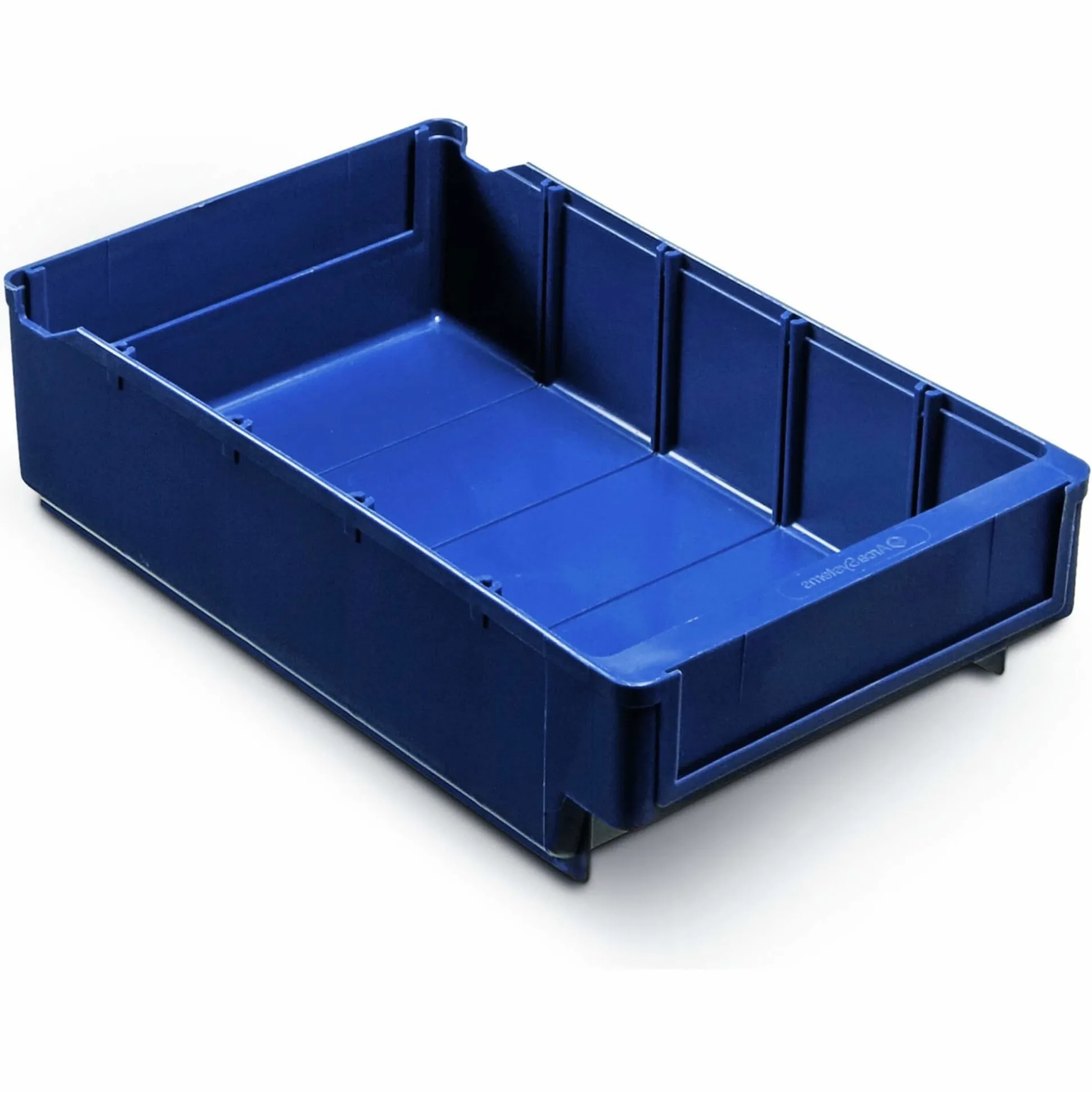 ArcaSystems lagerskuffe i blå. Med gribebakker bagpå, så skufferne kan hænge i hylderne. Udført i slagfast plast. Passer med 5 lagerskuffer på en 100 cm. hylde. (model 4531)