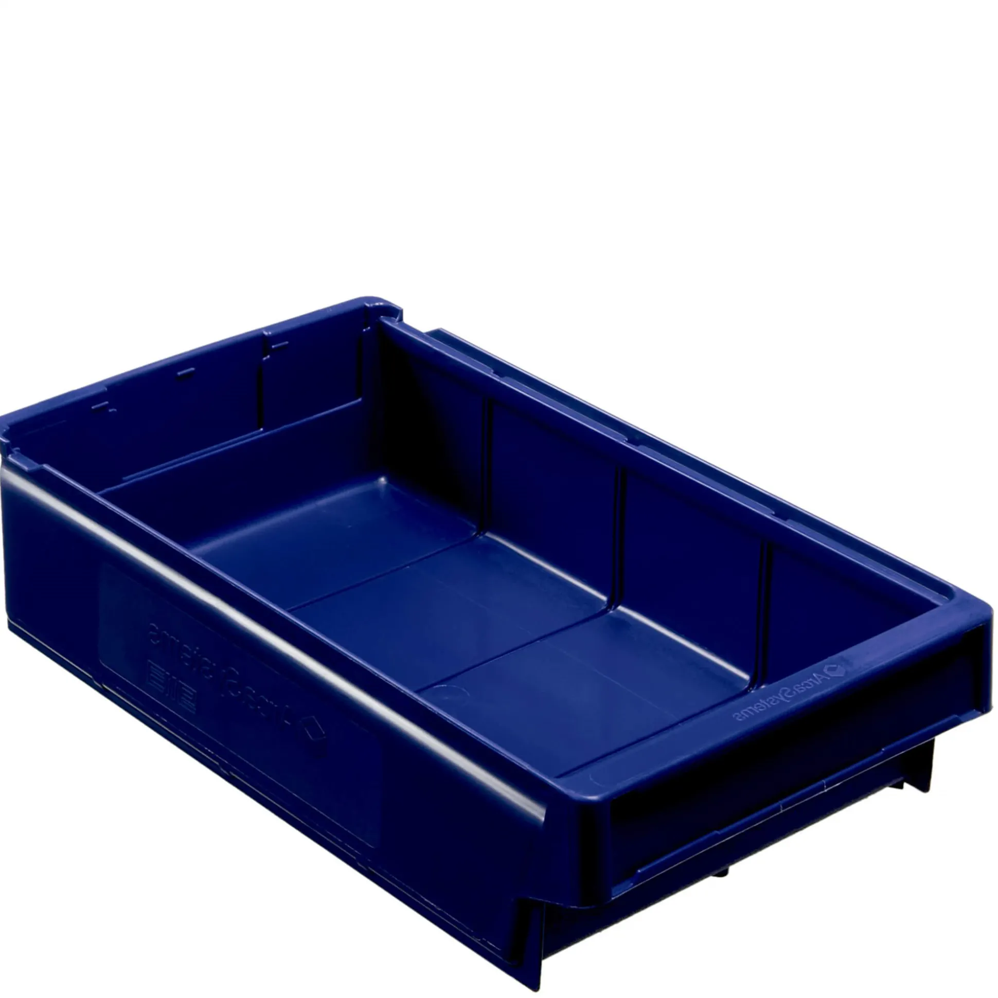ArcaSystems lagerskuffe i blå. Med gribebakker bagpå, så skufferne kan hænge i hylderne. Udført i slagfast plast. Passer med 8 eller 4 lagerskuffer på en 100 cm. hylde. (model 9113)