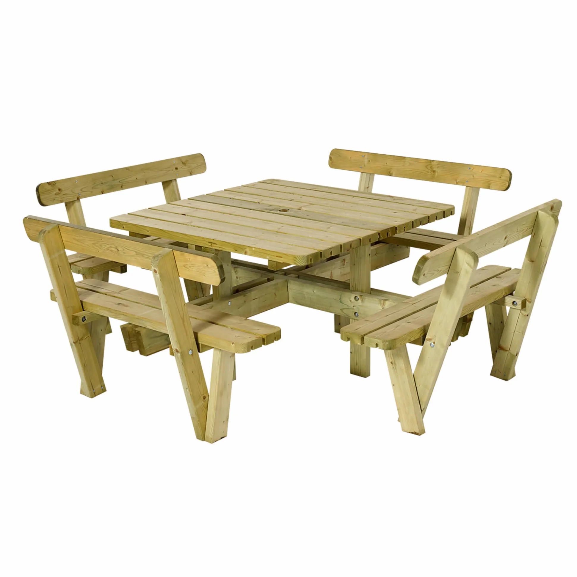 Firkantet bord bænkesæt med ryglæn. 237×237 cm. Er udført i certificeret trykimprægneret nåletræ.