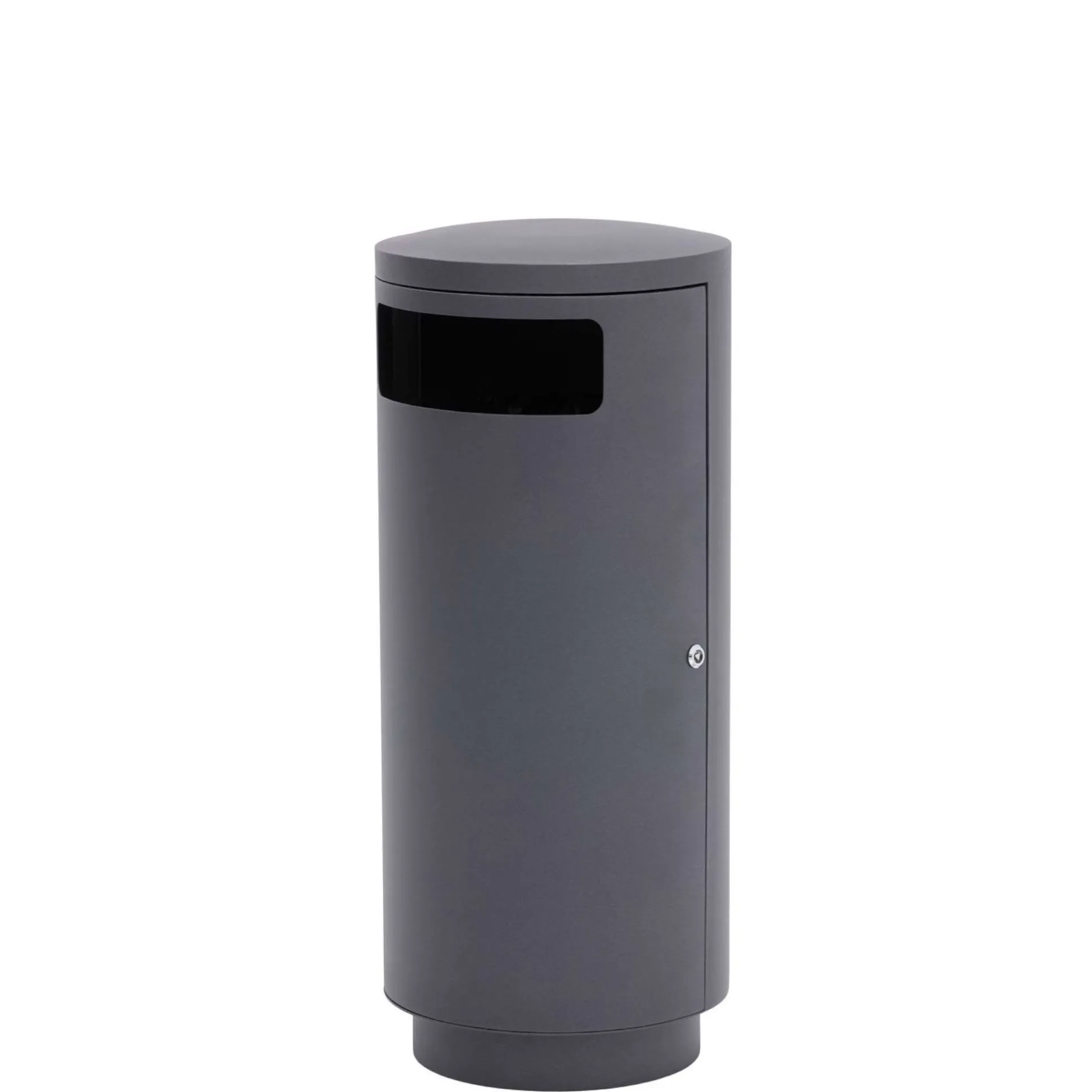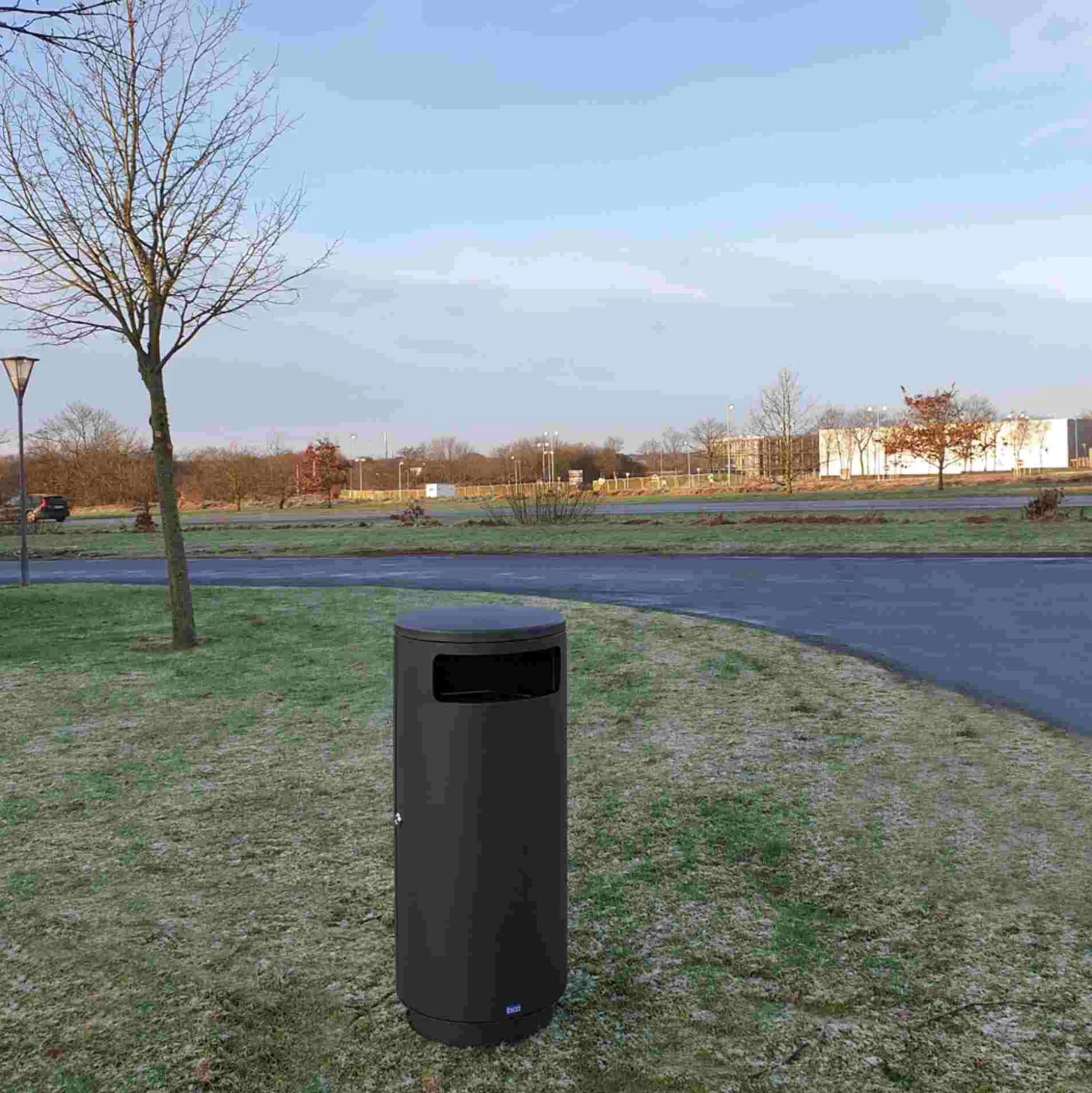Stor rund udendørs skraldespand med frontåbning, der gør det nemt at tømme skraldspanden. Velegnet til alle udendørsområder.