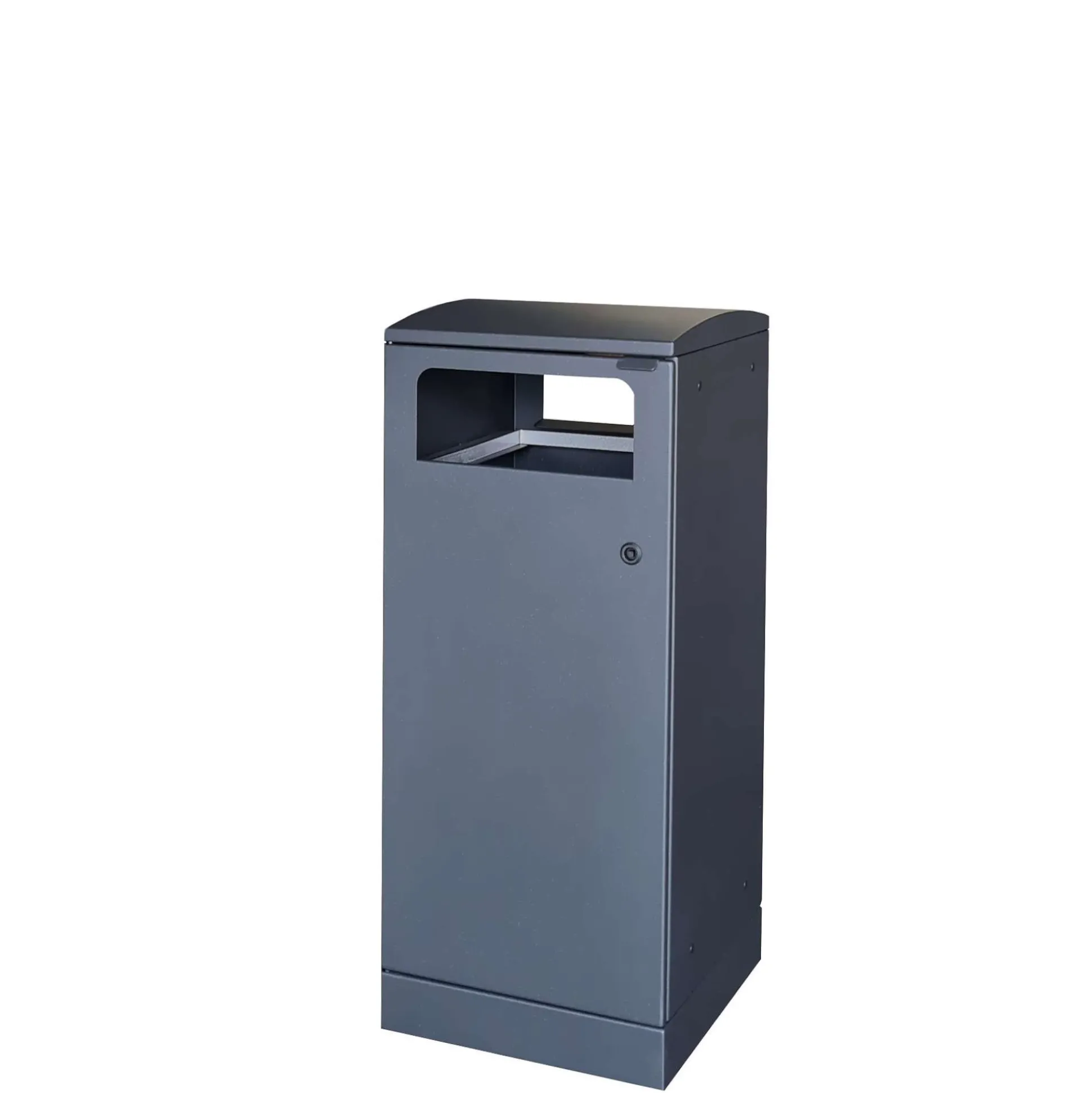 Robust udendørs affaldsbeholder med indkast fra begge sider. Den låsbarer frontlåge giver nem adgang til tømning.