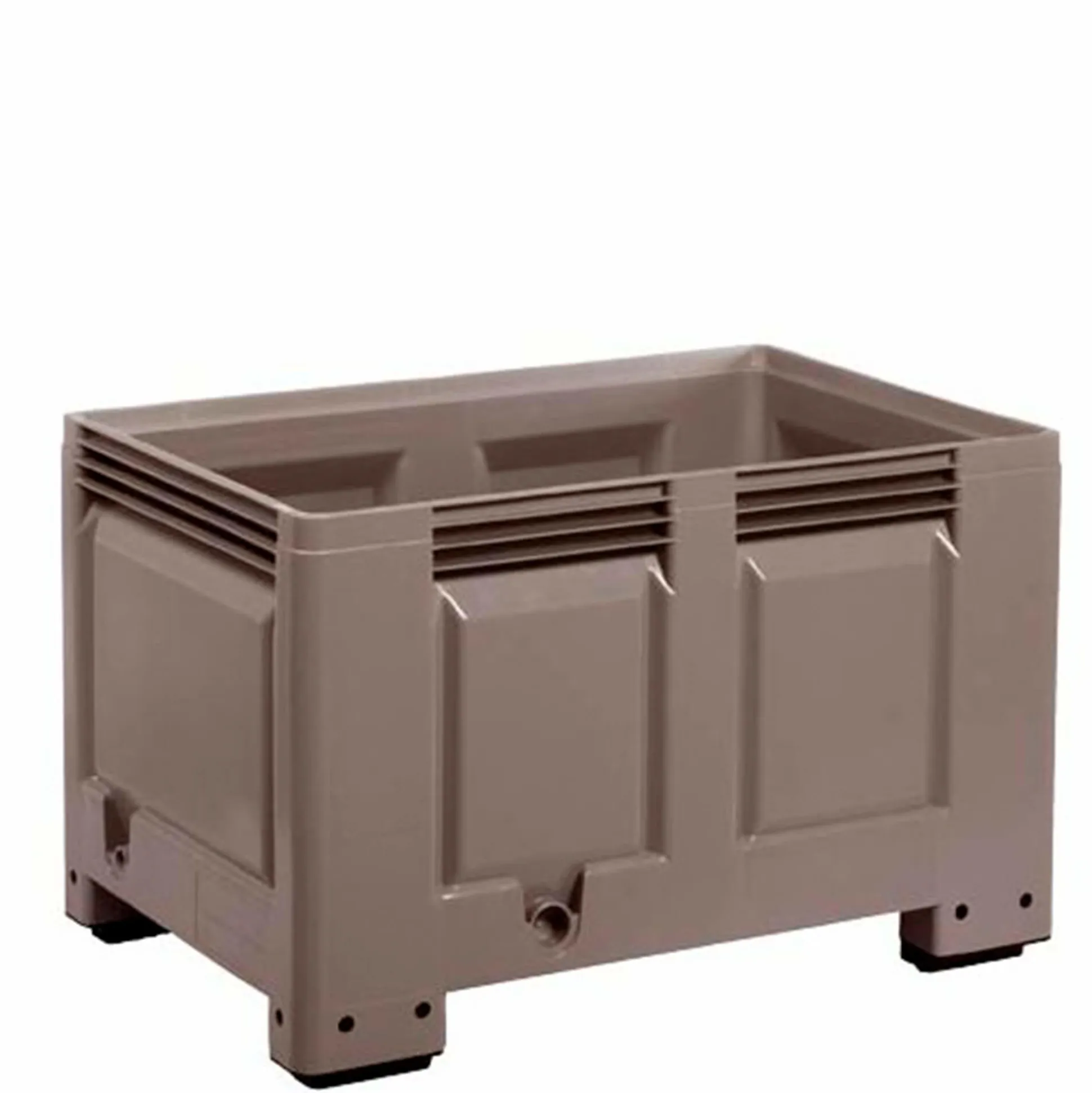 Pallebeholdere i HD-polyetylen. Mål: 120 x 80 x 76 cm. 535 liter. Med 4 fødder. Big Box har dobbeltvæggede profiler i alle hjørner, hvilke sikrer en høj last- og stablingskapacitet. Maxbelastning på 500 kg og 4500 kg ved stabling.