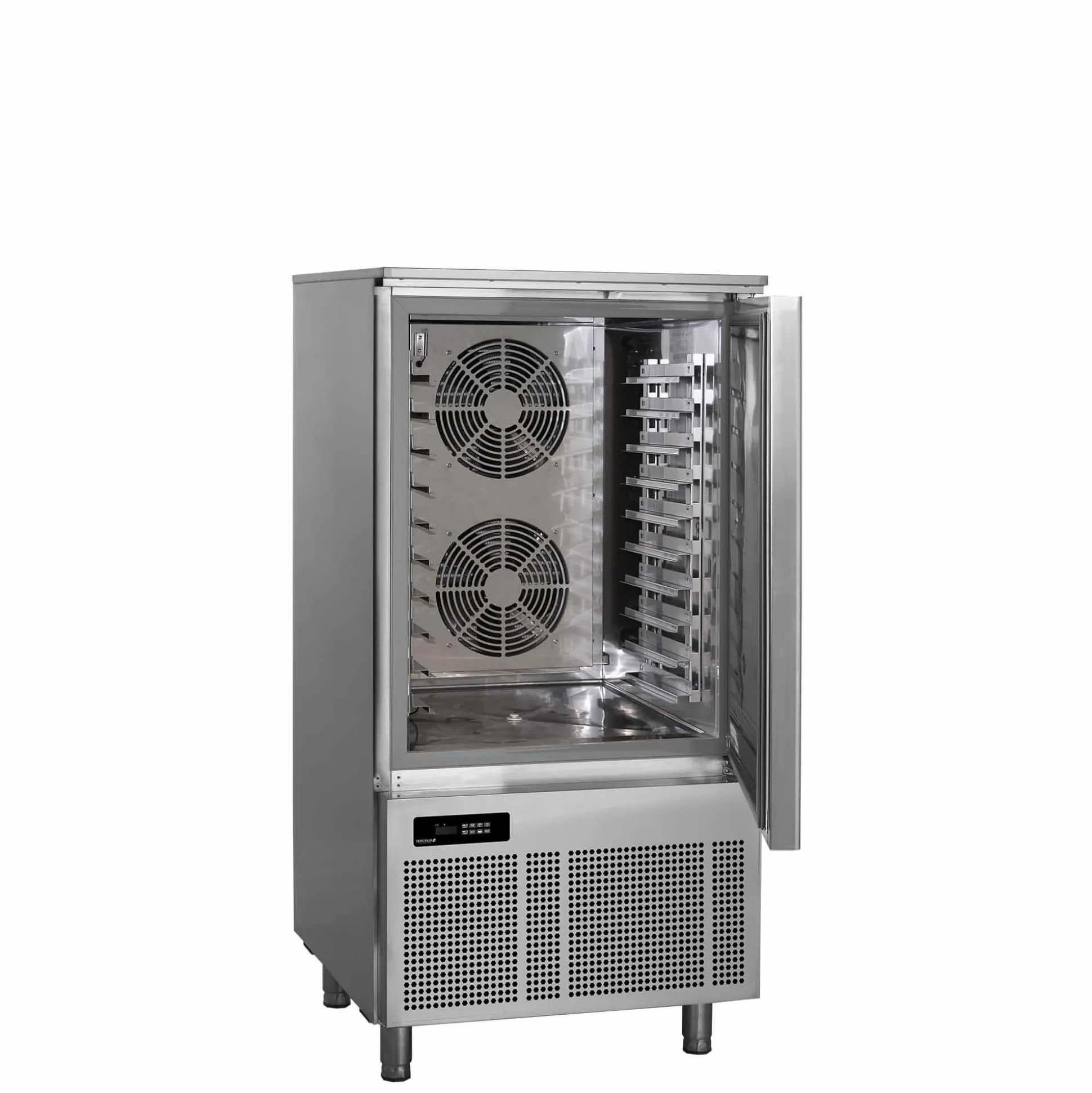 Den nye BLC10 Blæstkøler GN1/1 i rustfrit stål er designet til professionelle køkkener, der kræver pålidelighed og effektivitet. Inkluderet kernetemperaturføler og programmerbar termostat gør det nemt at kontrollere processen præcist. Med 4 forindstillede programmer, tilpasset både Gastronorm 1/1 og Euronorm bakker, tilbyder denne model alsidighed og bekvemmelighed. Dens vendbare, selvlukkende dør og justerbare ben sikrer enkel integration i ethvert køkkenmiljø.