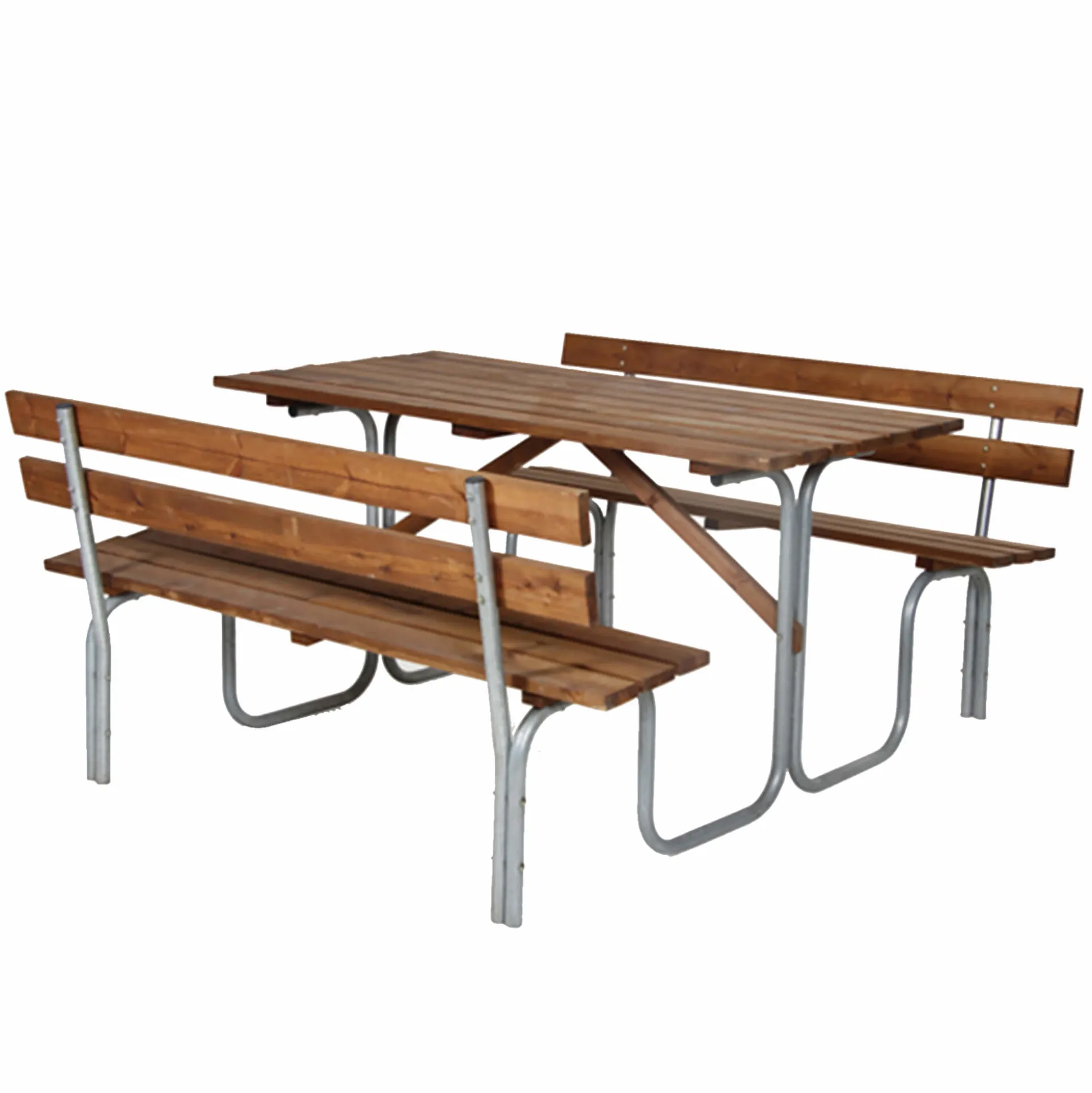 Kvalitets bord bænkesæt med ryglæn. Bordets overflade er i brun imprægneret fyr og stellet i galvaniseret stål. Bordet måler 179x150x71h cm. Leveres usamlet, ønskes montage kan det tilkøbes.