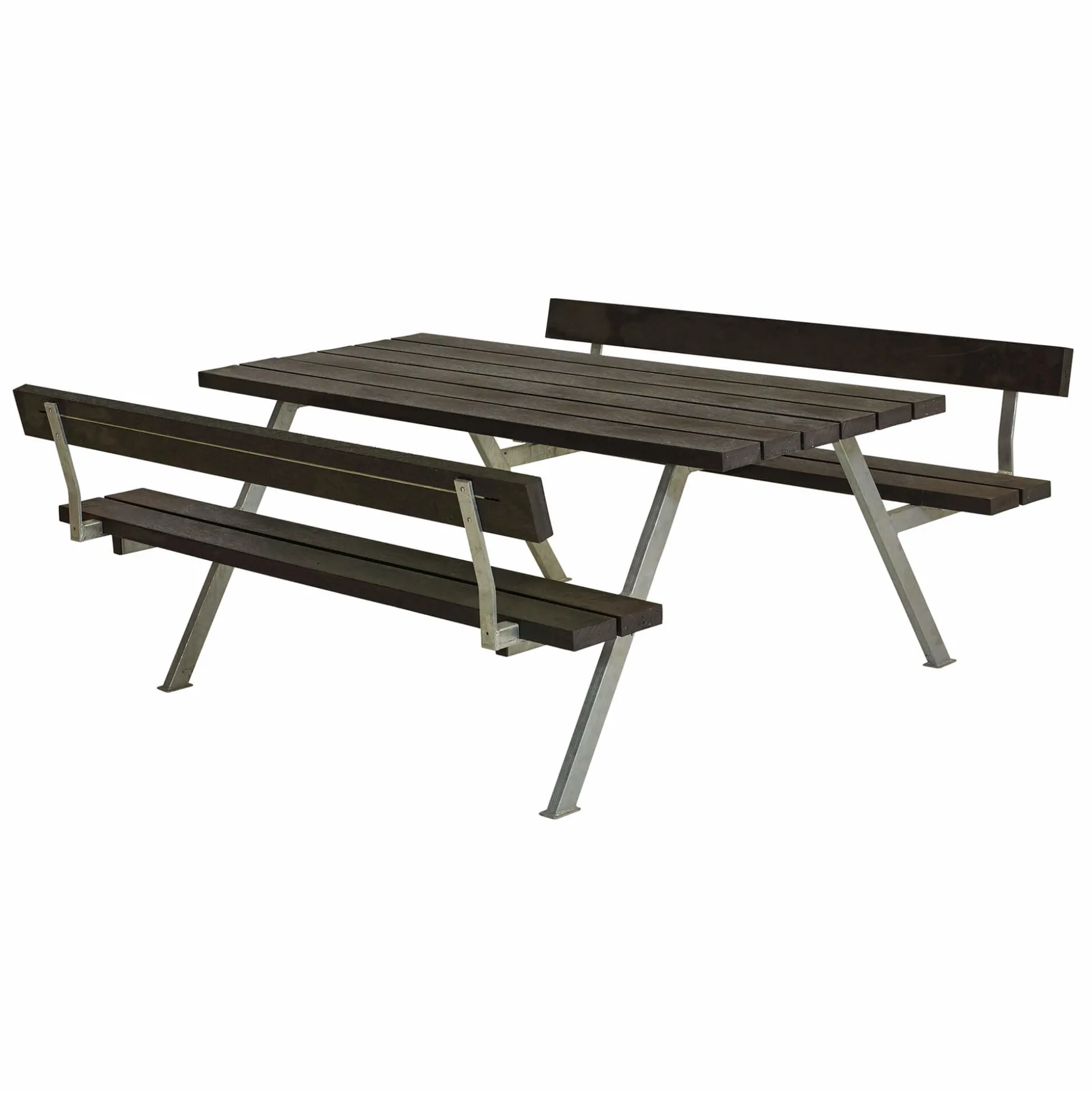 Klassisk bord-bænkesæt fremstillet i sort genbrugsplast med ryglæn. Sættet består af 1stk bord-bænkesæt og 2stk ryglæn inkl. beslag. Bordet måler 185x177x73h cm. Leveres usamlet, ønskes montage kan det tilkøbes.