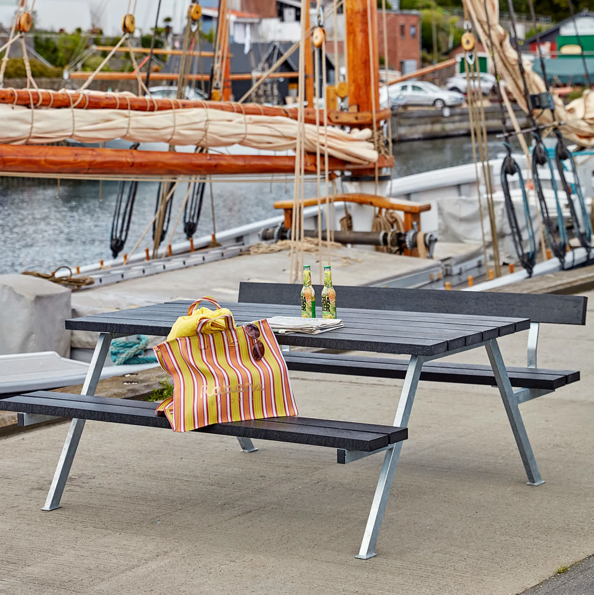 Klassisk bord bænkesæt i sort genbrugsplast med ryglæn
