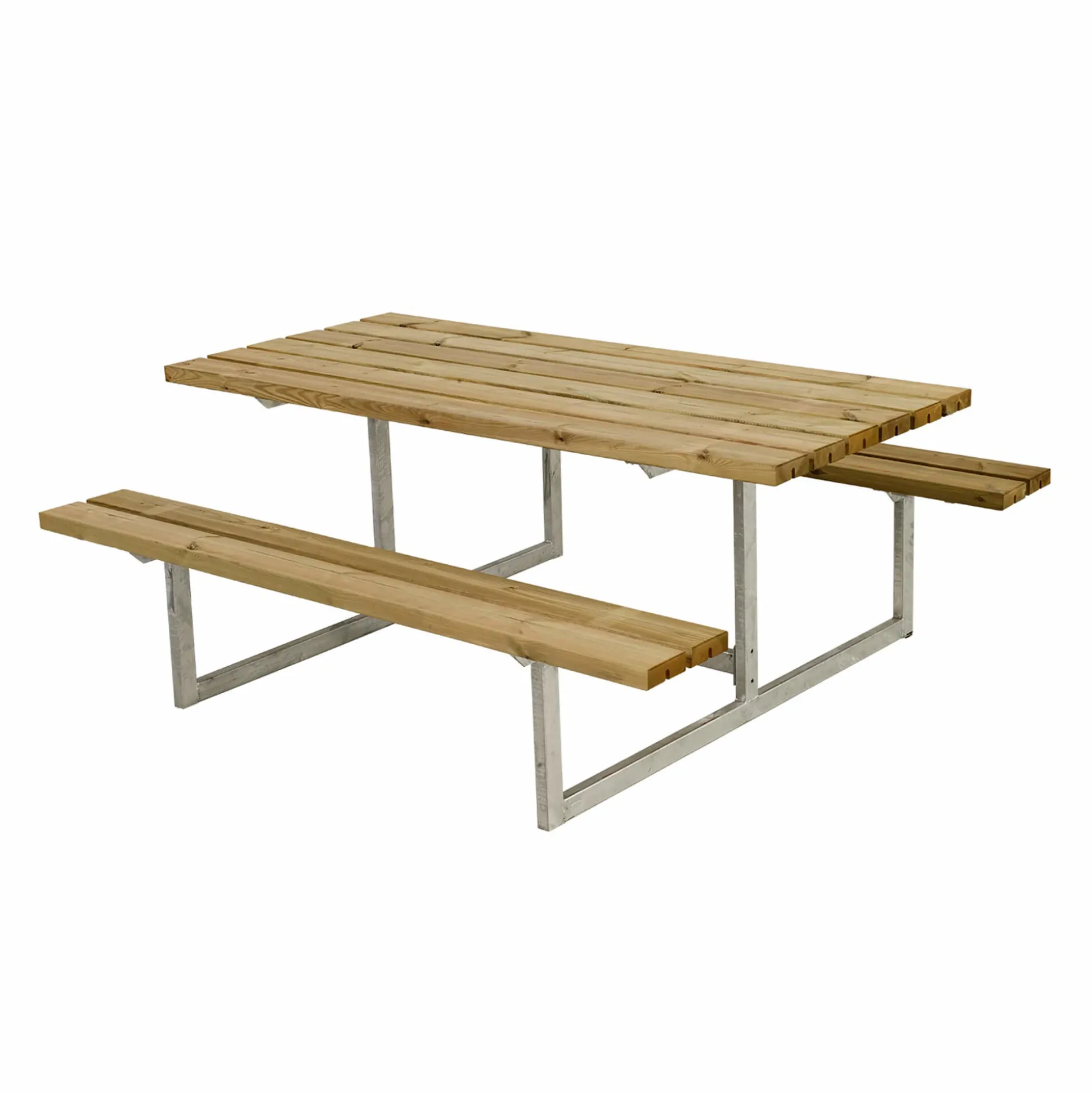 Klassisk bord-bænkesæt fremstillet i trykimprægneret nåletræ med galvaniseret stålstel. Bordet måler 160x177x73h cm. Leveres usamlet, ønskes montage kan det tilkøbes.