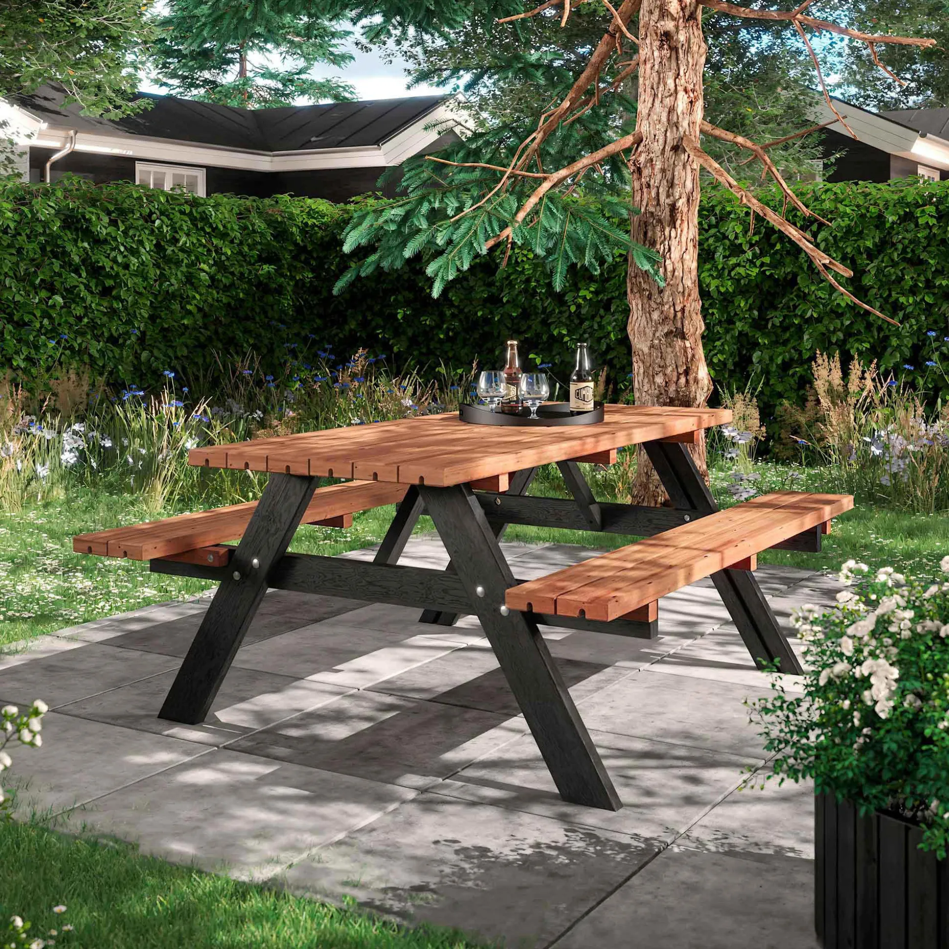 Sættet er lavet i varmebehandlet fyrretræ (ThermoWood®), som er udviklet til at tåle det omskiftelige danske vejr uden behov for maling eller olie. Med tiden vil træet naturligt få en grålig nuance – men du kan selv vælge at oliere det for at bevare den varme farvetone. Stel og ben er i sortmalet nåletræ, som både giver et robust udtryk og ekstra beskyttelse mod vind og vejr. Sæderne på bænkene kan klappes op, hvilket gør det lettere at holde området rent og tørt.