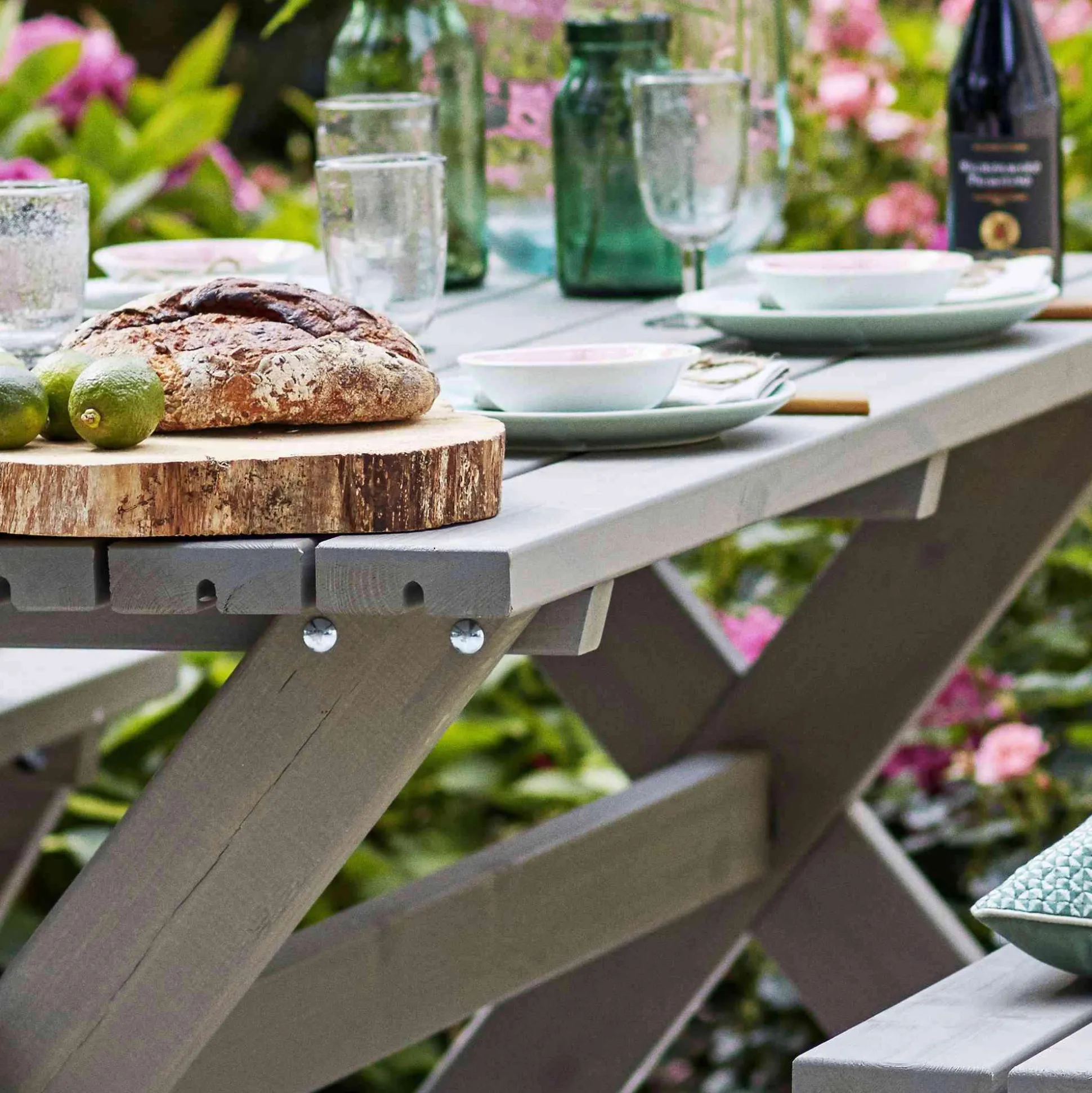 Klassisk bord bænkesæt i gråmalet og trykimprægneret nåletræ med krydsben på både bordet og de 2 bænke.
