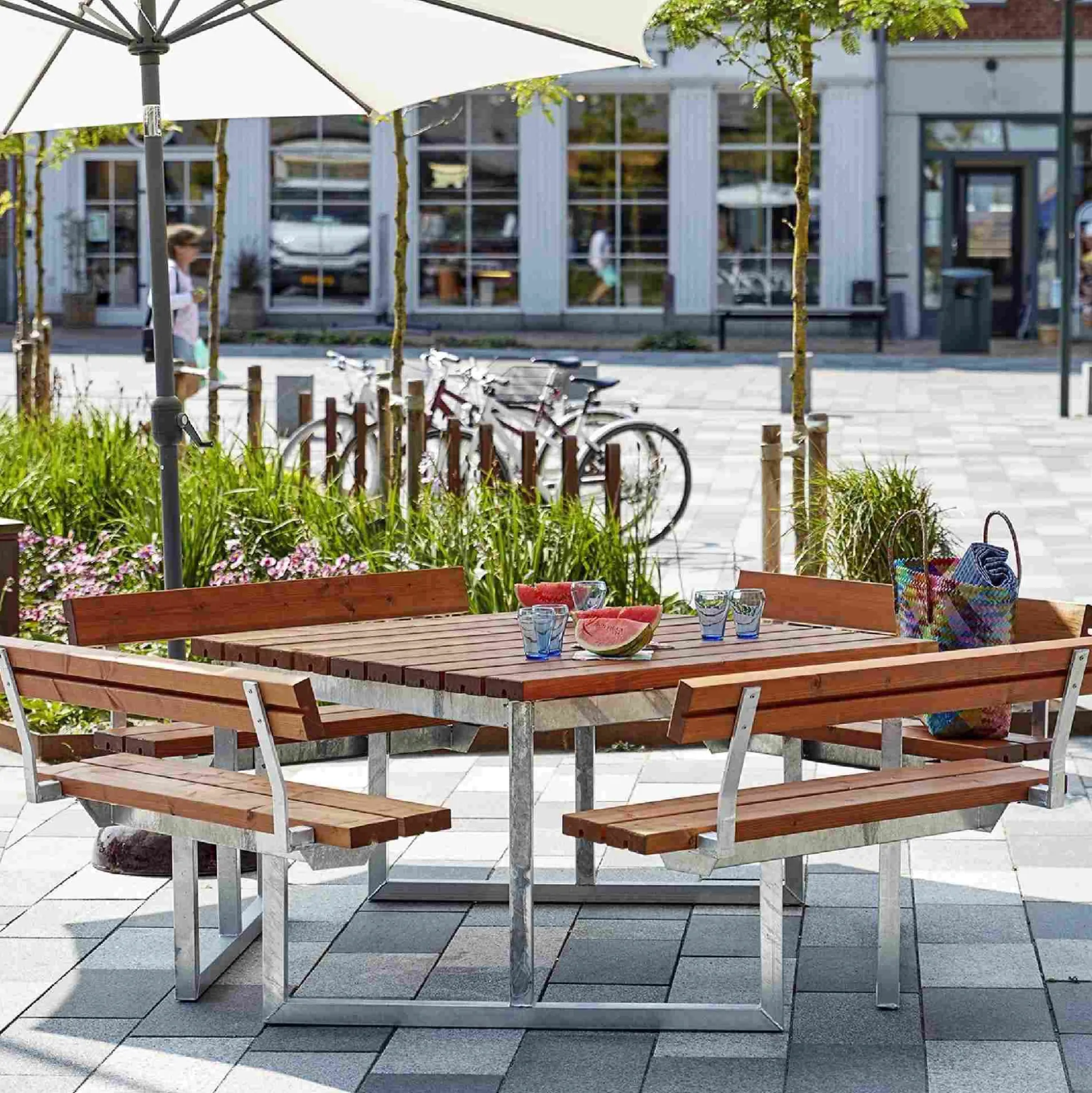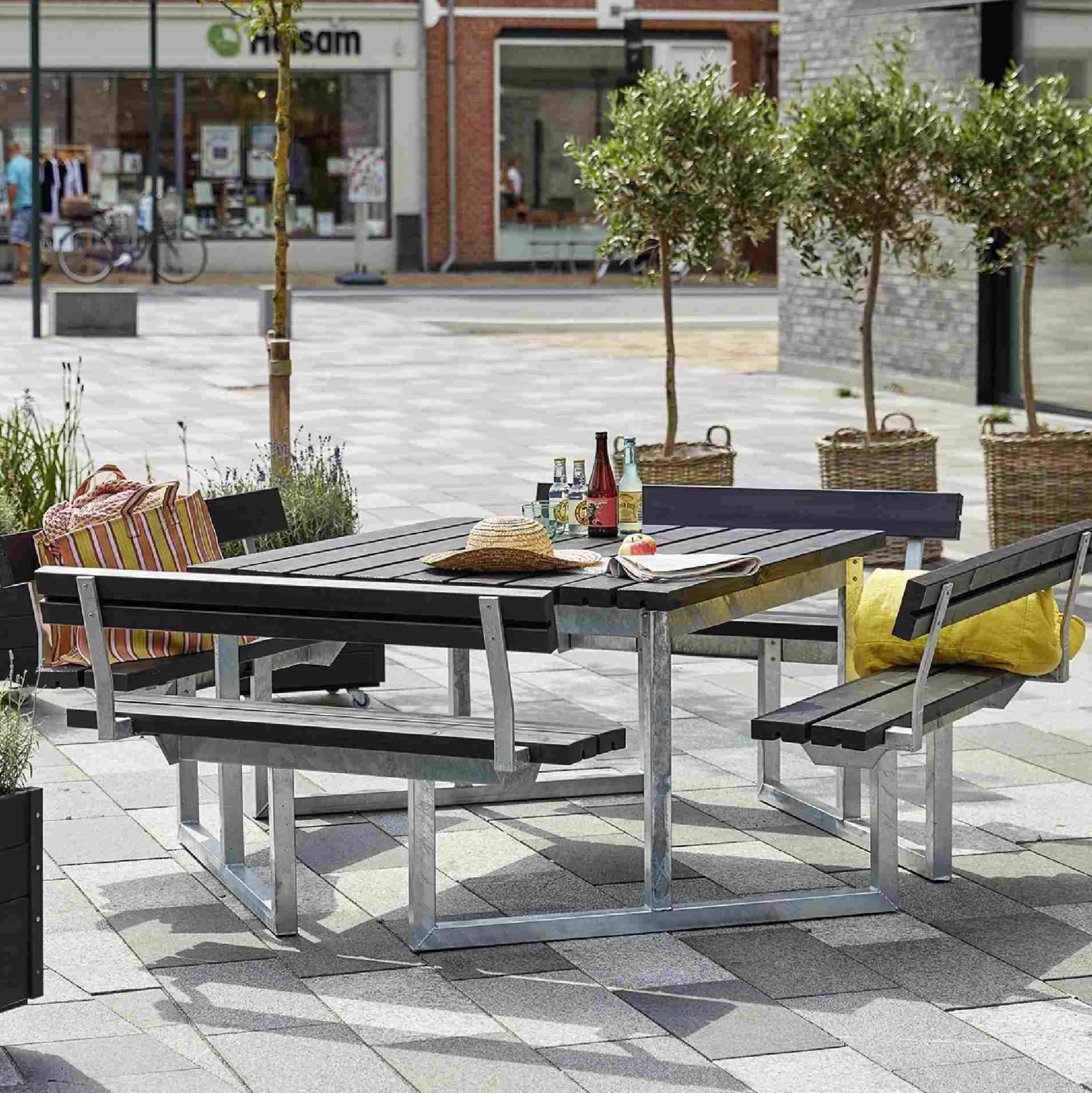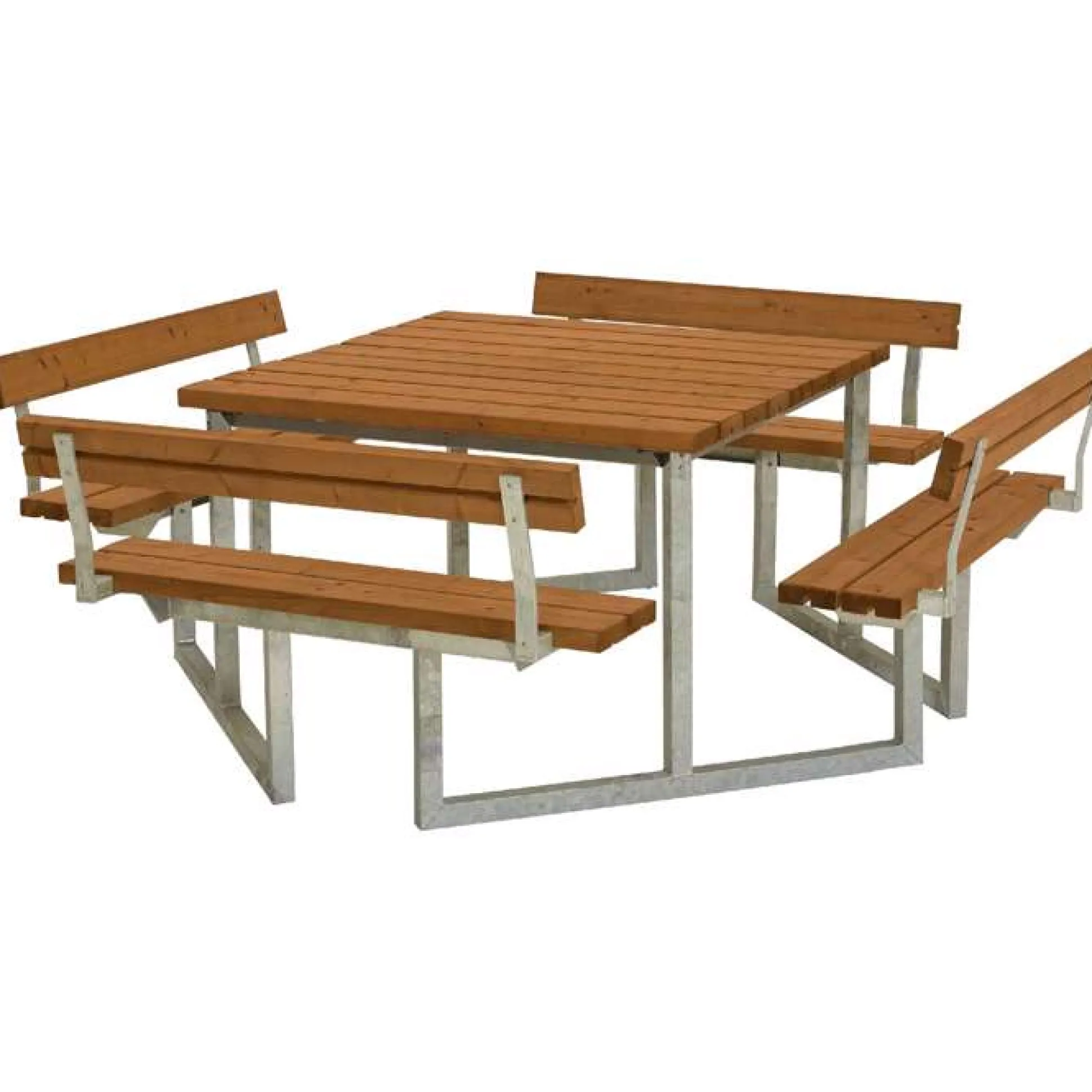 Det solide stel i varmgalvaniseret stål og de kraftige planker, gør dette bord bænkesæt særdeles stabilt.