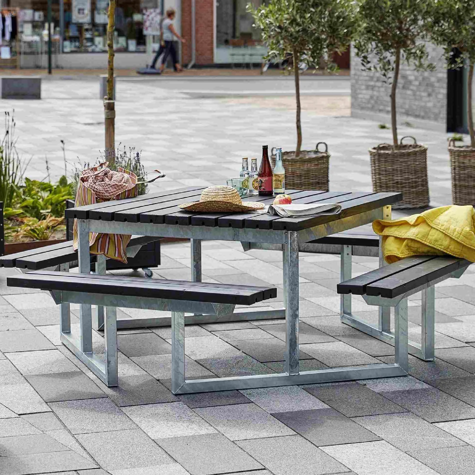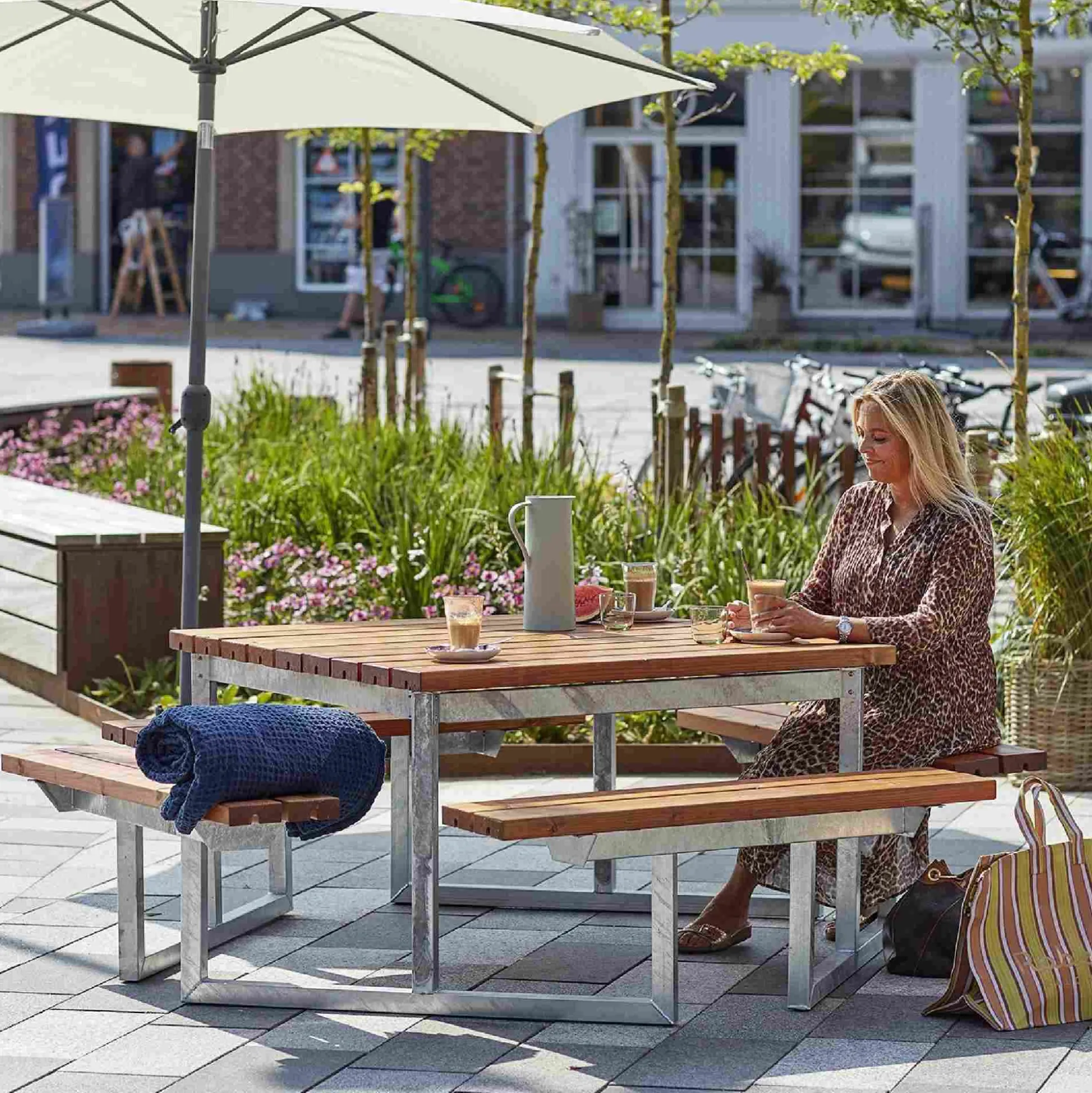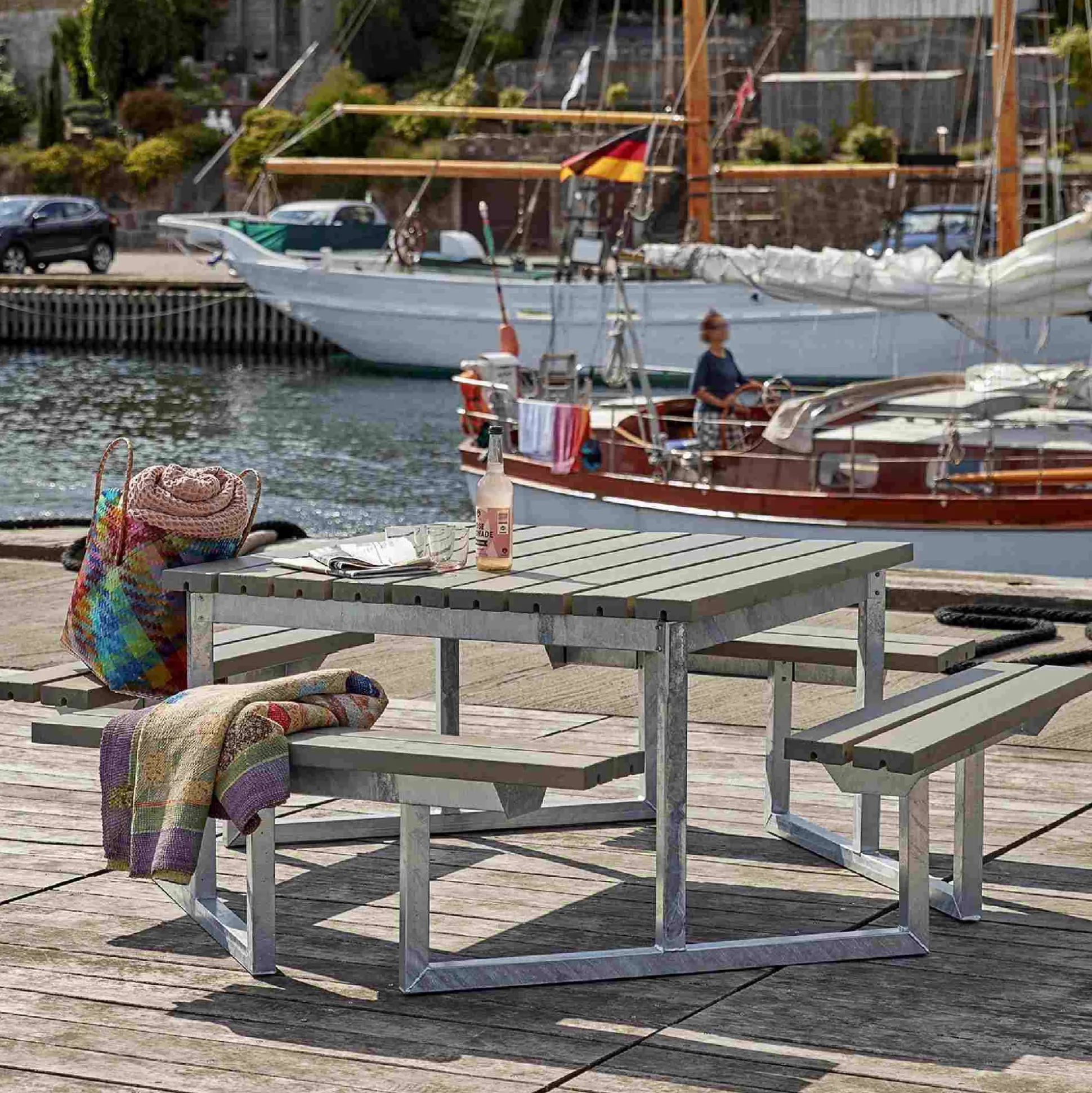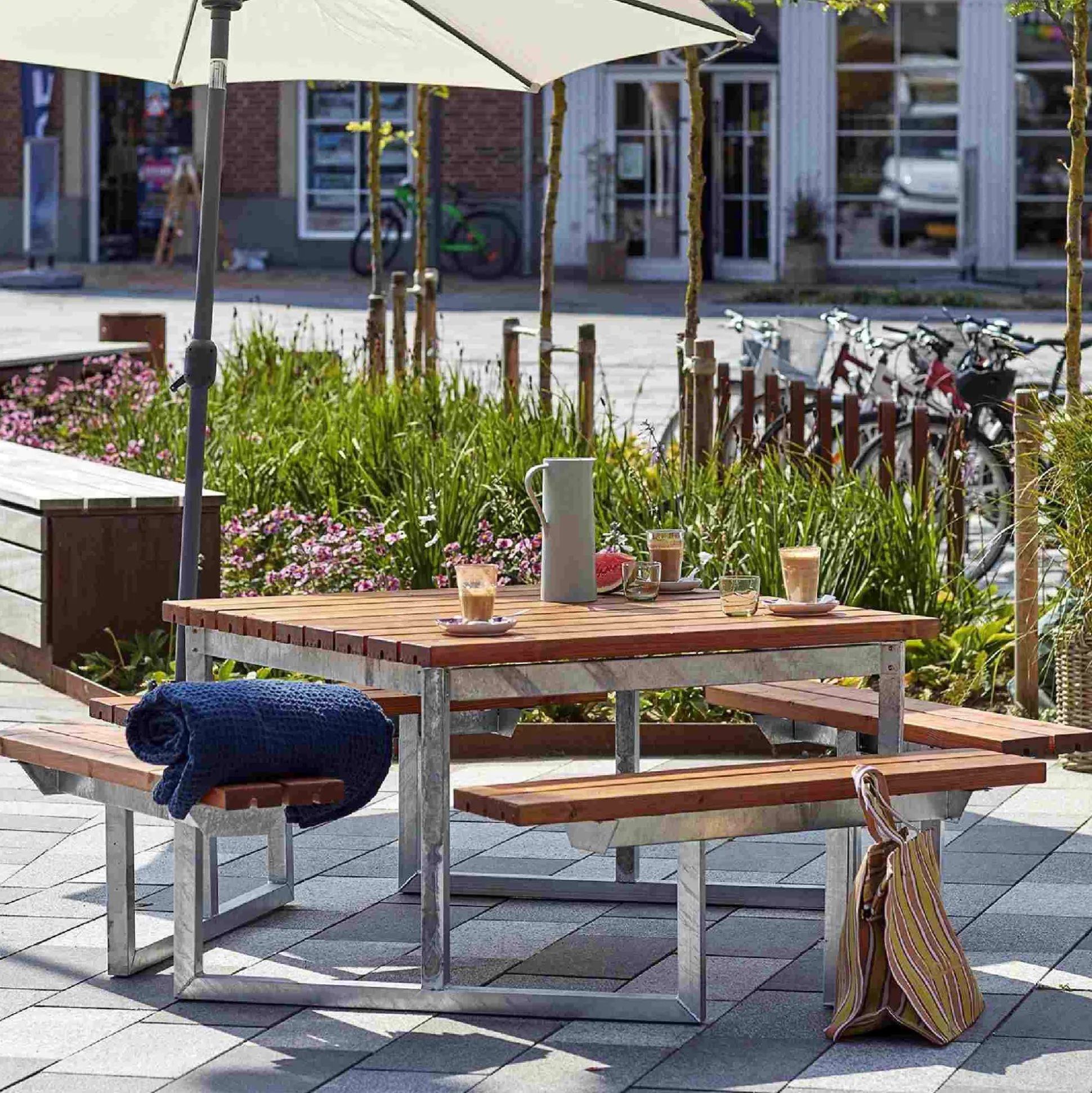 Det solide stel i varmgalvaniseret stål og de kraftige planker, gør dette bord bænkesæt særdeles stabilt.