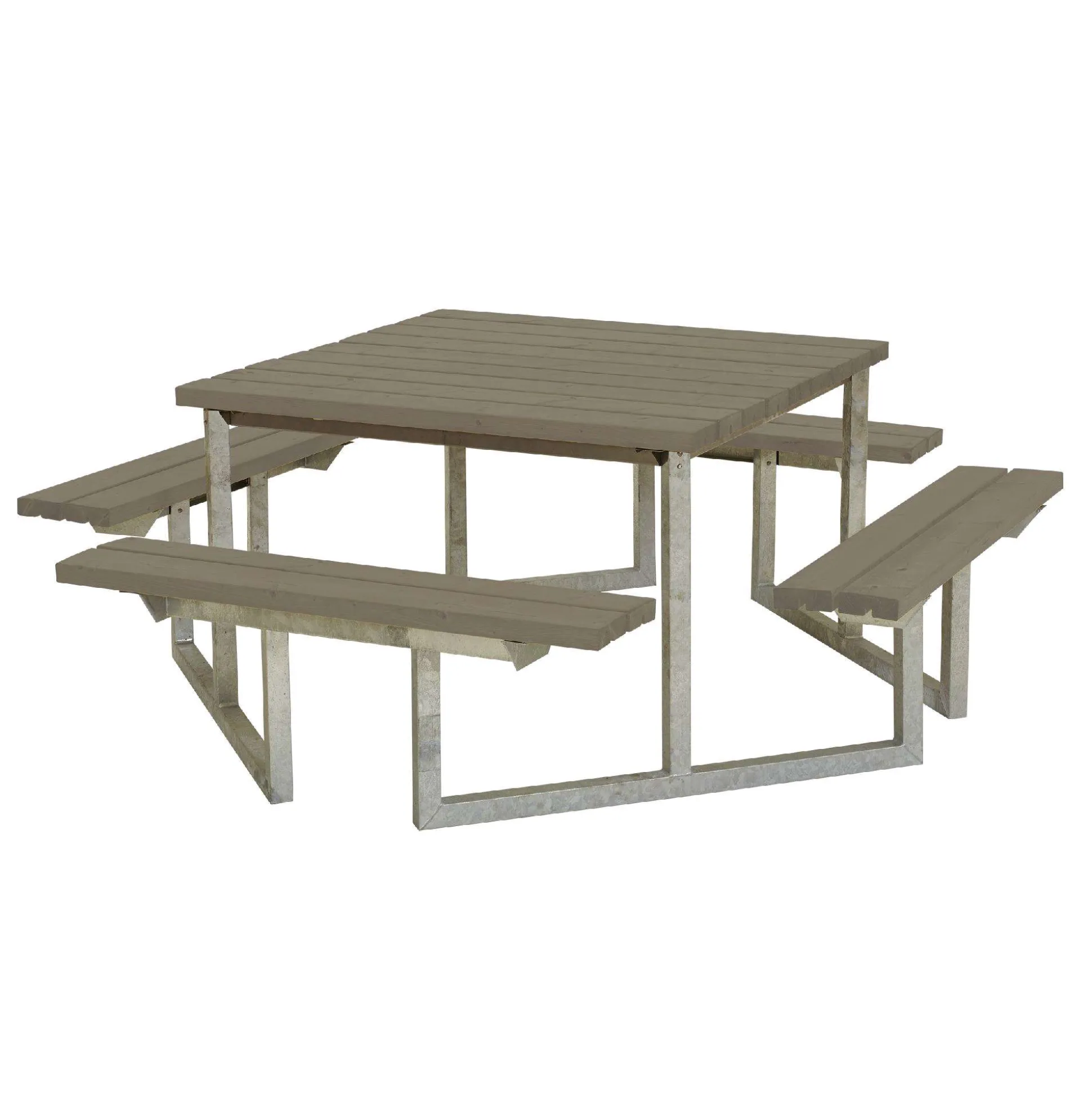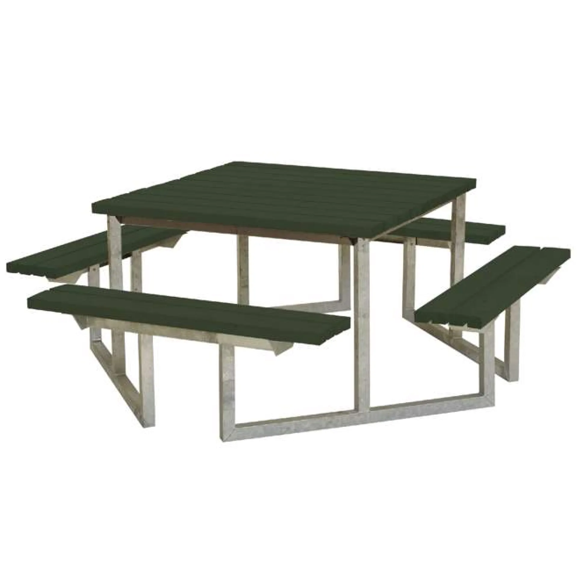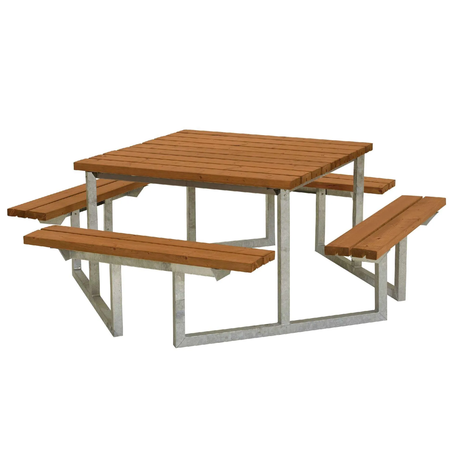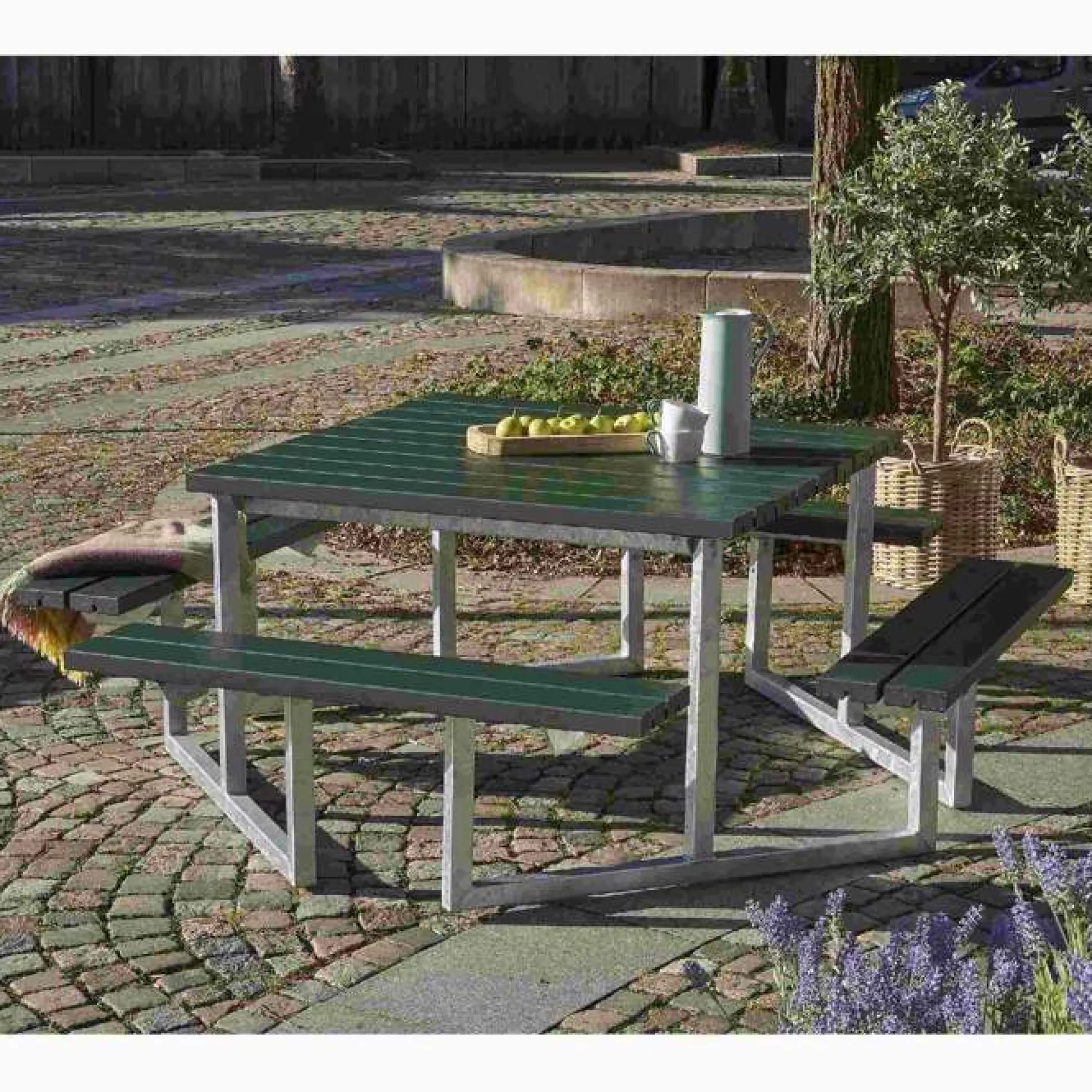 Det solide stel i varmgalvaniseret stål og de kraftige planker, gør dette bord bænkesæt særdeles stabilt.