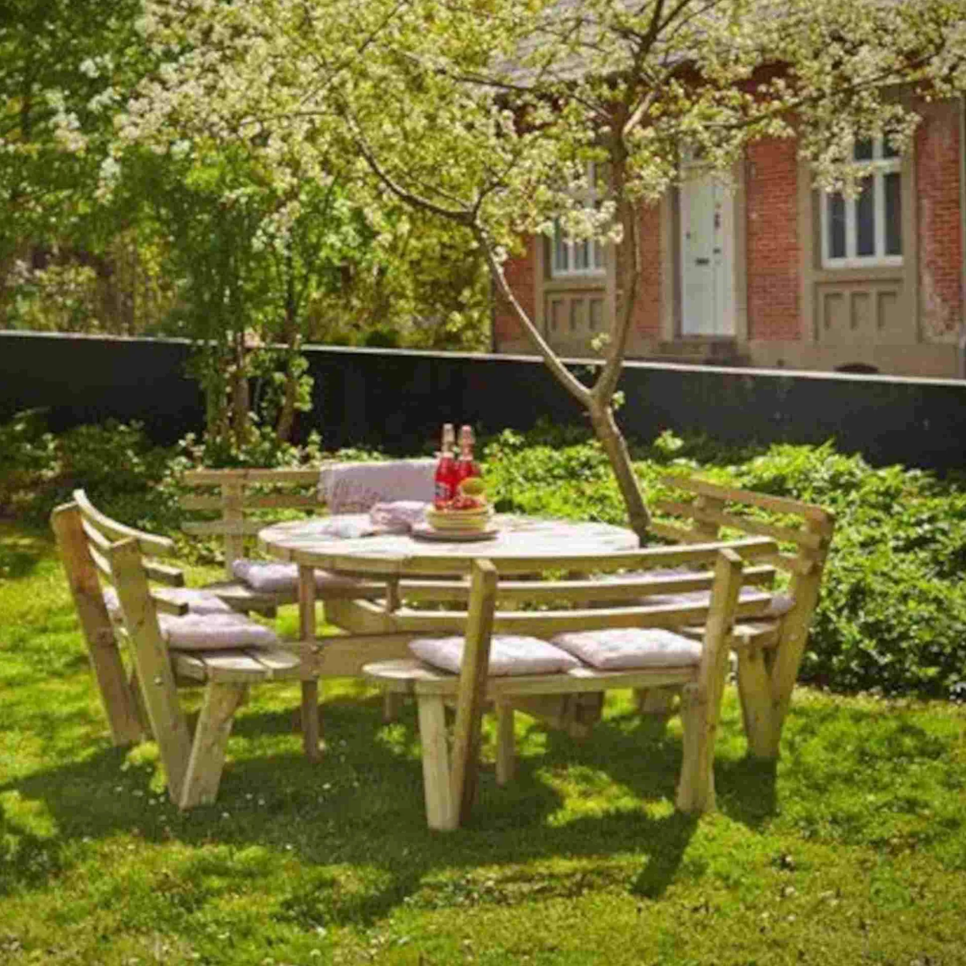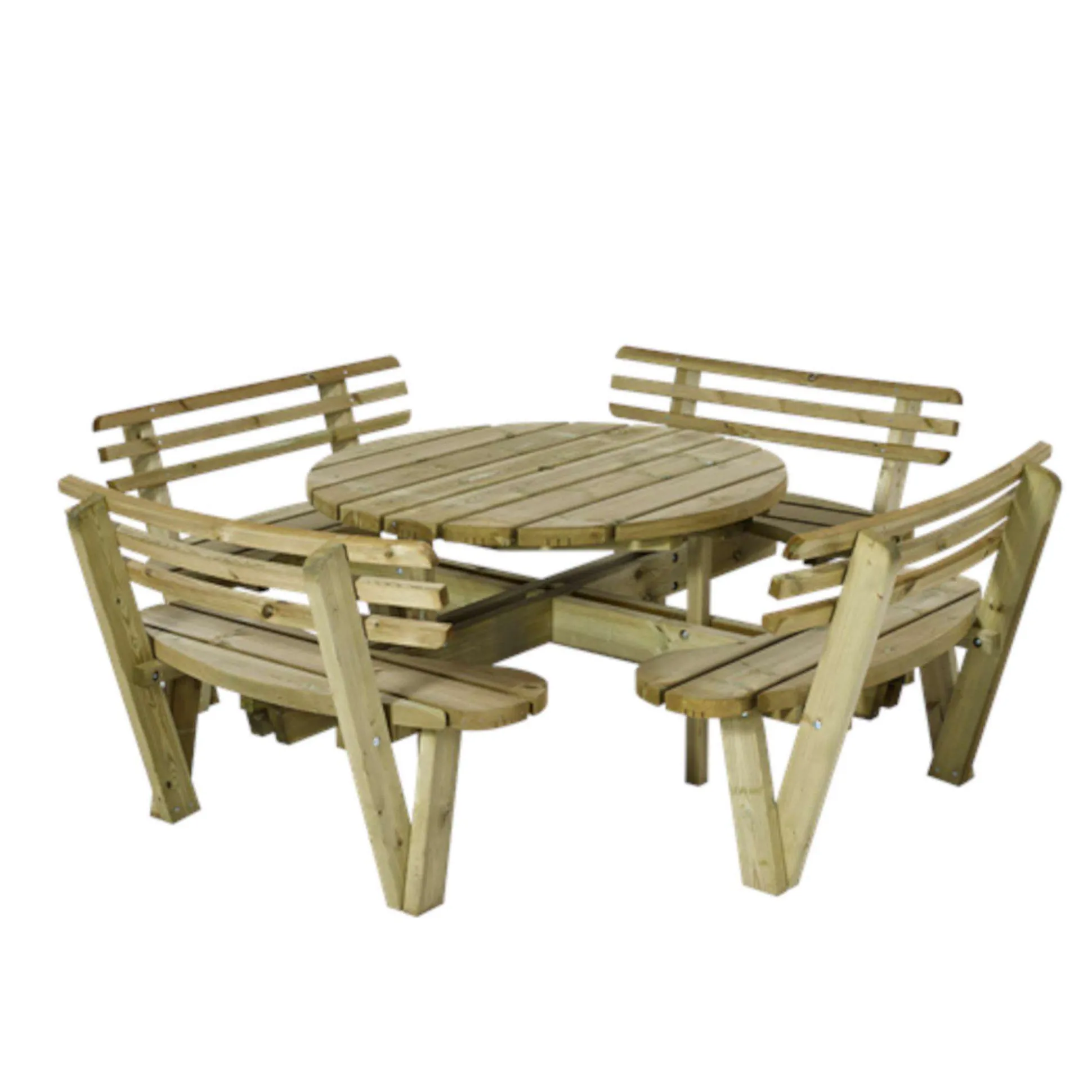 Rundt bord bænkesæt med ryglæn. 237×237 cm. Er udført i certificeret trykimprægneret nåletræ