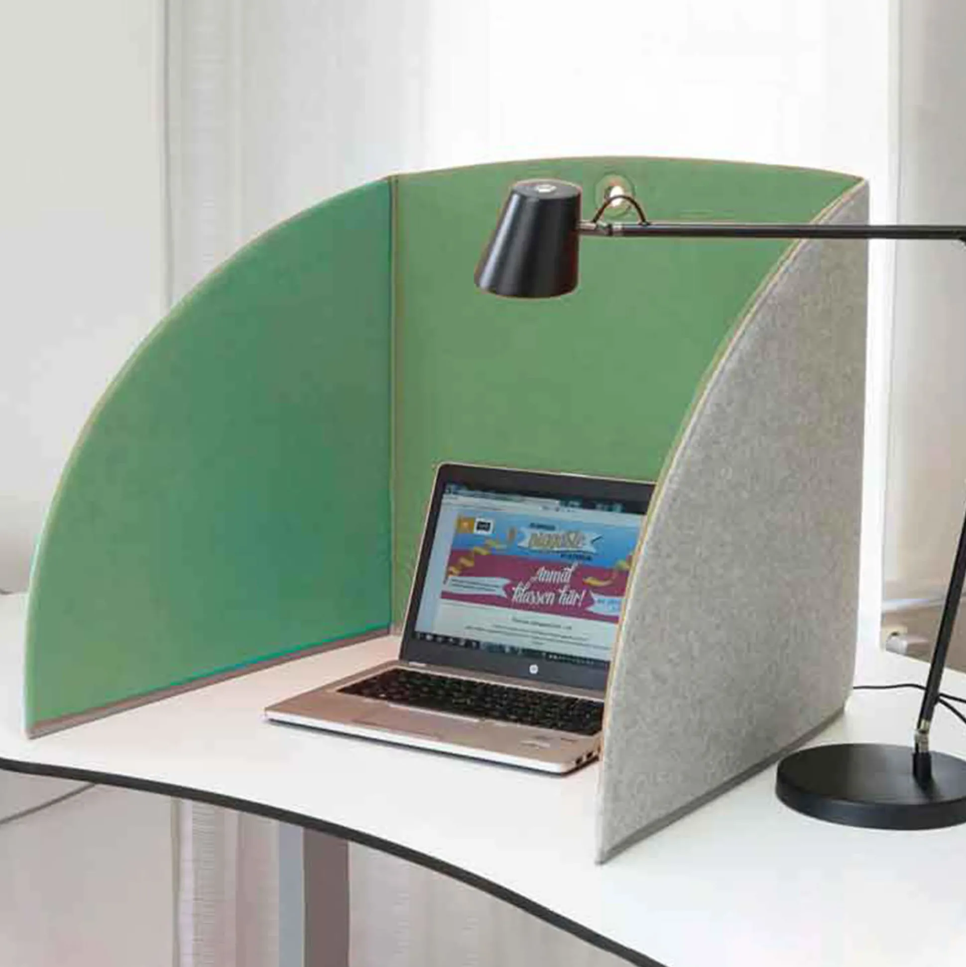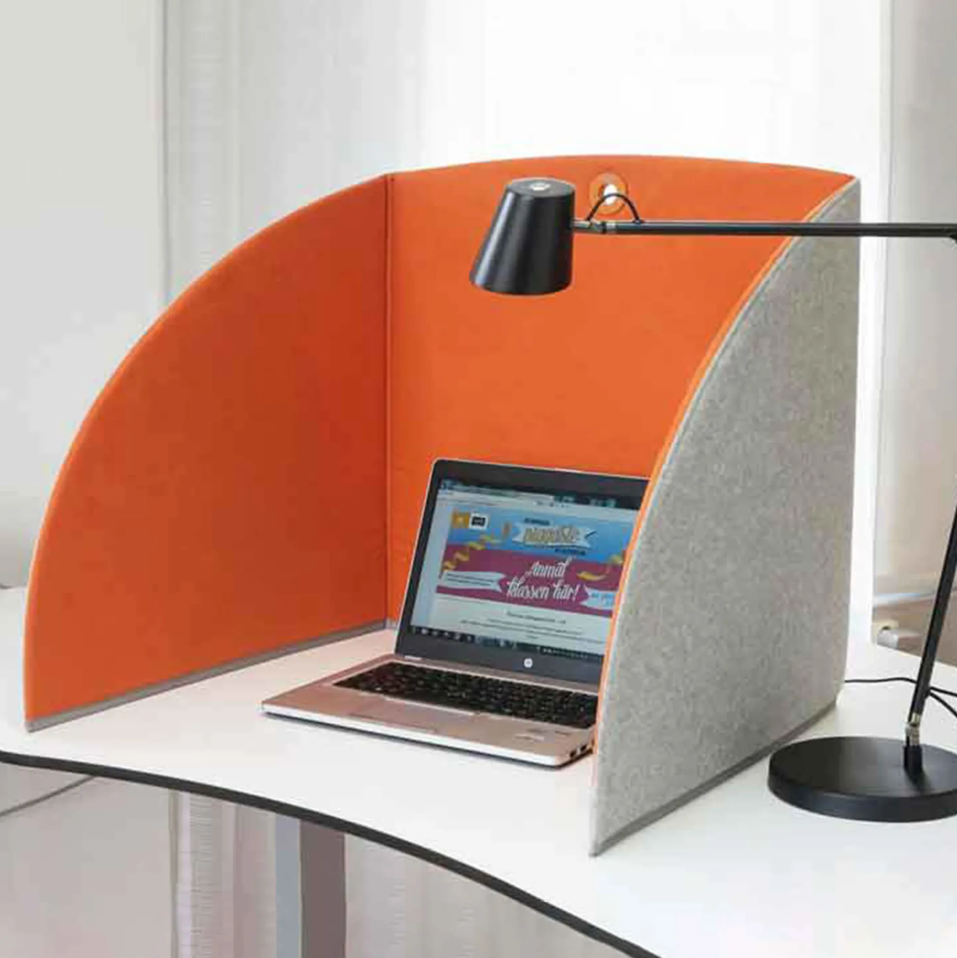 Stand up er en afskærmende og lyddæmpende bordskærm der er 58 cm. bred og fås i flere farver.