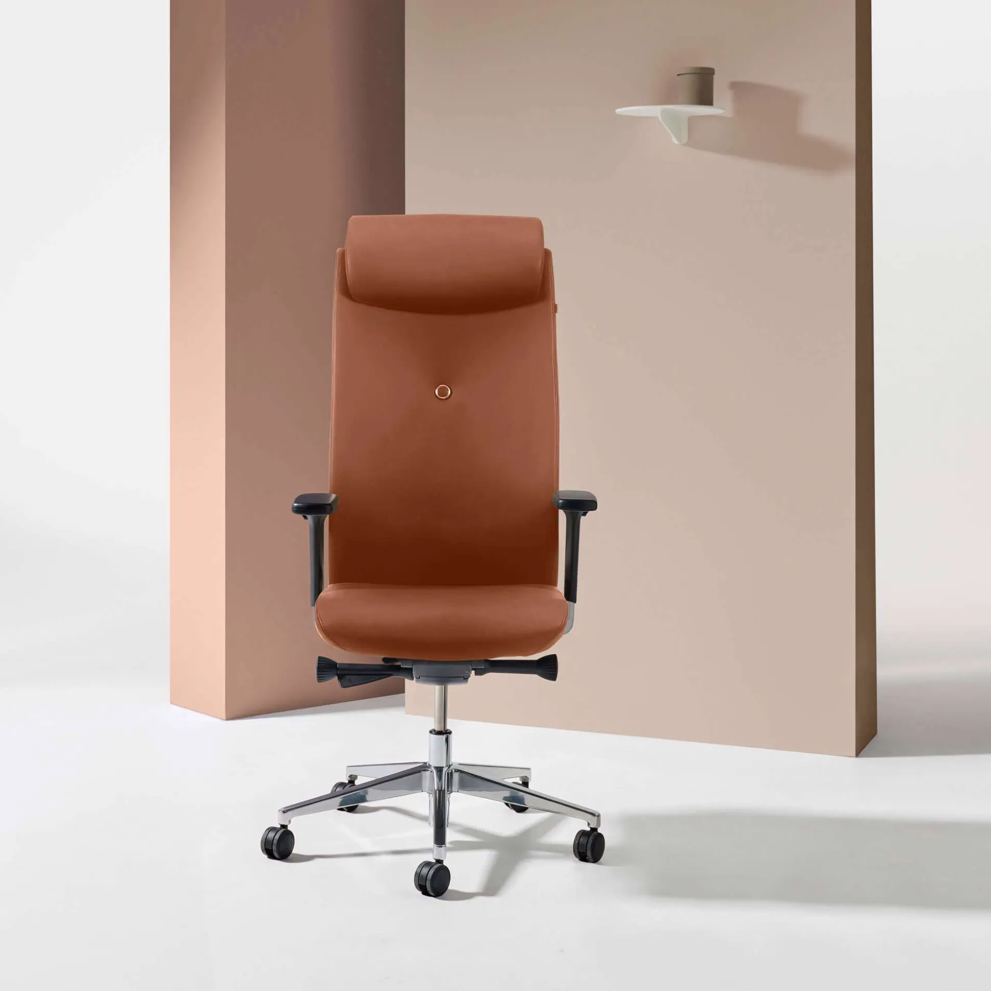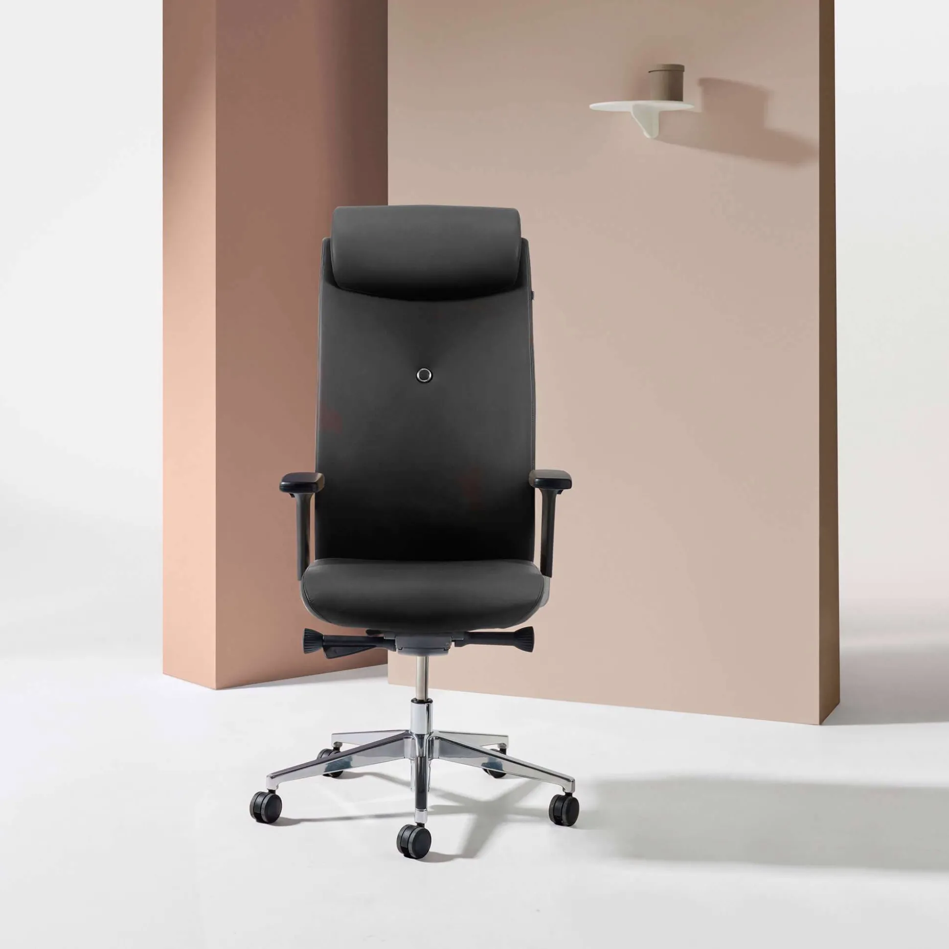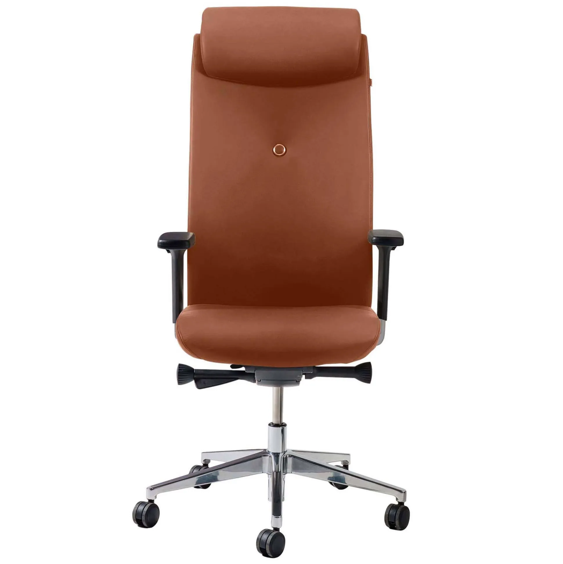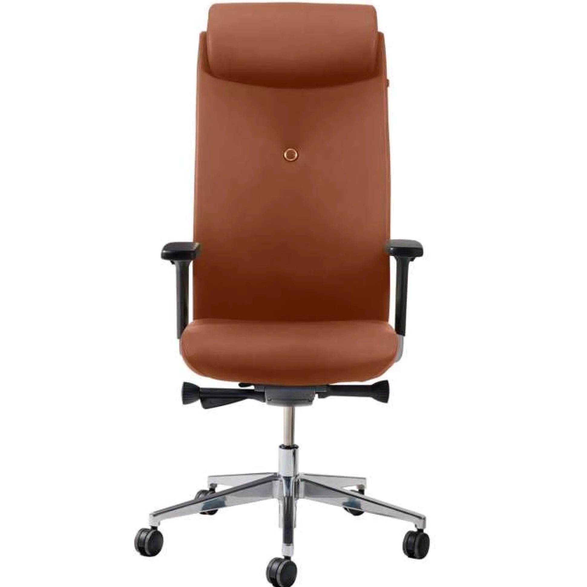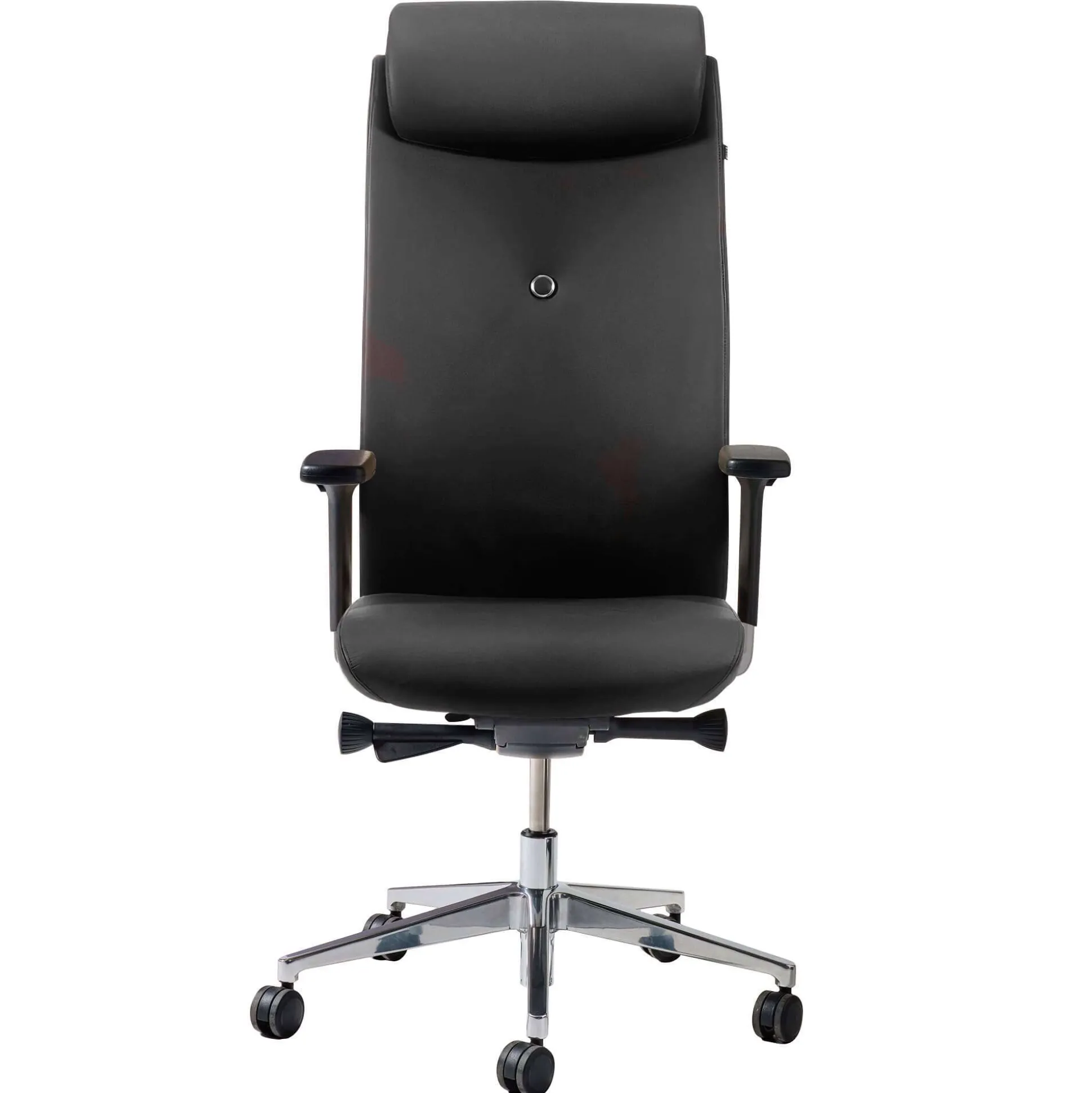 Stolen er inklusiv justerbare 4D armlæn; kan justeres i bredde, højde, dybde og vinkel. Desuden med justerbar nakkestøtte for bedst mulig komfort. Blankt fodkryds med hjul til hårde gulve samt fuldt betrukket med læder.
