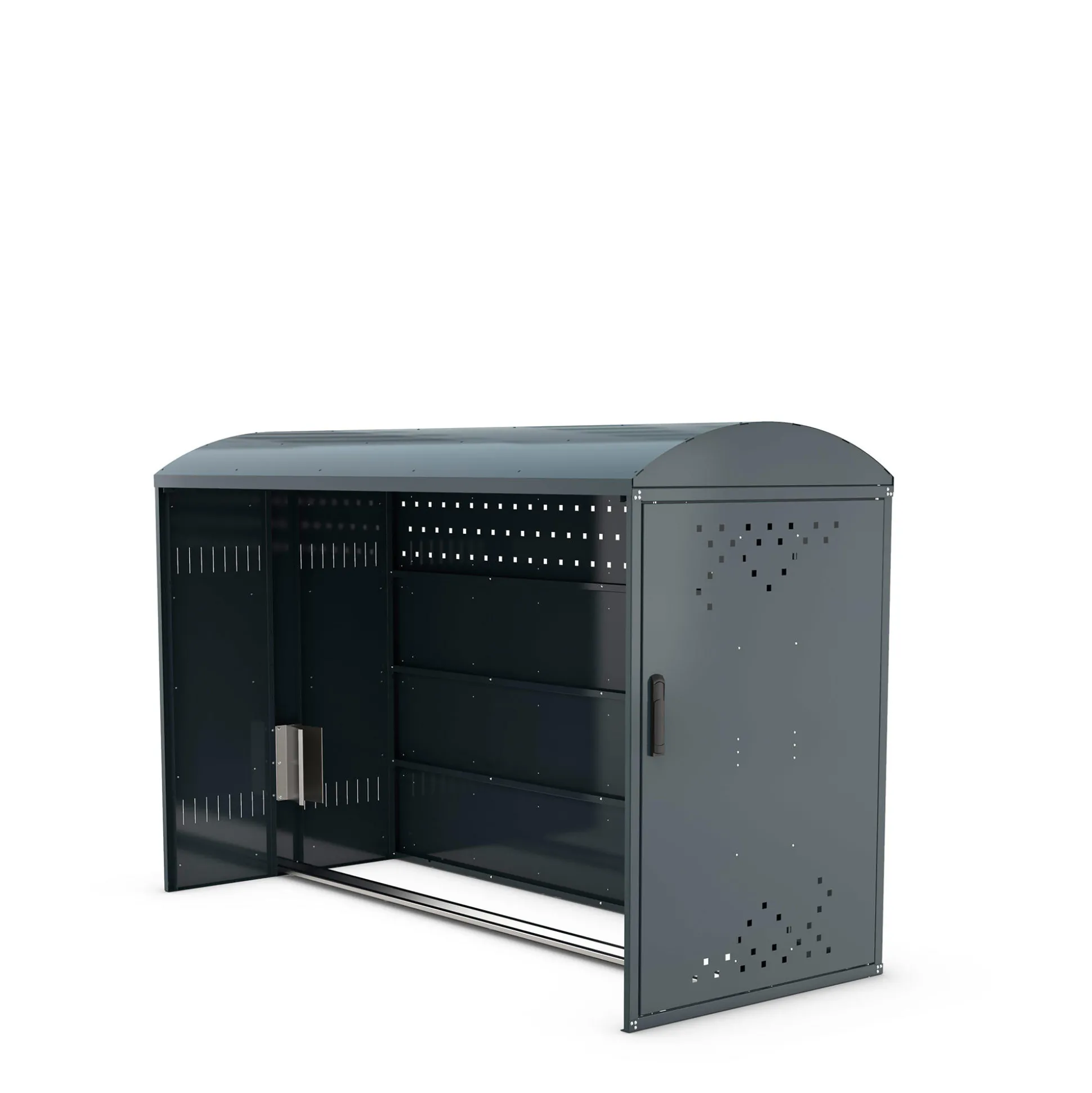 Cykelgaragen er bygget af en solid pladejernskonstruktion, der kan modstå hård brug. Den er designet til at beskytte cyklerne mod ydre påvirkninger og sikre holdbarheden i mange år frem.