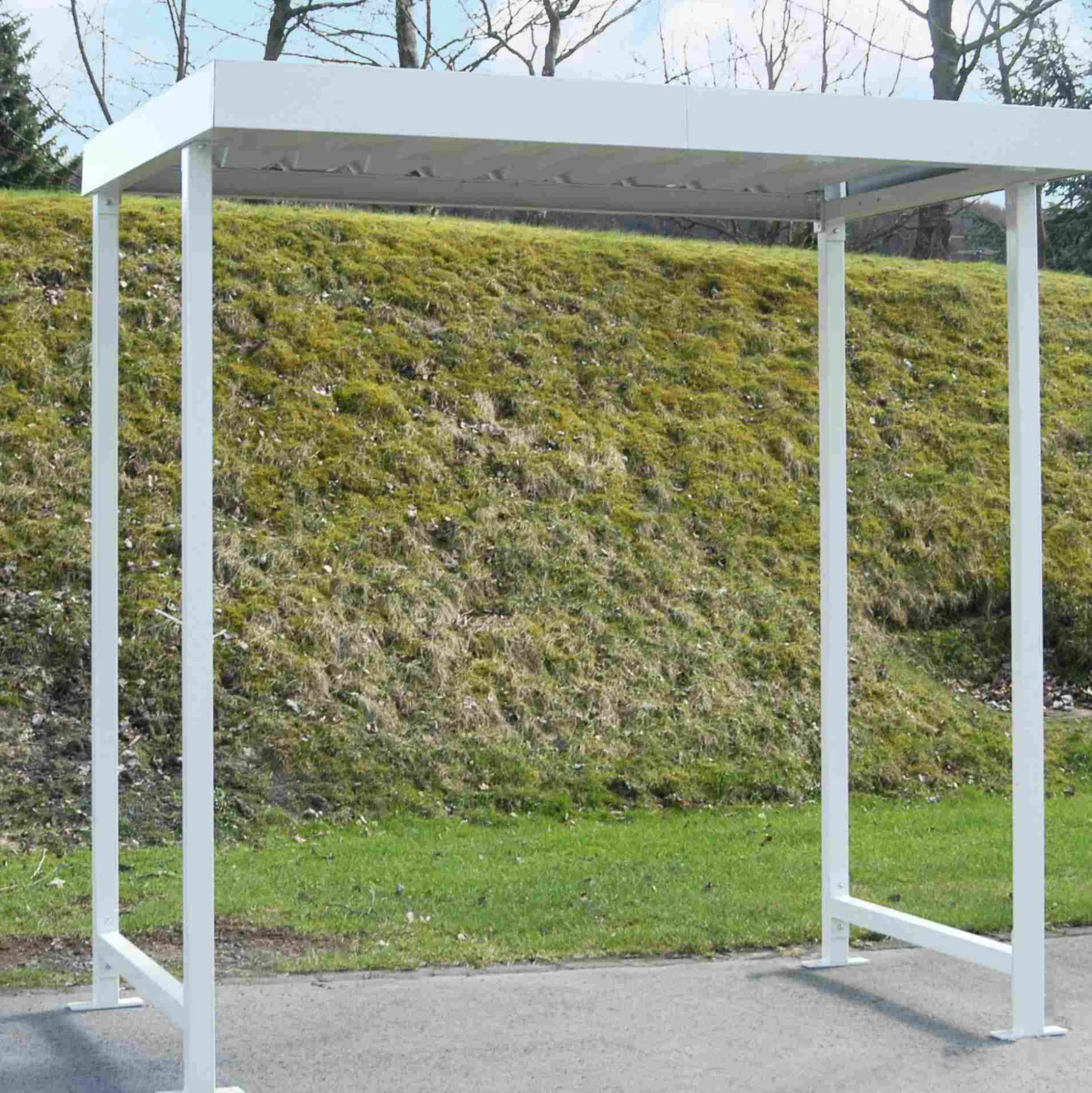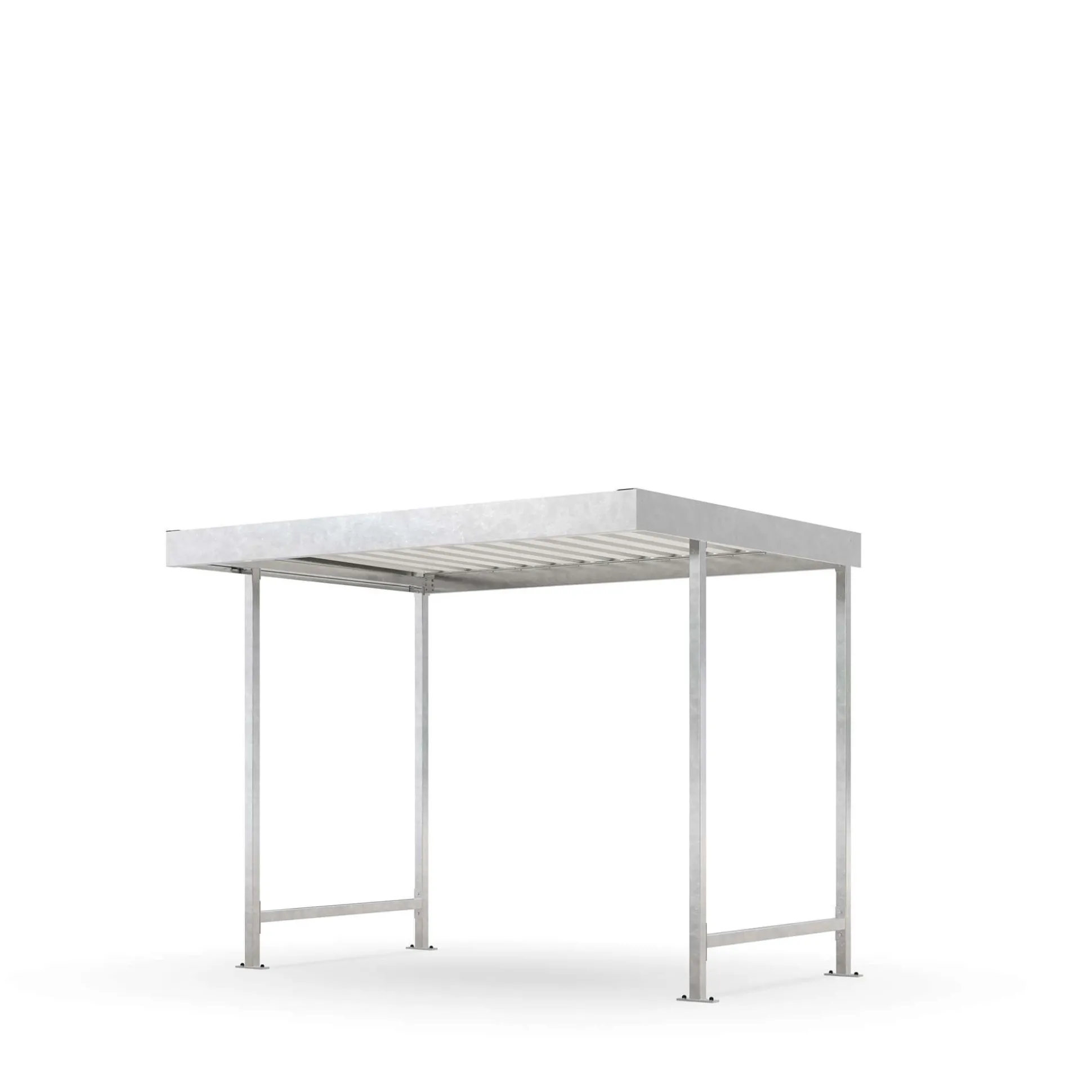 Flot og enkel overdækning til cykler udført i galvaniseret stål. Denne model er til montering på underlag af f.eks. Beton eller med Punktforankring