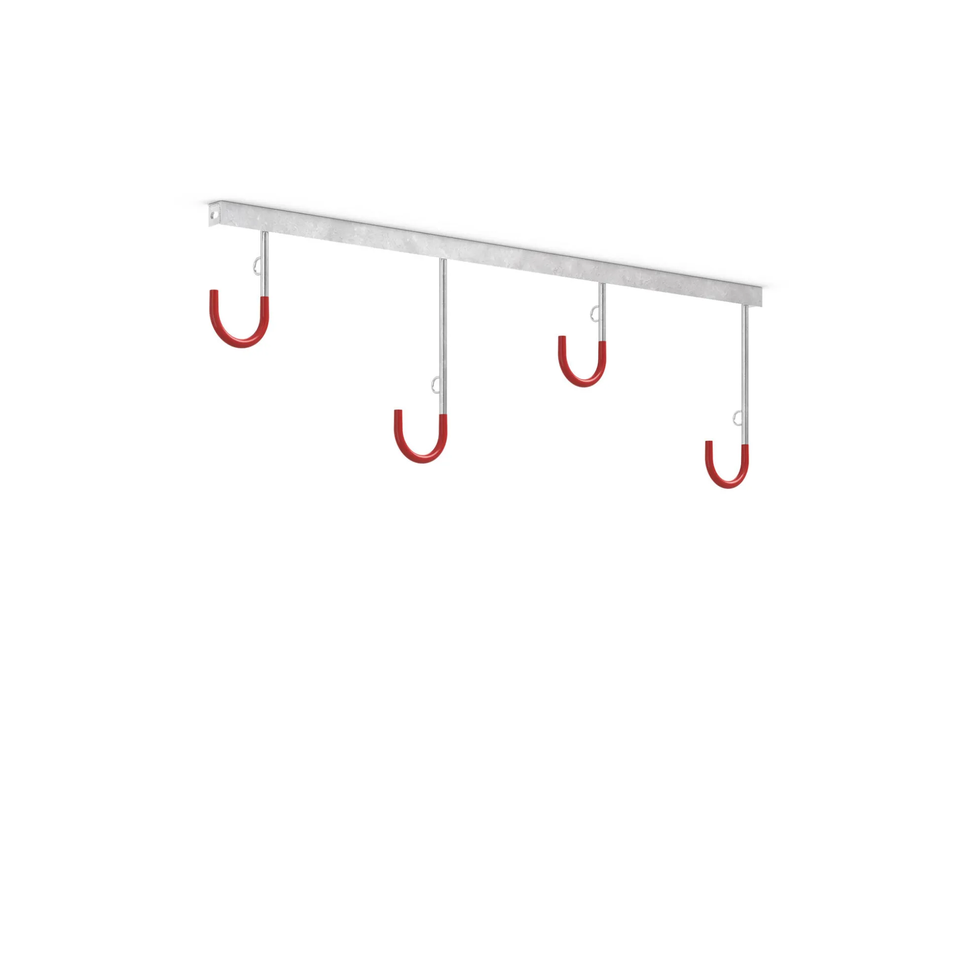 Smart cykelstativ med 4 kroge til loftmontering – perfekt hvis du ønsker at spare plads på gulvet. Hvis du har flere cykler, der skal parkeres, kan systemet udvides efter behov. Hver cykel kan sikkert låses fast til en integreret stålring, mens den signalrøde plastbelægning på ophængskrogen beskytter fælgen på cyklen.