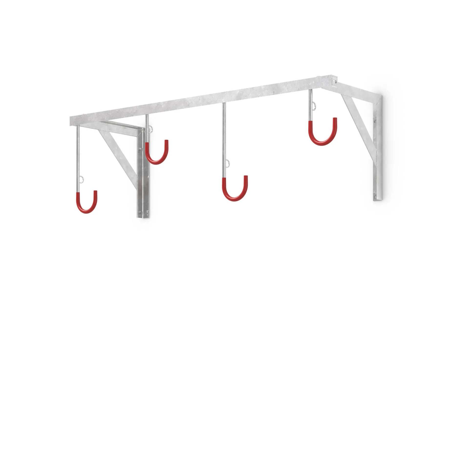 Cykelstativet har robuste ophængskroge med plastbelægning. Disse kroge er designet til at sikre, at cyklerne hænger sikkert og beskytter fælgen mod ridser eller skader.