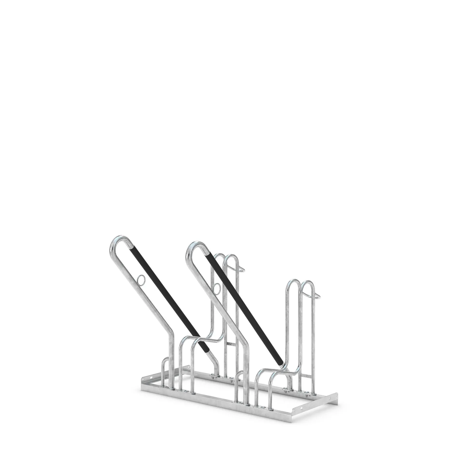 Dette fritstående cykelstativ har særligt sikre parkeringsbøjler i lodret format, stelstøtter med plastikbeklædning og stålringe for at beskytte selv de mest dyrebare cykler og elcykler mod skader og tyveri. Parkeringsbøjlerne med højdeforskel sparer plads, så cyklerne kan stå tættere. Fås både med parkering fra en eller to sider. Monteringsbeslag til gulvet inkluderet.