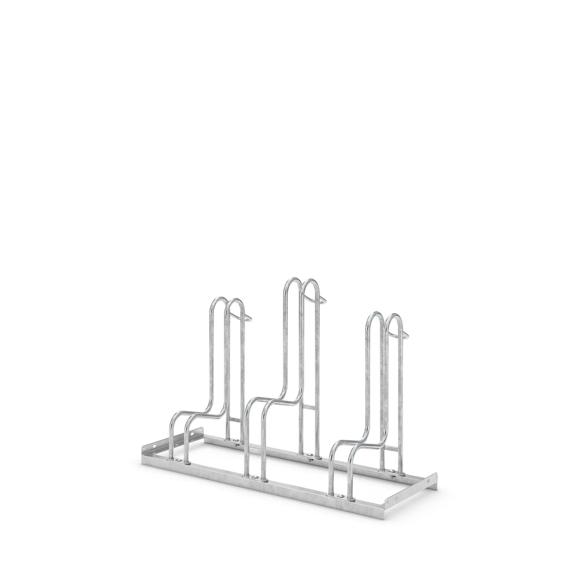 Moderne cykelstativ med 3 høje bøjler for ekstra stabilitet, der bl.a. velegner sig til mountainbikes. Cykler med op til 55 mm dækbrede kan parkere her komfortabelt, understøttet af de ekstra høje bøjler, hvor cykellåse også kan fastgøres. Værdifuld plads spares ved at parkere med forskudt højde eller ved at give adgang fra begge sider efter behov.