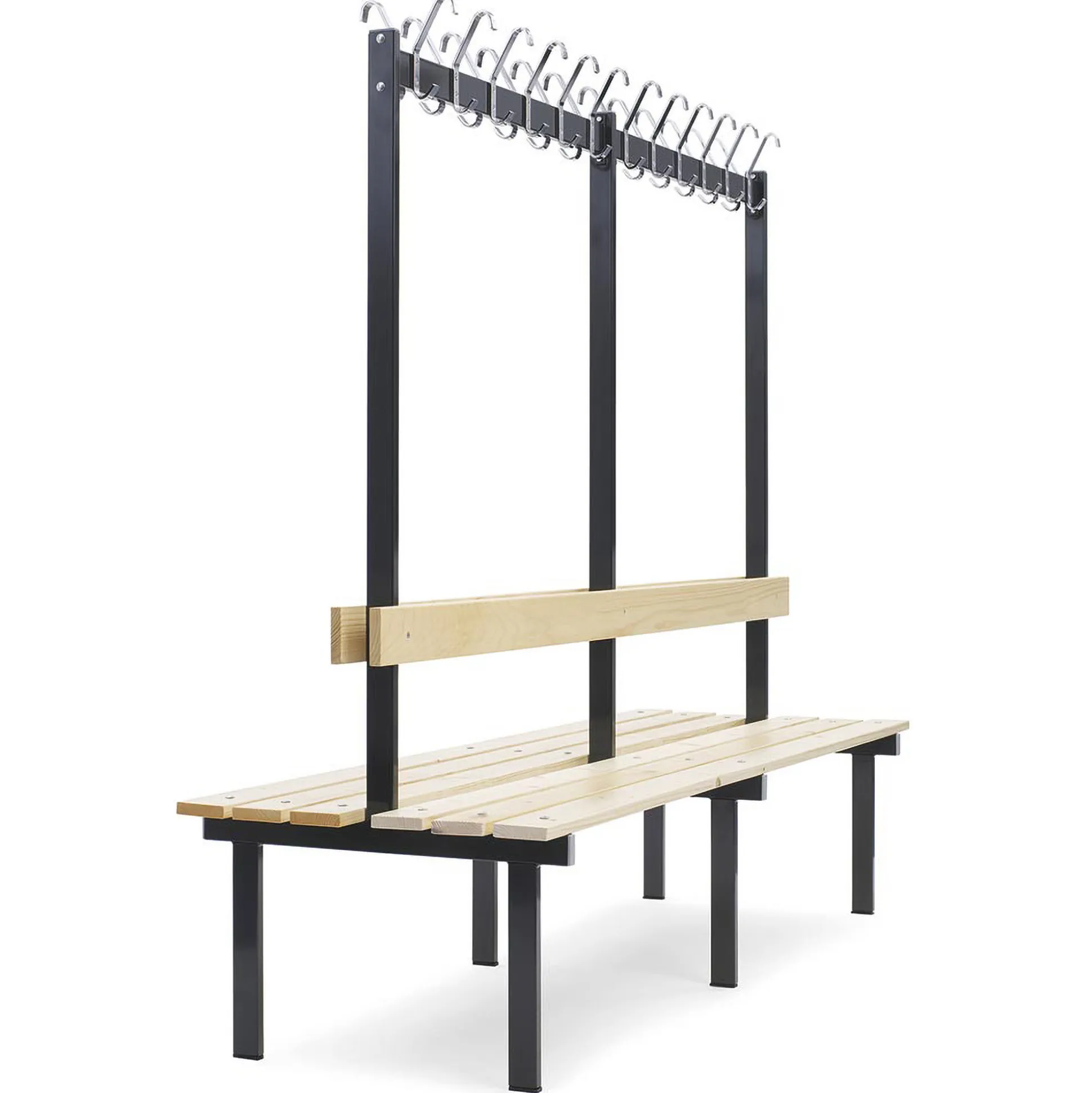 Dobbelt bænk med knagerække, bredde 200 cm. Sæde i lakeret fyrretræ og stel i sort.
