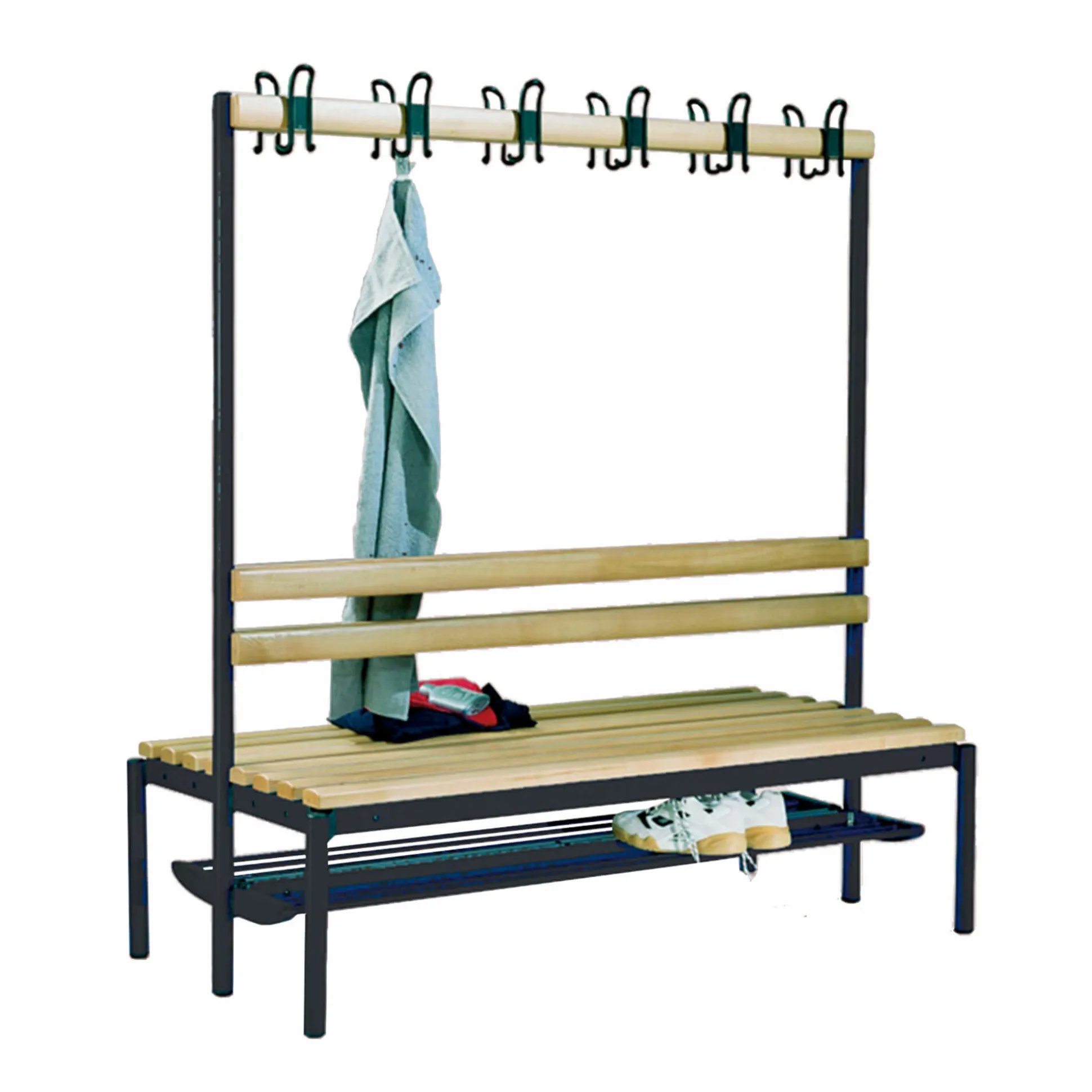 Bænken leveres som standard med bænksæder i hårdt træ, som er afrundet i toppen for god siddekomfort. Alle ben har stilleskruer, så bænken ikke står og vipper, trods underlaget. Standardfarve: sortgrå. Leveres samlet.