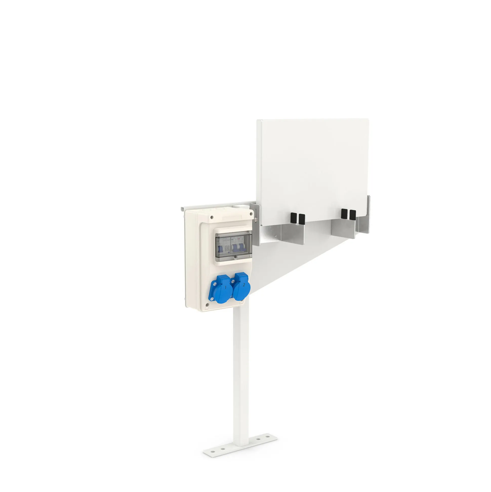 Opladningsstationen inkluderer en kraftfordelingsboks lavet af slagfast plast. Denne boks sikrer en sikker og pålidelig strømfordeling til opladerne og beskytter mod stød og skader.