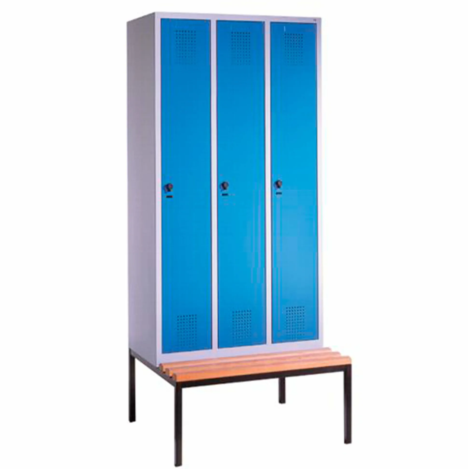 Omklædningsskab med bænk og 3 rum i et holdbart og svejst ståldesign. Døre er fremstillet af stål. God ventilation. Praktisk indretning + luksus inventar i døren. Større beskyttelse mod indbrud takket være ekstremt warp-resistente døre. Højrevendte døre, med pivot hængsler. Nemt at rengøre. Hulmønster og mulighed for nummerering. Praktisk dørstop-lyddæmpere, der sikrer støjfrit miljø. Hattehylde med robust knagerække, 3 glide kroge. Ergonomisk dreje håndtag og beslag for hængelås.