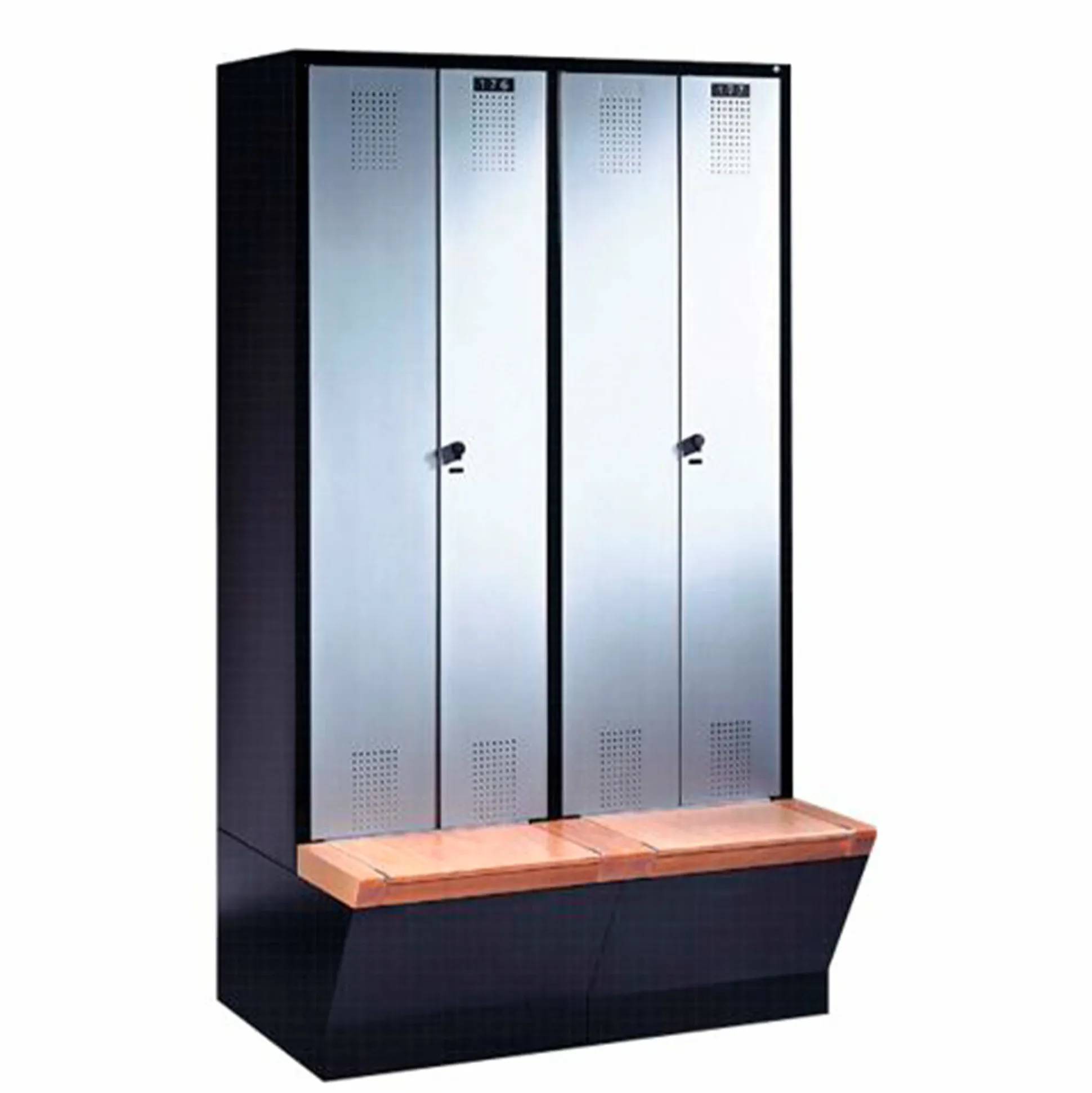 Omklædningsskab med opbevaring i bænk og 2 dobbelte rum i et holdbart og svejst ståldesign. Døre er fremstillet af stål. God ventilation. Praktisk indretning. Større beskyttelse mod indbrud takket være ekstremt warp-resistente døre. Døre som lukker på midten, med pivot hængsler. Nemt at rengøre. Hulmønster og mulighed for nummerering. Praktisk dørstop-lyddæmpere, der sikrer støjfrit miljø. Hattehylde med robust knagerække, 3 glidekroge. Ergonomisk drejehåndtag og beslag for hængelås