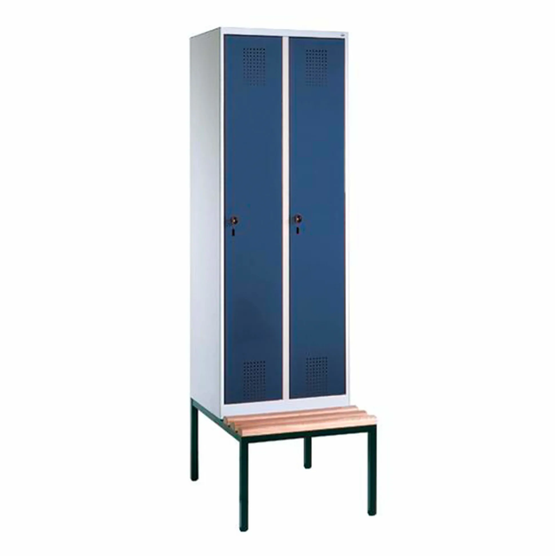 Omklædningsskab med bænk og 2 rum i et holdbart og svejst ståldesign. Døre er fremstillet af stål. God ventilation. Praktisk indretning. Større beskyttelse mod indbrud takket være ekstremt warp-resistente døre. Højrevendte døre, med pivot hængsler. Nemt at rengøre. Hulmønster og mulighed for nummerering. Praktisk dørstop-lyddæmpere, der sikrer støjfrit miljø. Hattehylde med robust knagerække, 3 glide kroge. Ergonomisk dreje håndtag og beslag for hængelås.