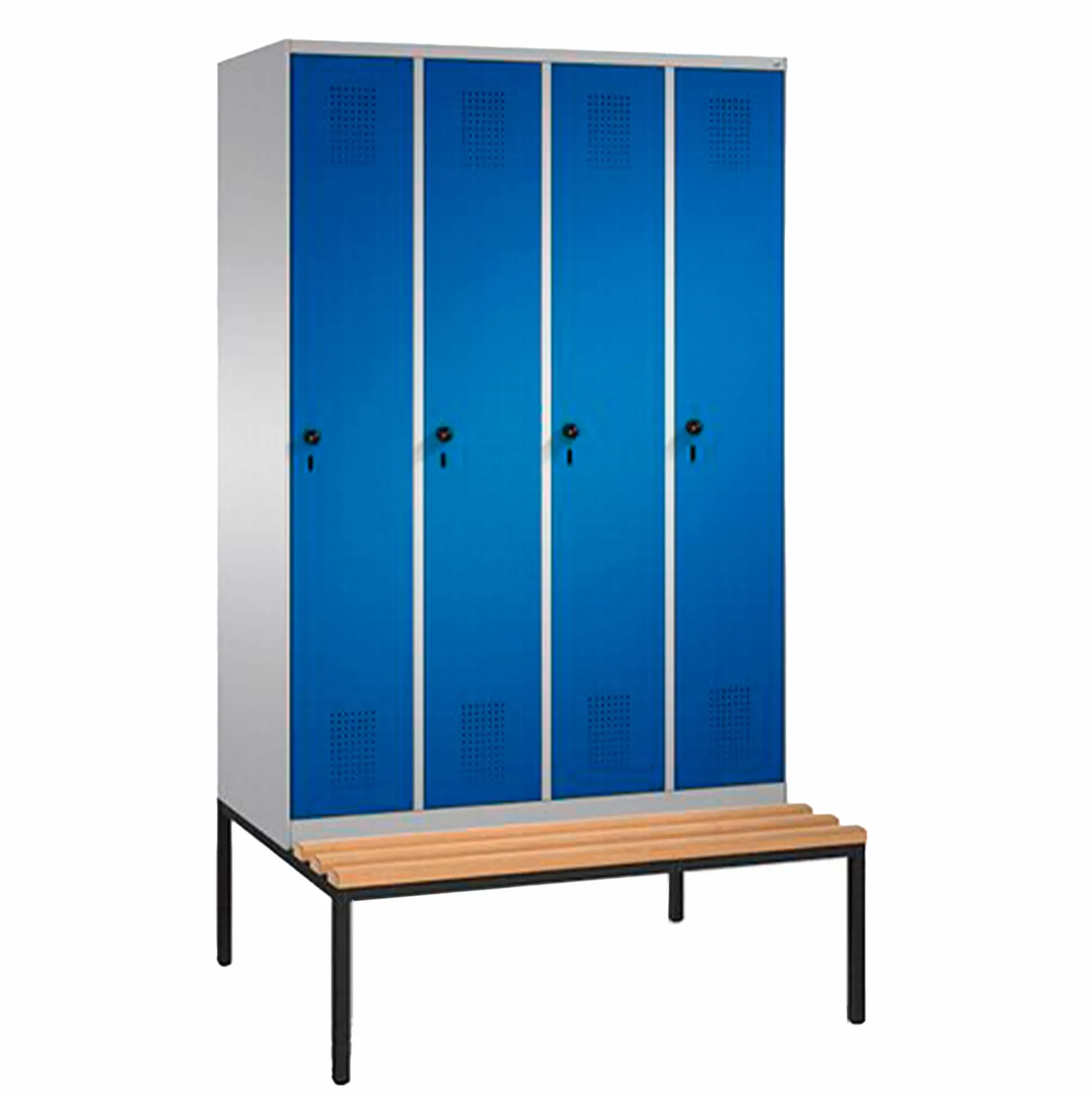 Evolo Omklædningsskab med bænk og 4 rum. Bænken flugter skabets bund. Lysmål: 160x23x46,5. Bænkens dybde: 31,5 cm. Én hylde og bøjlestang med 3 kroge. Korpus i ral 7035 og låger i ral 5012