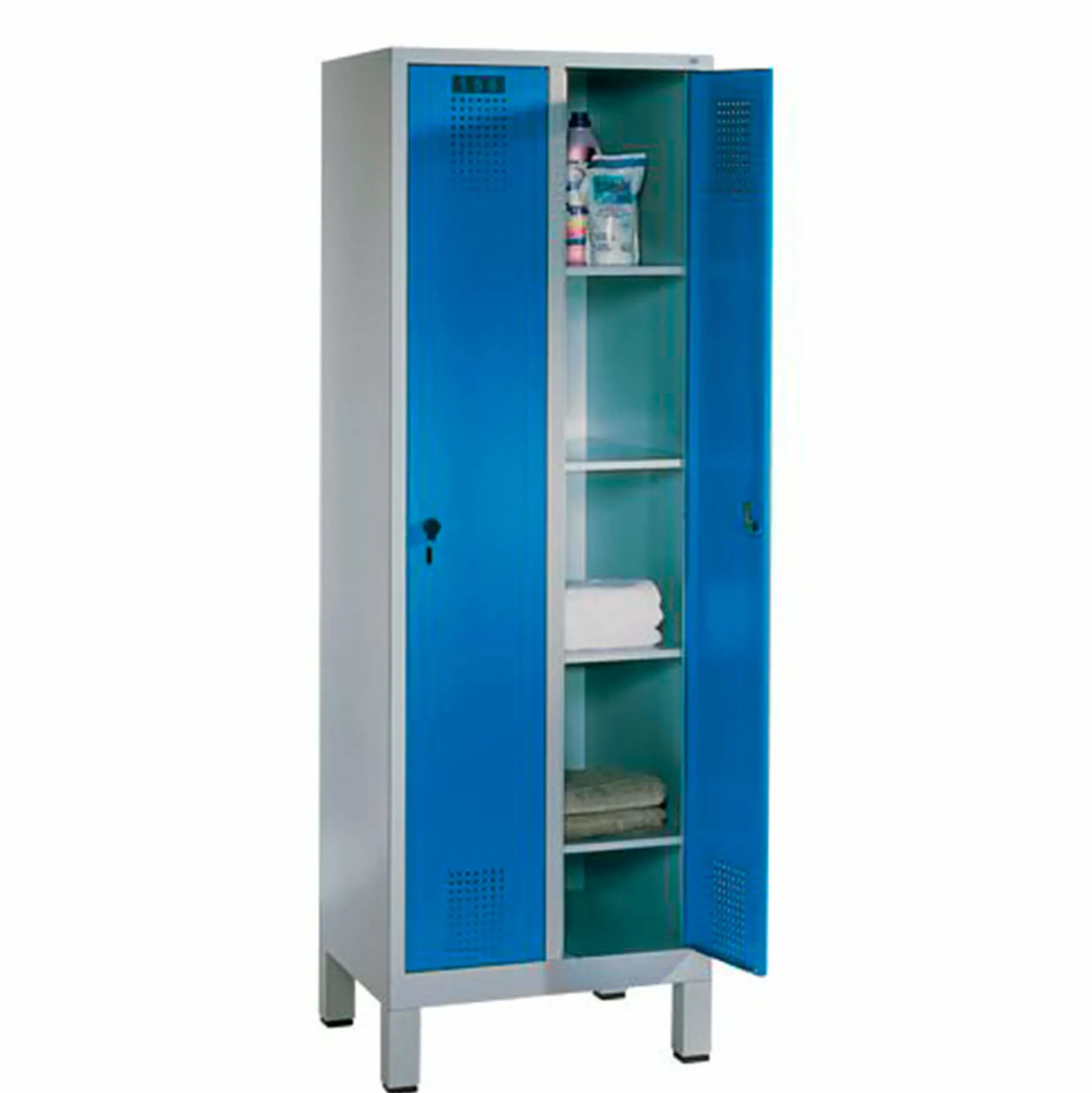 Opbevaringsskab med blå låger. Med 2 rum. Indhold: 10 faste hylder. Svejset og solidt. Dørgreb med mulighed for at isætte hængelås.