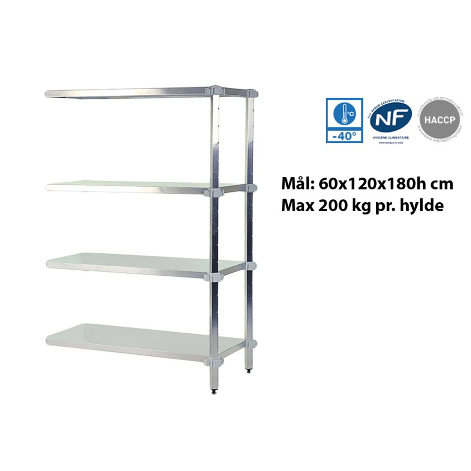 Reolen er velegnet til brug i køle- og frostrum helt ned til -40 °C. Den er fremstillet i rustfrit stål af typen AISI 304 og er godkendt i henhold til både HACCP og NF-standarder, hvilket gør den egnet til professionelle fødevaremiljøer.