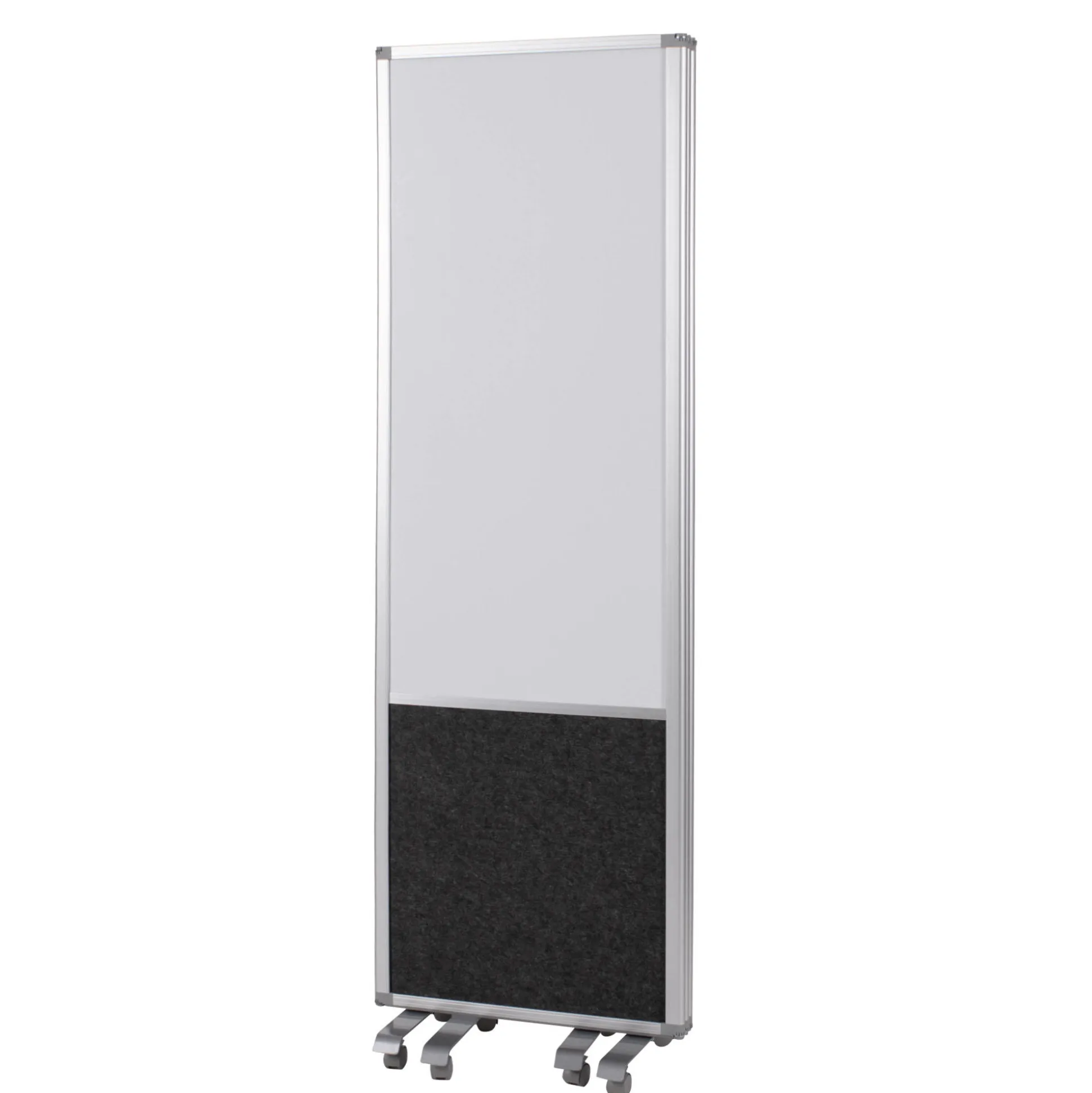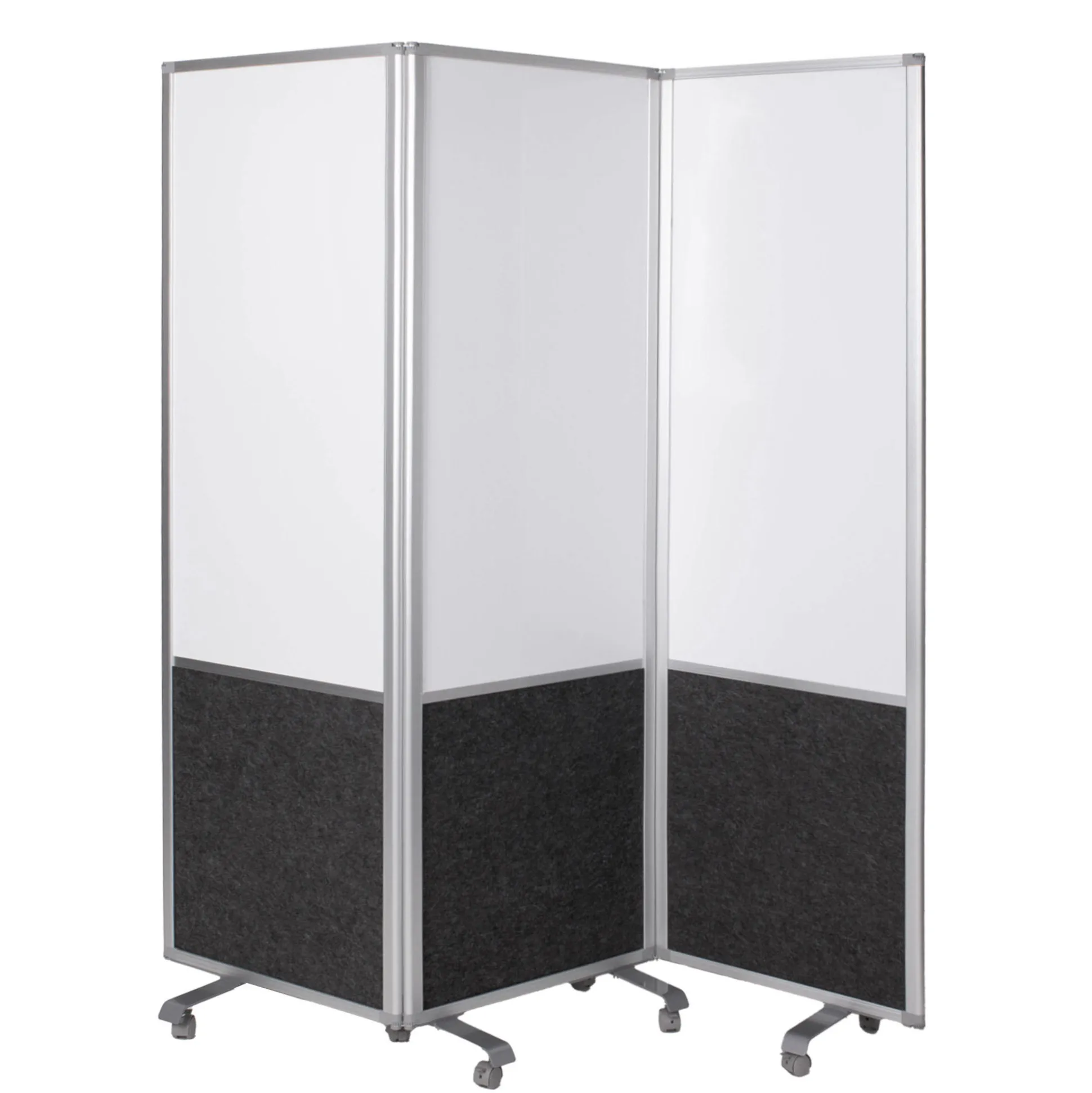 Smart mobil foldeskærm på hjul bestående af 3 fag med alu ramme, indbygget whiteboard tavle på begge sider og en samlet størrelse på 180x180h cm. Foldeskærmen har lydabsorberende egenskaber med en 8 mm sort PET kerne, og vil derfor både afskærme og forbedre akustikken, samtidig med at du kan skrive på den magnetiske overflade.