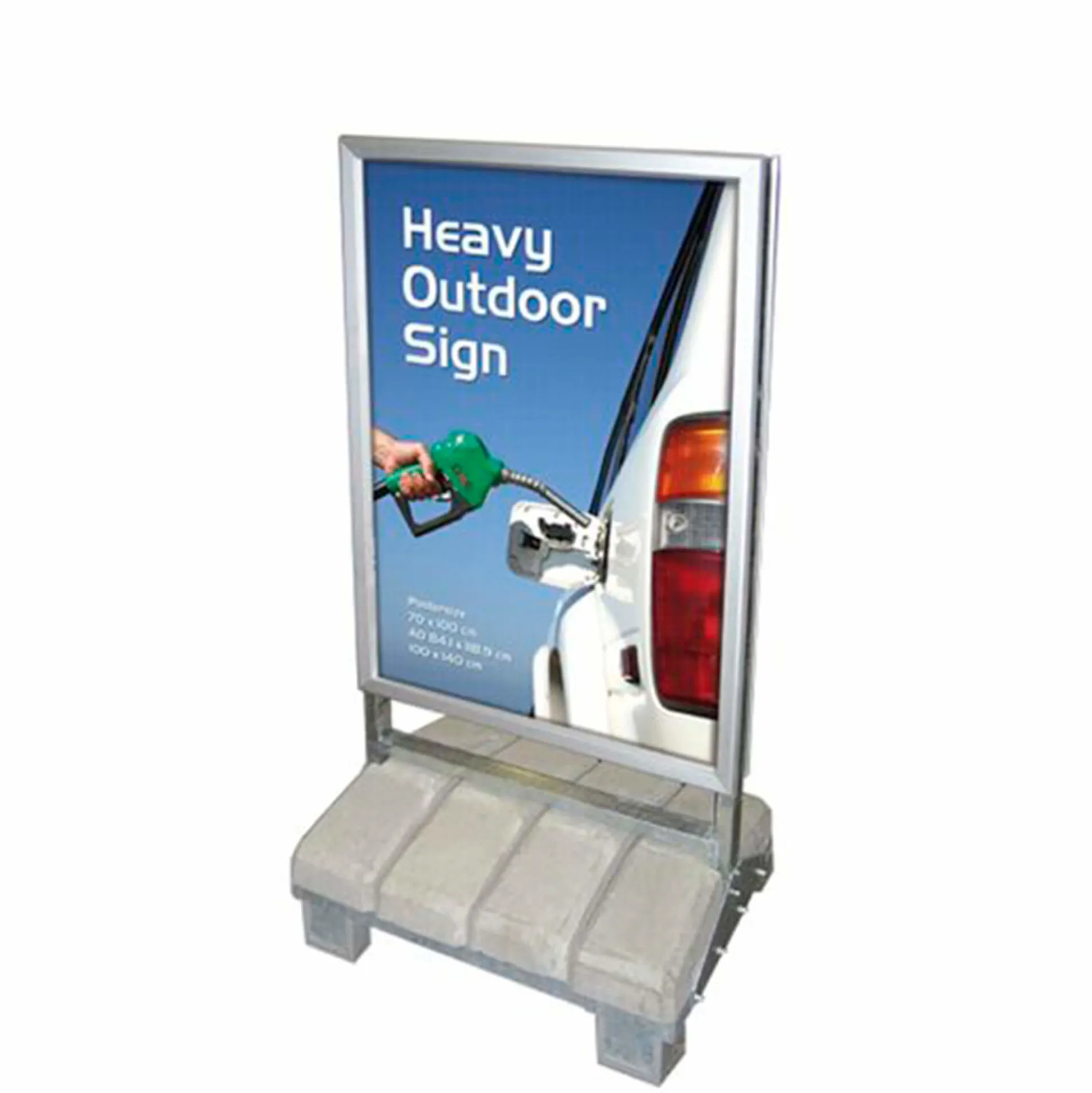 Heavy Outdoor skilt – Beton 100% stormsikkert skilt i kraftig udførelse i galvaniseret stål og fod med betonmoduler, som kan fjernes én for én, ved afmontering af hele topsektionen, som også sikrer, at betonmodulerne ikke kan bruges til hærværk. Foden er udstyret med 4 ben, der gør at skiltet let kan flyttes rundt ved hjælp af en palle- løfter eller lign. Securityramme med 42 mm alu- profiler på begge sider – plakaterne er dermed sikret, men skiftes let og hurtigt ved hjælp af nøgleværktøjet, som medfølger. Logoplade kan købes som tilbehør og monteres hurtigt og enkelt. Vægt: 232 kg.