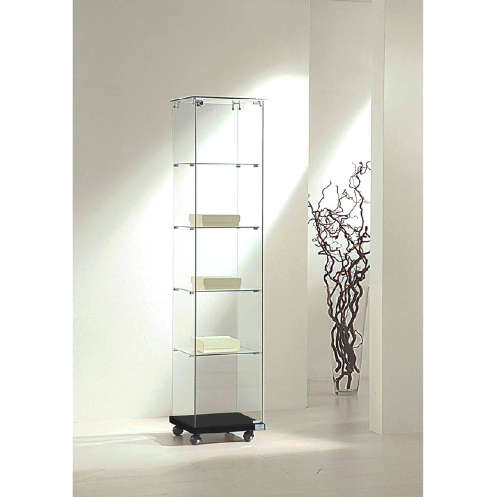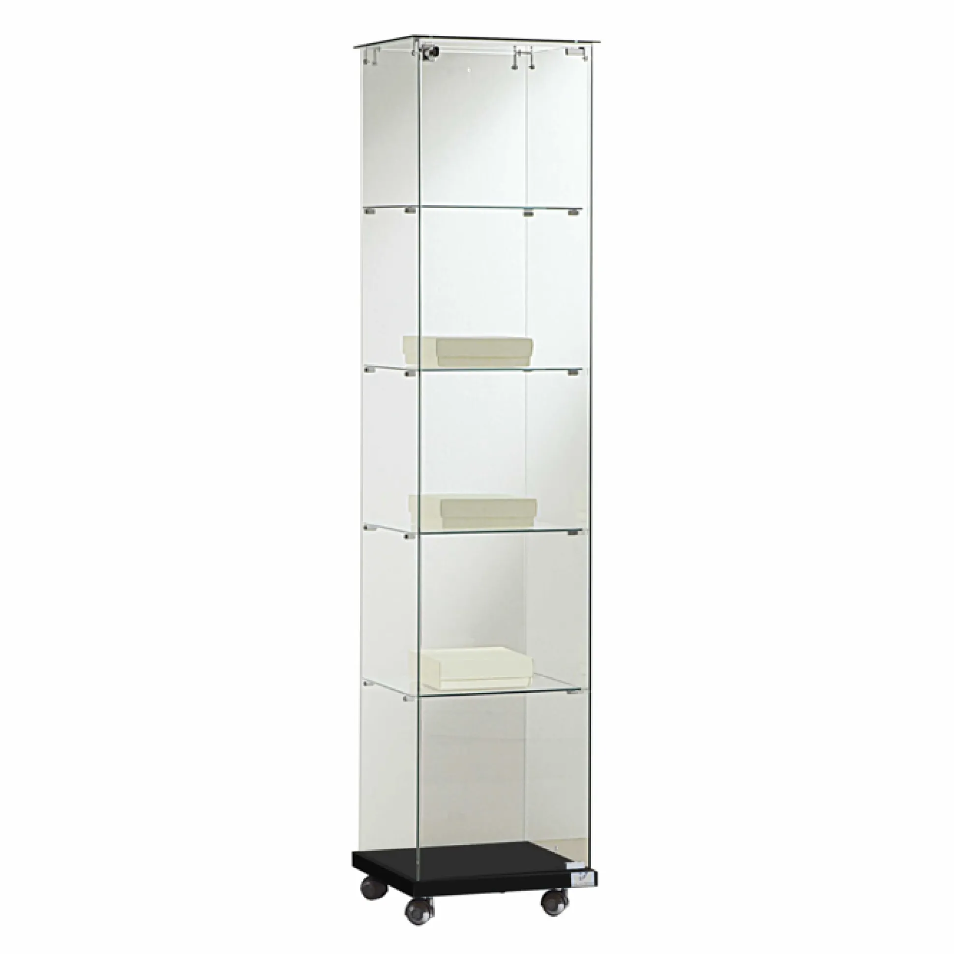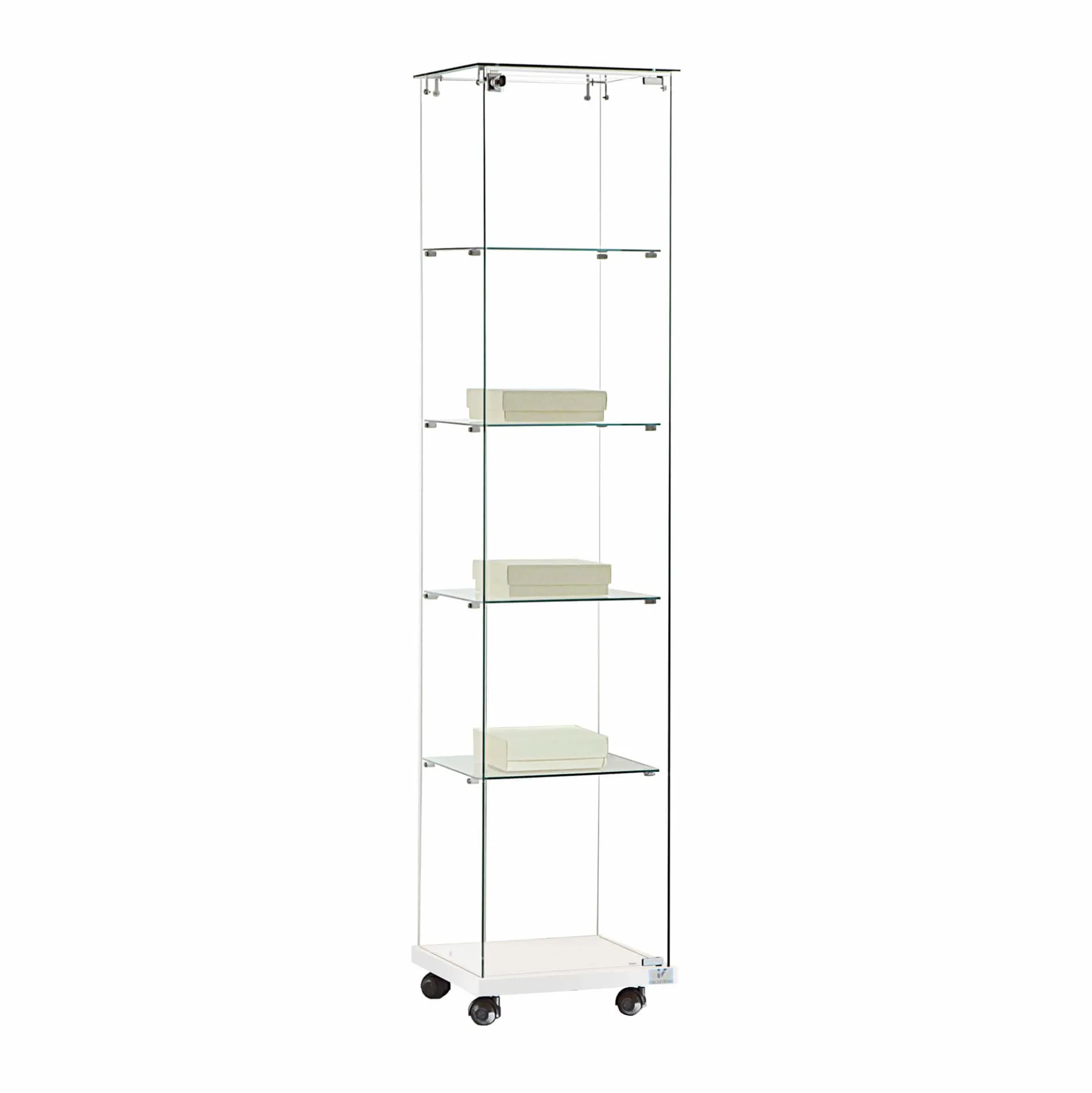 Denne smalle vitrine er en del af serien af glasvitriner, som består af smalle og bredde vitriner med og uden lys, de er med hvid bundhylde med hjul. De er til hurtig levering. Se dem alle her.