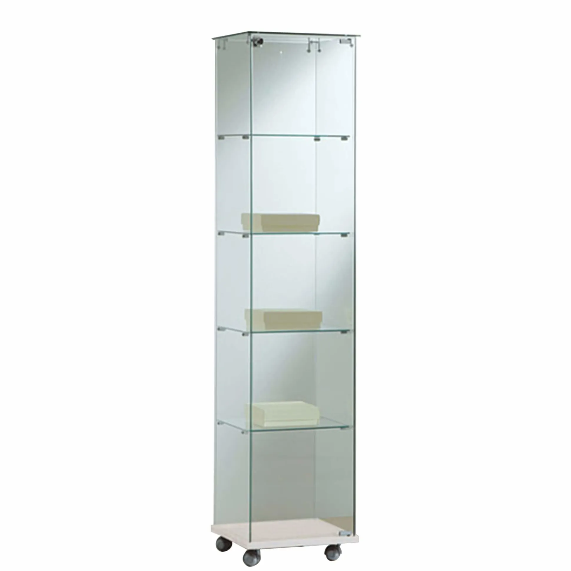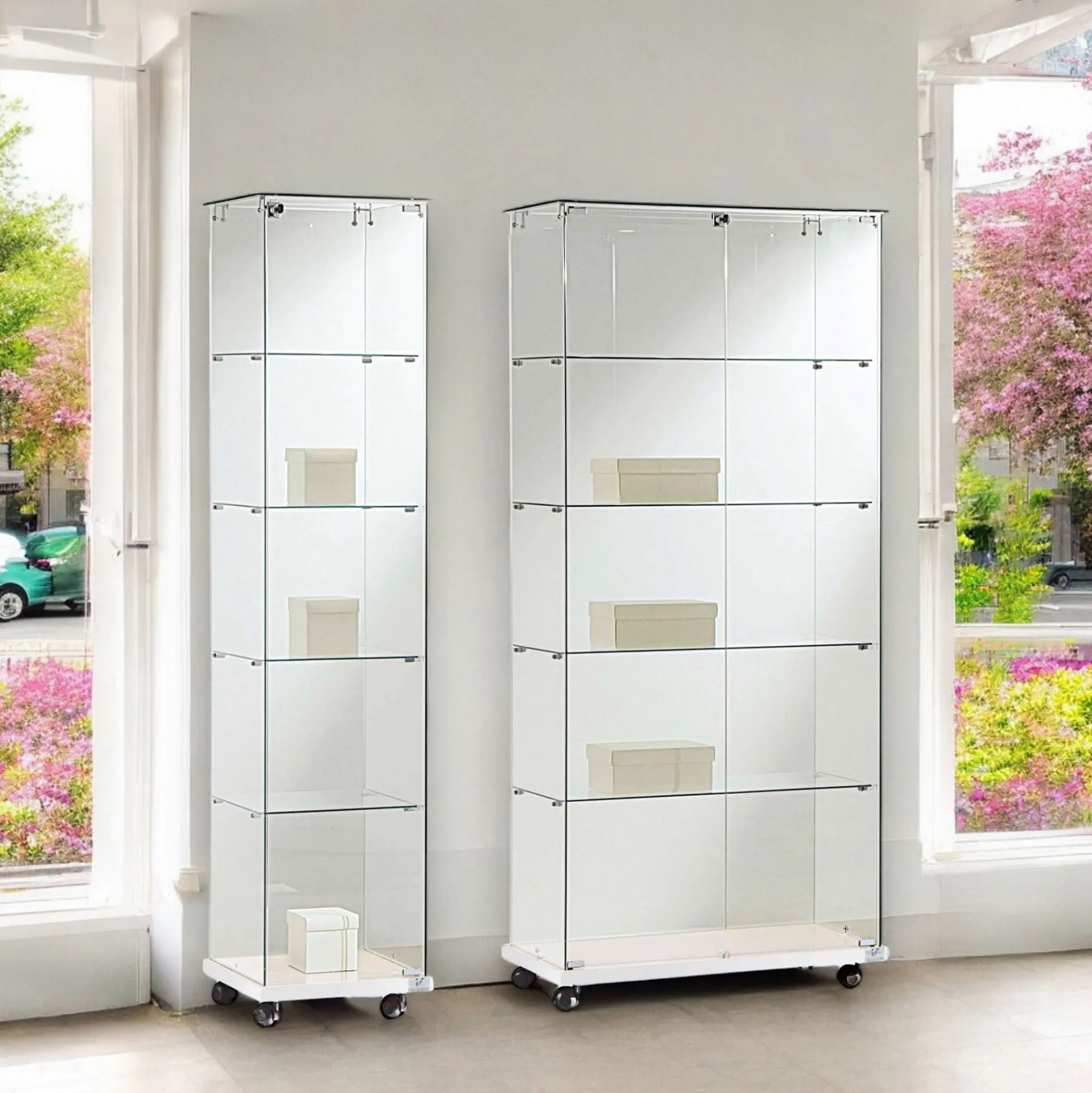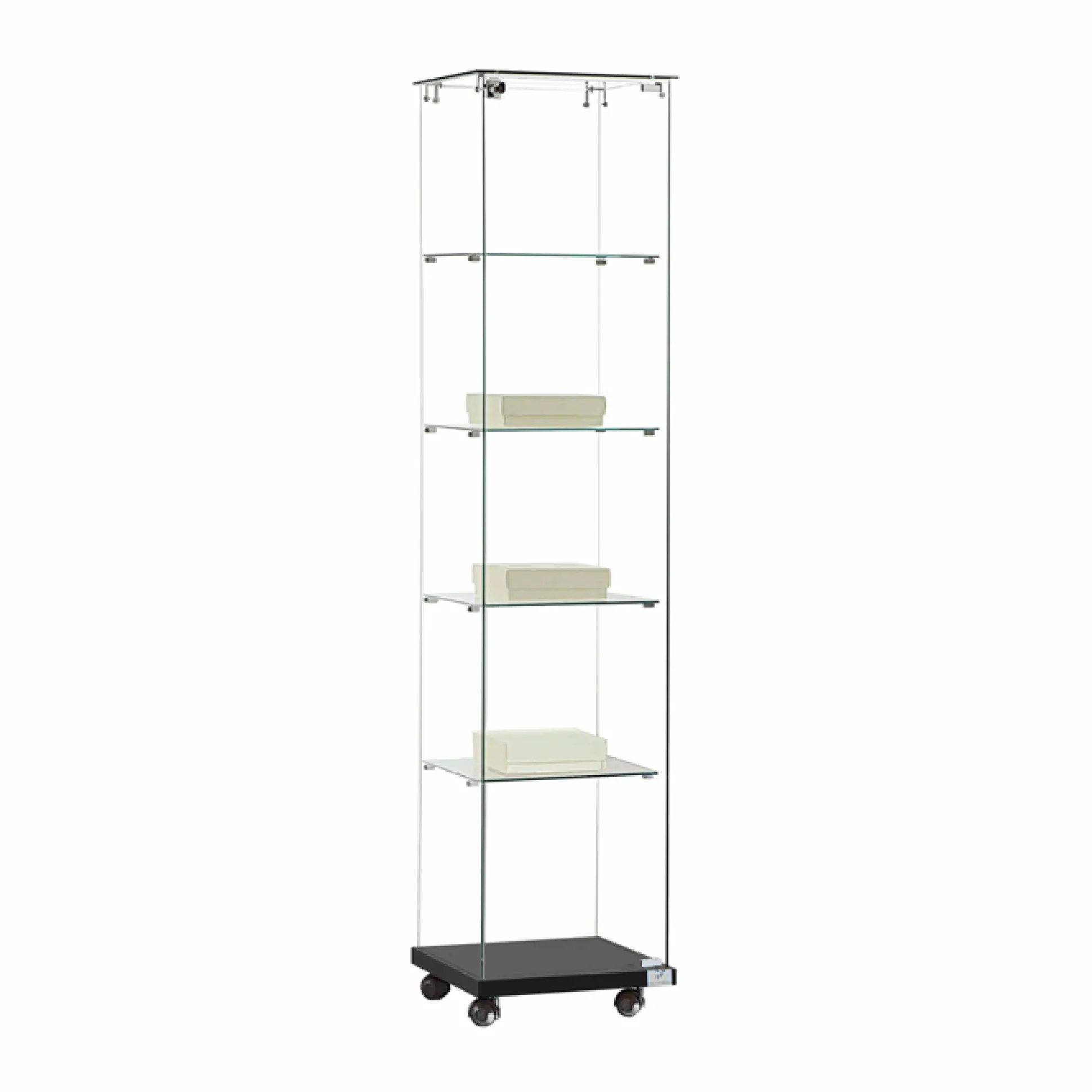 Denne smalle vitrine er en del af serien af glasvitriner, som består af smalle og bredde vitriner med og uden lys, de er med hvid bundhylde med hjul. De er til hurtig levering. Se dem alle her.